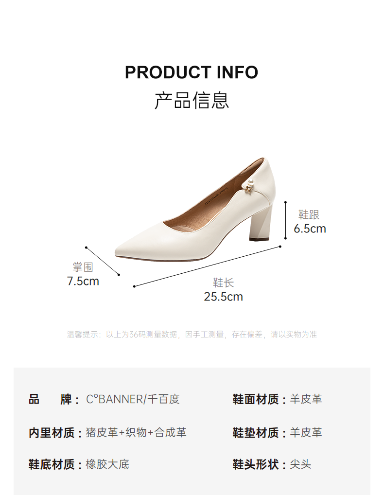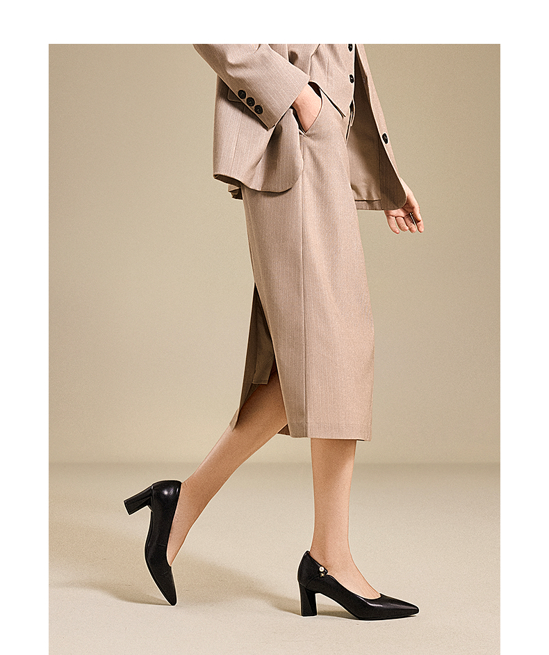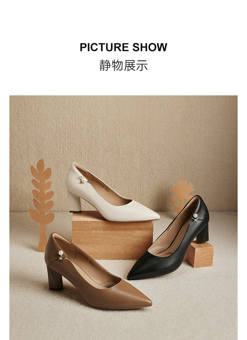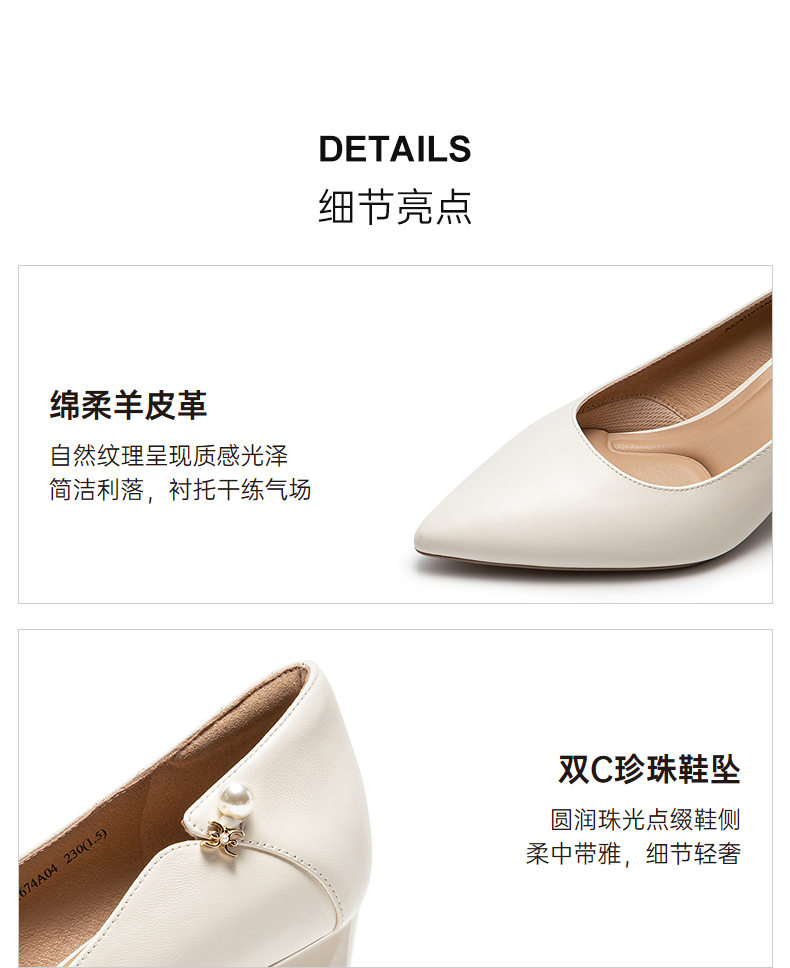 千百度羊皮粗高跟鞋女通勤尖头正装气质法式浅口单鞋A25471674
