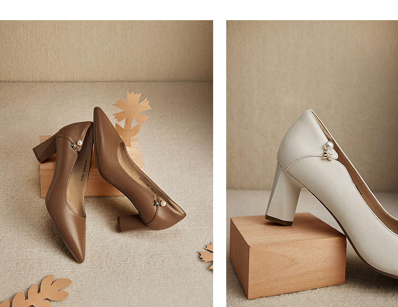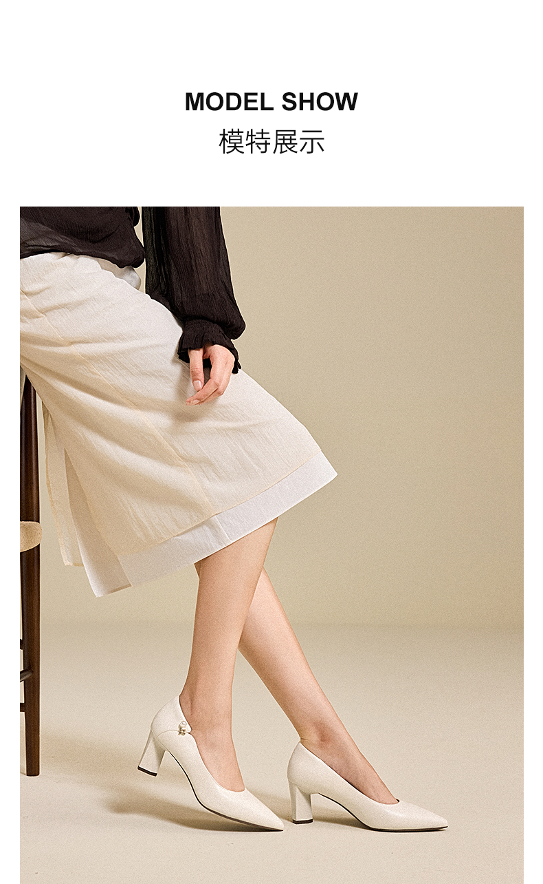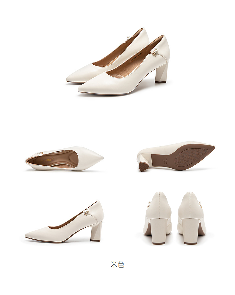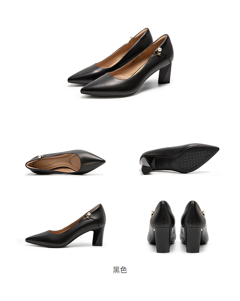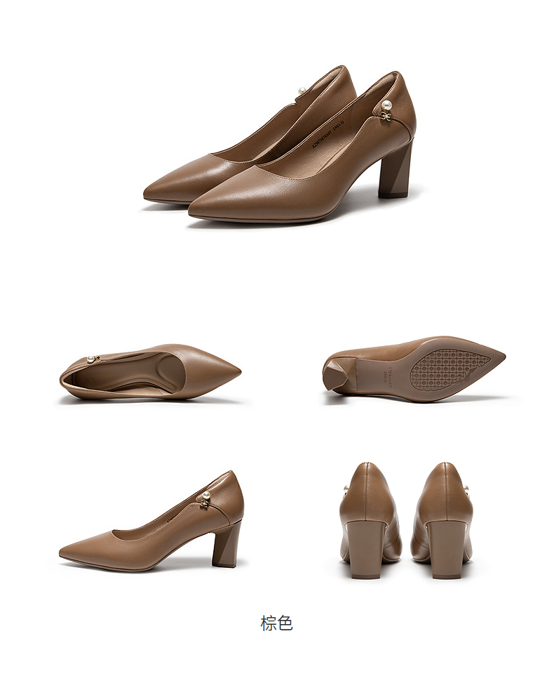 千百度羊皮粗高跟鞋女通勤尖头正装气质法式浅口单鞋A25471674