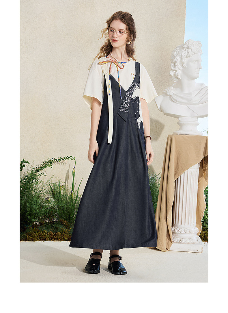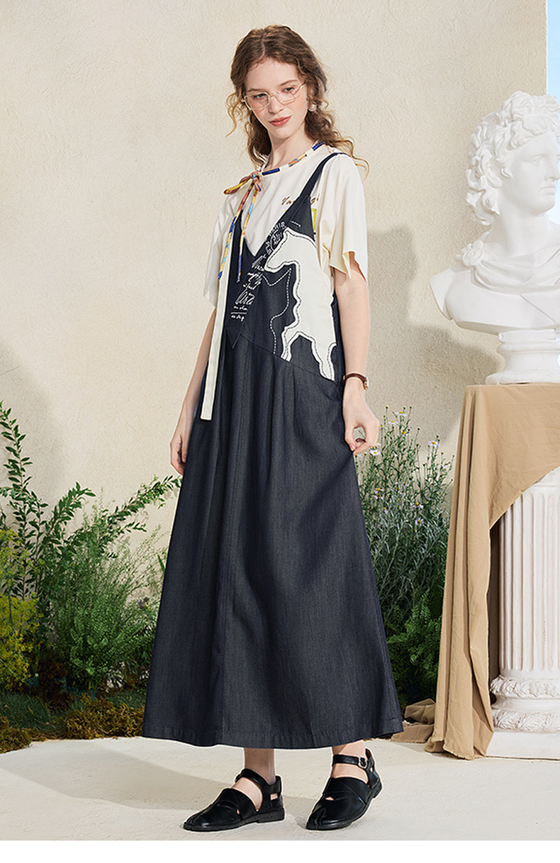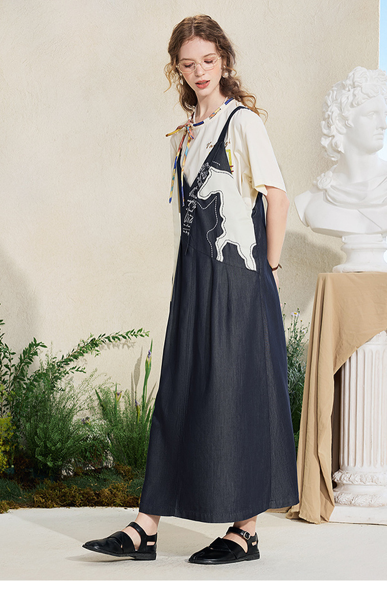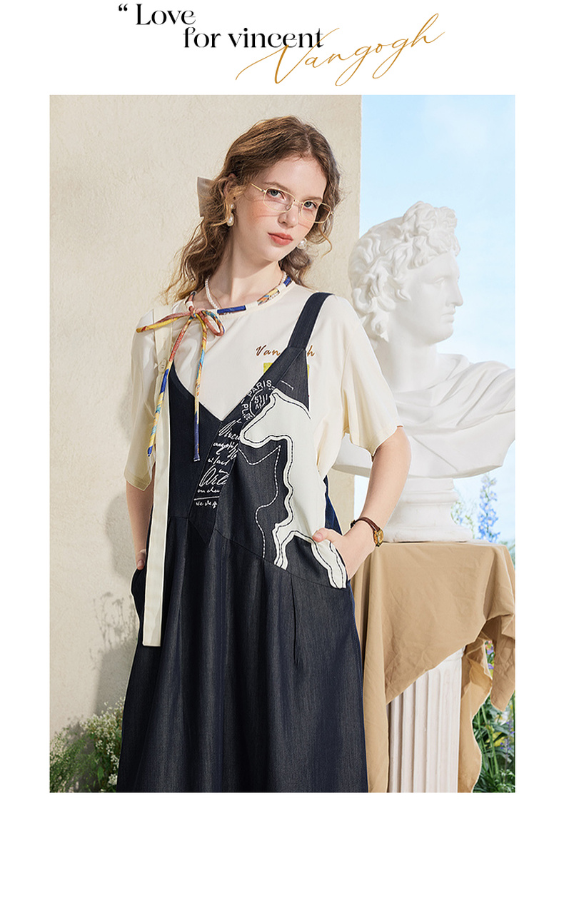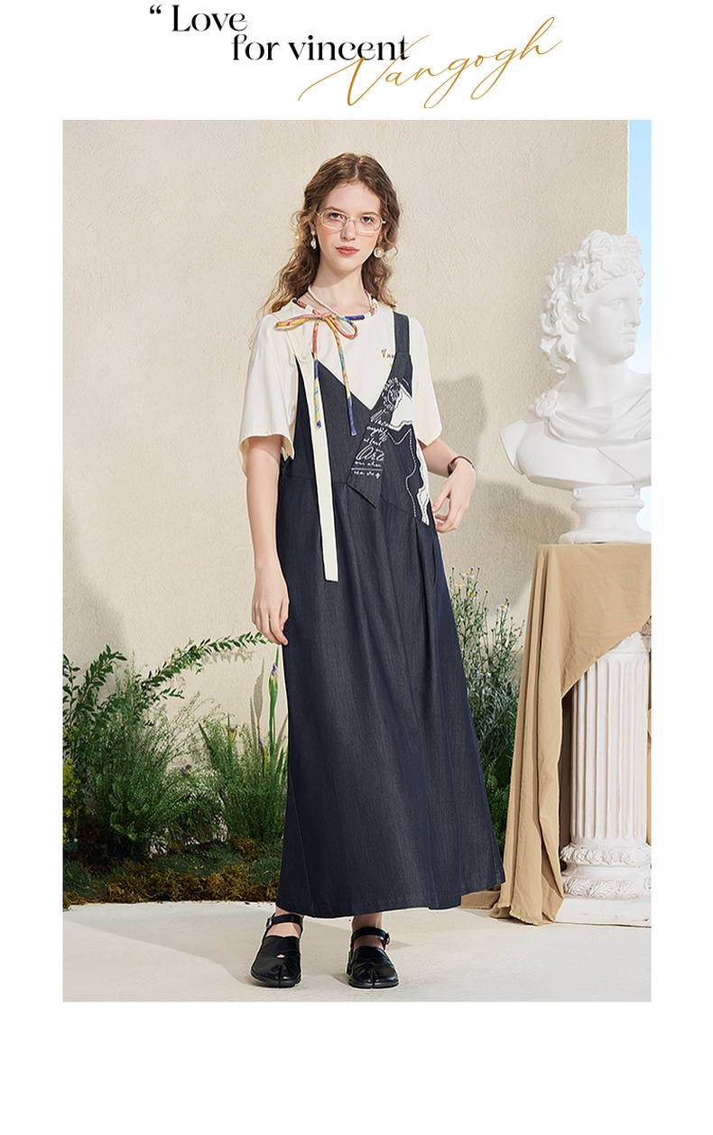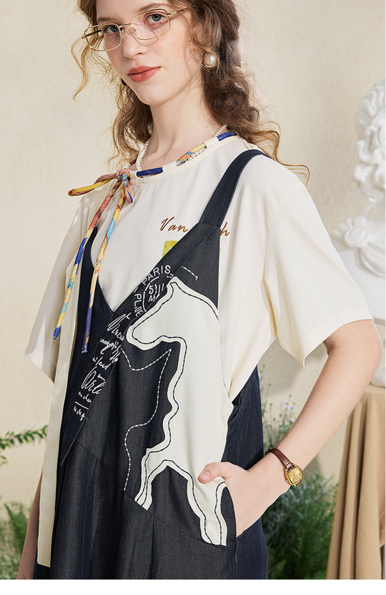 两三事梵高文艺夜驰白马2025夏季新款贴布绣天丝牛仔背带裙连衣裙