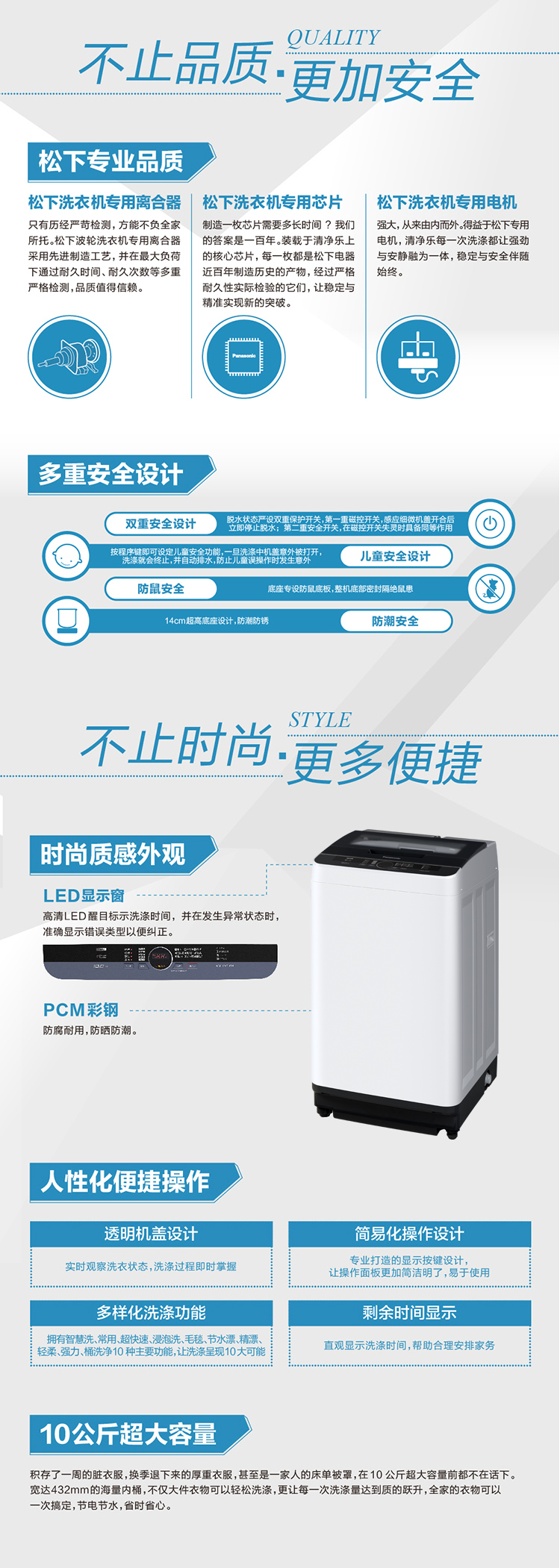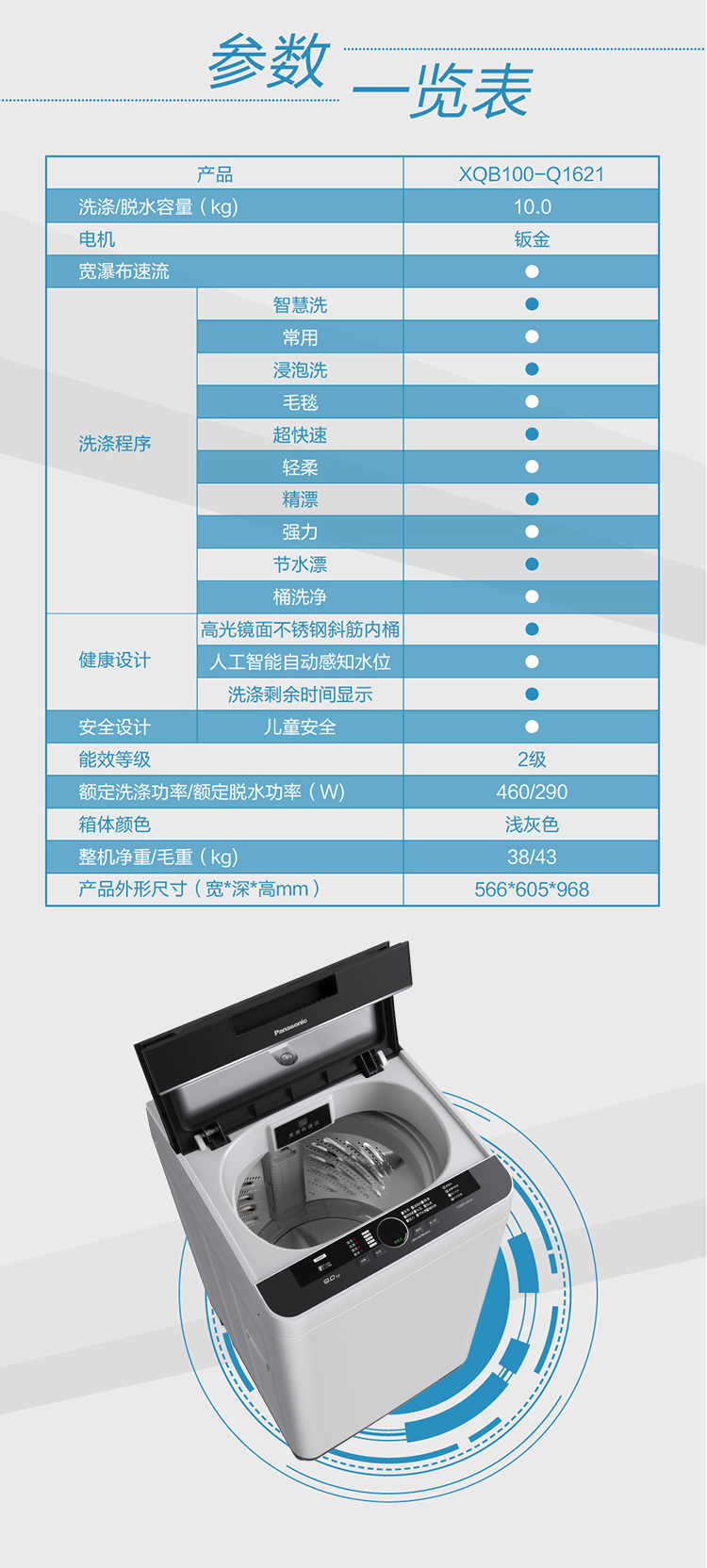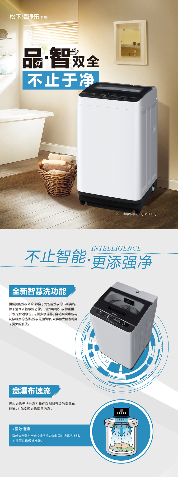 松下XQB100-Q1E2A全自动家用洗衣机家用波轮 宽瀑布速流 一键智洗大容量10公斤升级玻璃盖板