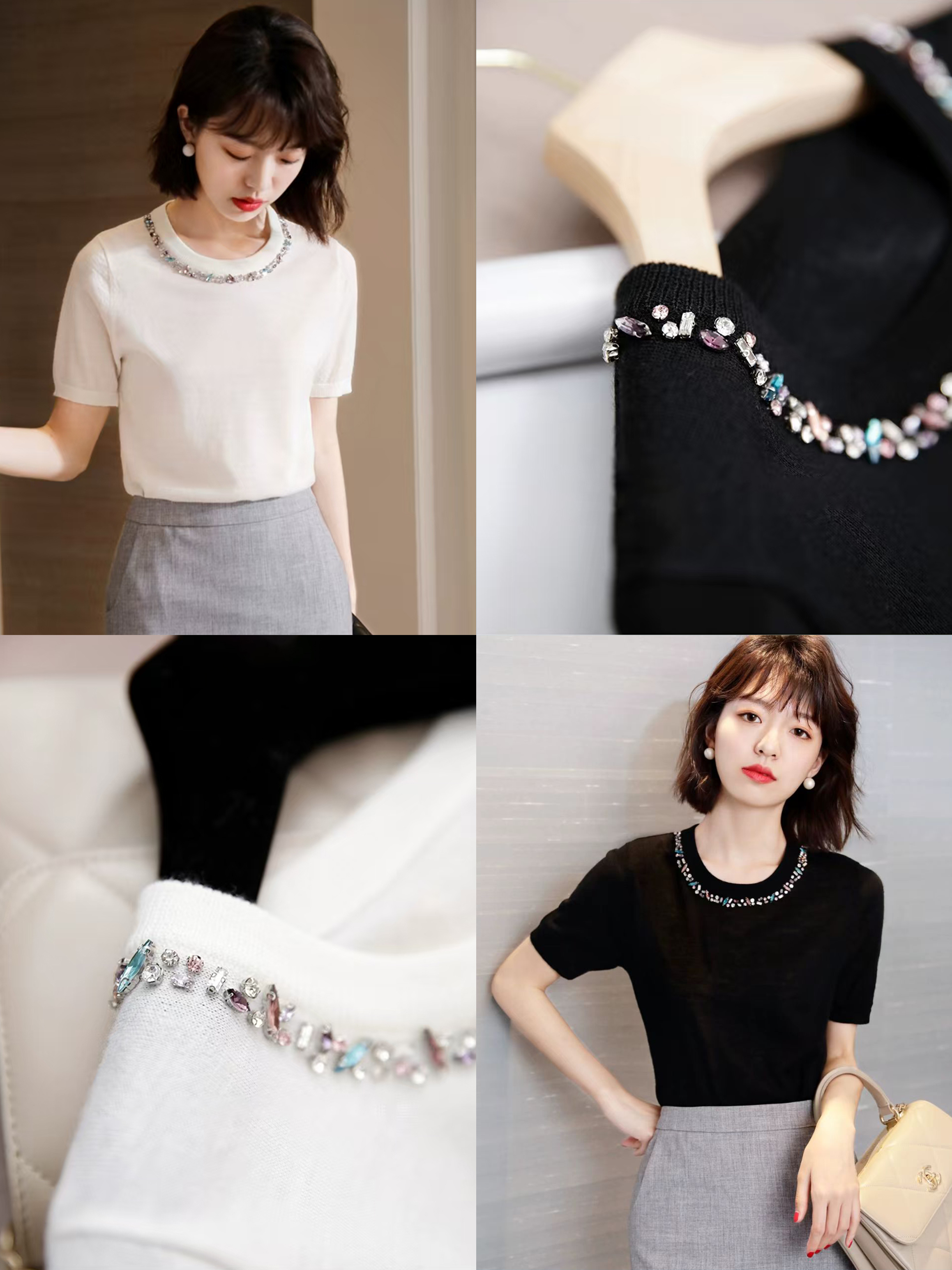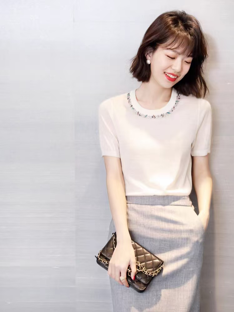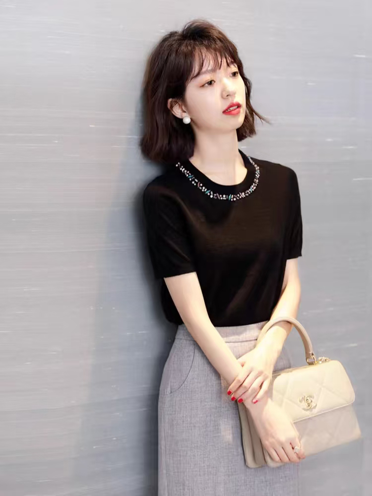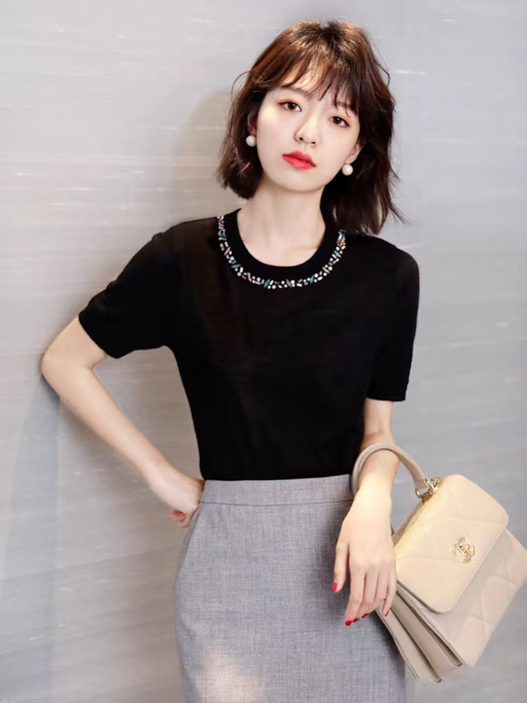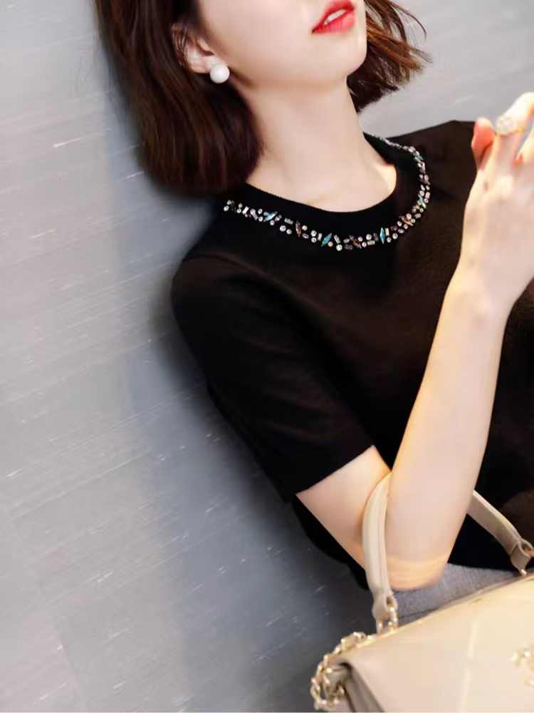 💰105元包邮 阿玛施同款,重工手工钉珠镶钻莱赛尔天丝针织短袖【JS3699378 】 一件自带贵气感的针织 T 恤 才是衣橱里适配所有场合的 “百搭王牌”