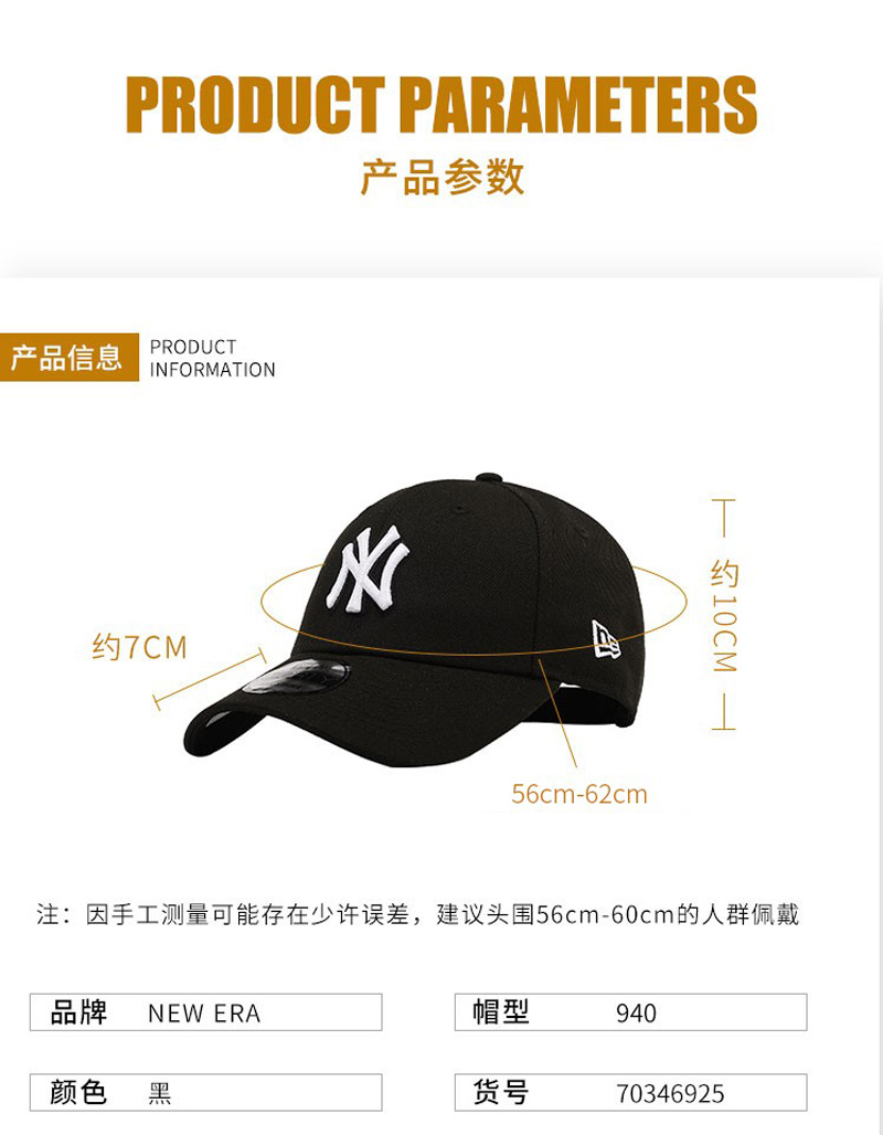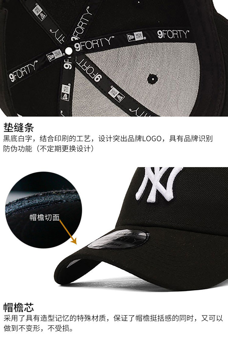 NewEra纽亦华棒球帽NY字母弯檐可调节嘻哈帽男女新款黑色棒球帽70346925