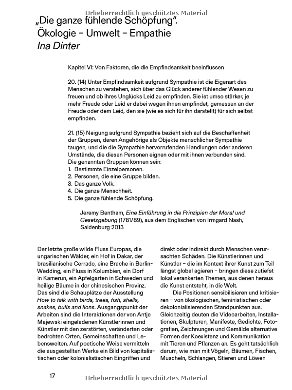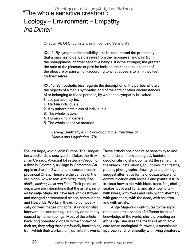 "Collaborative and trans-disciplinary artist Antje Majewski (born 1968 in Marl, Germany) has opened an ongoing dialogue with colleagues from Brazil, Cameroon, China, Colombia, France, Hungary, Poland, and Senegal, and invited them to contribute works exploring the reciprocal relationships between human and beyond-human beings in a poetic way. This book stems from this conversation between the participating artists and their interactions with others.