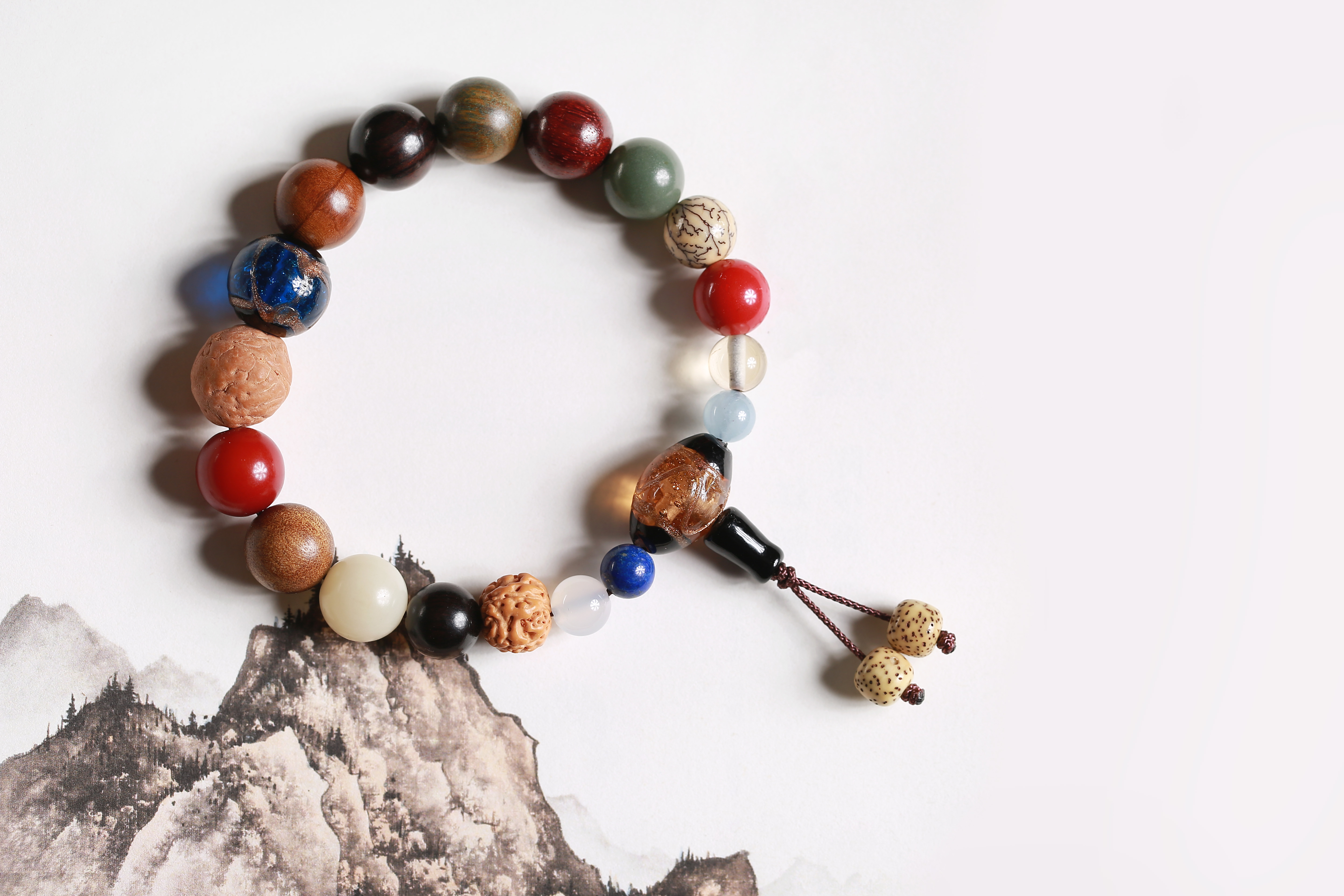 【设计理念】结合民间太岁题材、传统“十八籽”和清代宫廷服饰配件等元素进行设计,取一百零八颗佛珠的六分之一,即十八粒,串联成多元的十八子珠串,包含木质、矿石等多种名贵材质。香灰琉璃,雍和宫式祝福,龙潜之地,祈愿福气财气;佛缘菩提,明心见性,守护身心安乐;喜庆配色,吉祥中国红,寓意鸿运当头;水晶、朱砂,敬天畏地,象征化煞辟邪。整体搭配大方得体,守善保真,作为癸卯兔年的化太岁吉祥物,非常合适,增进福报,祈福纳祥,平安顺遂。
