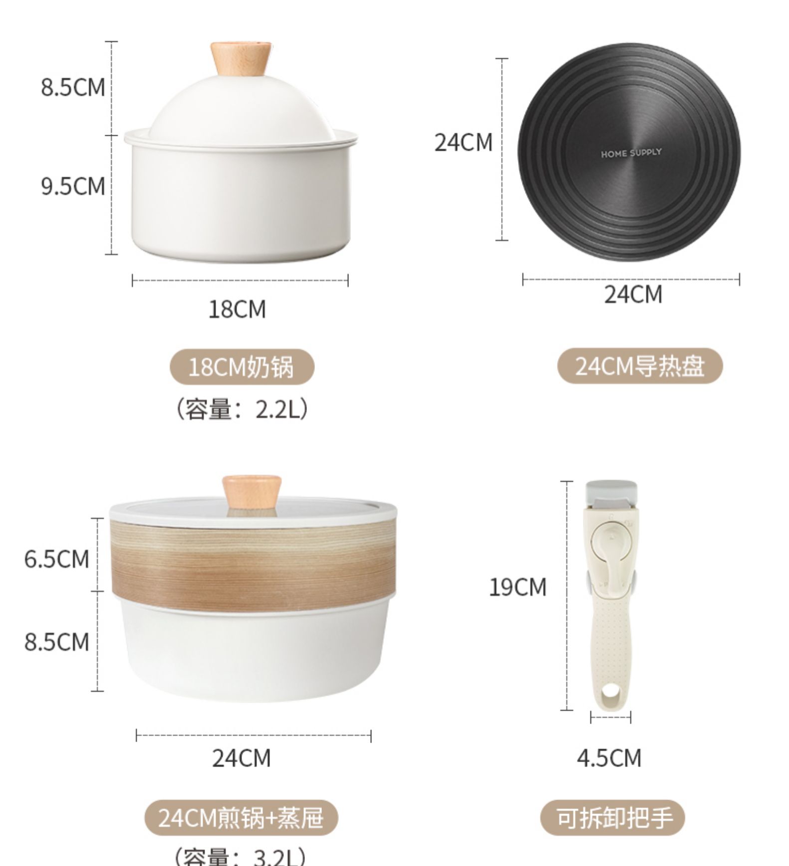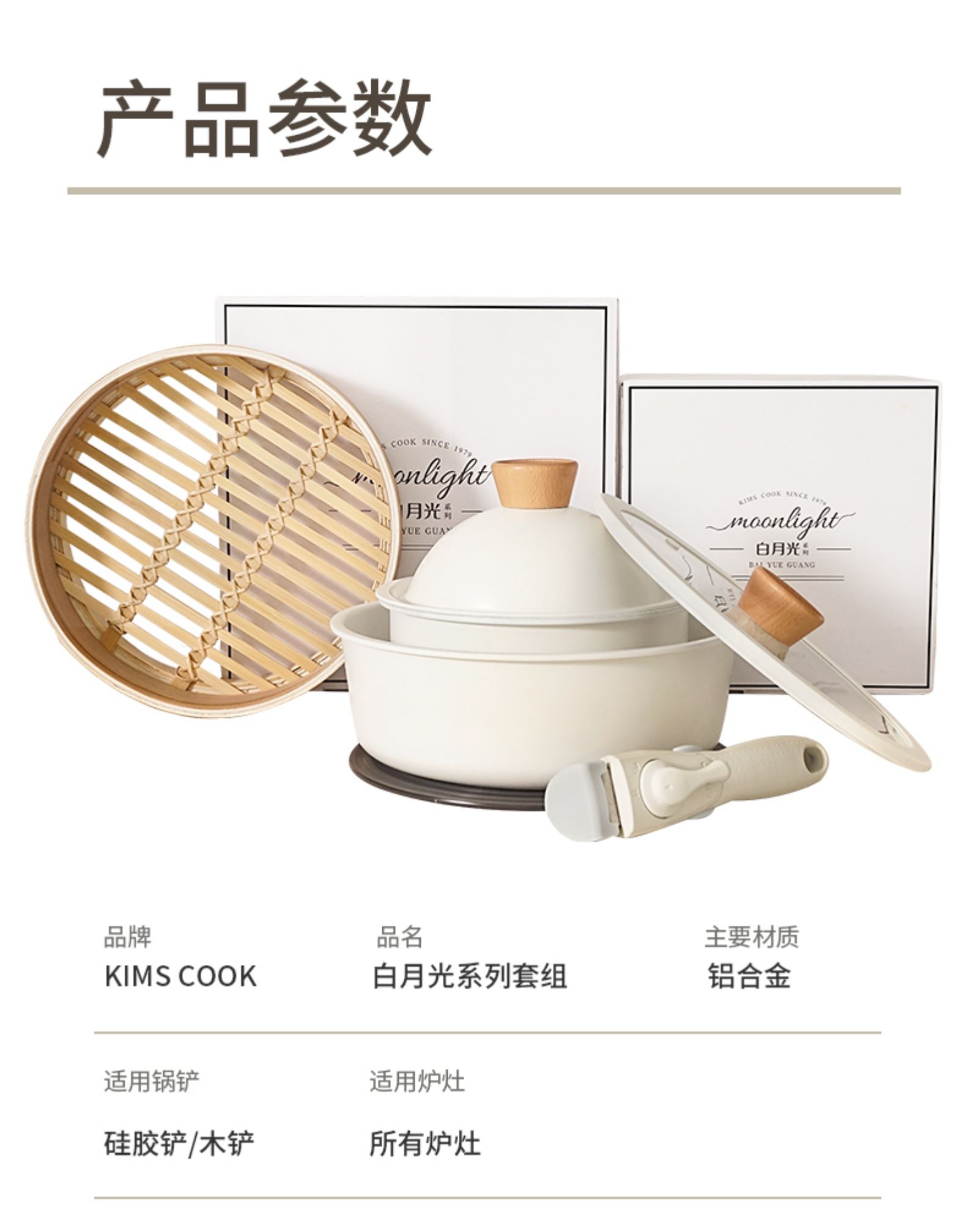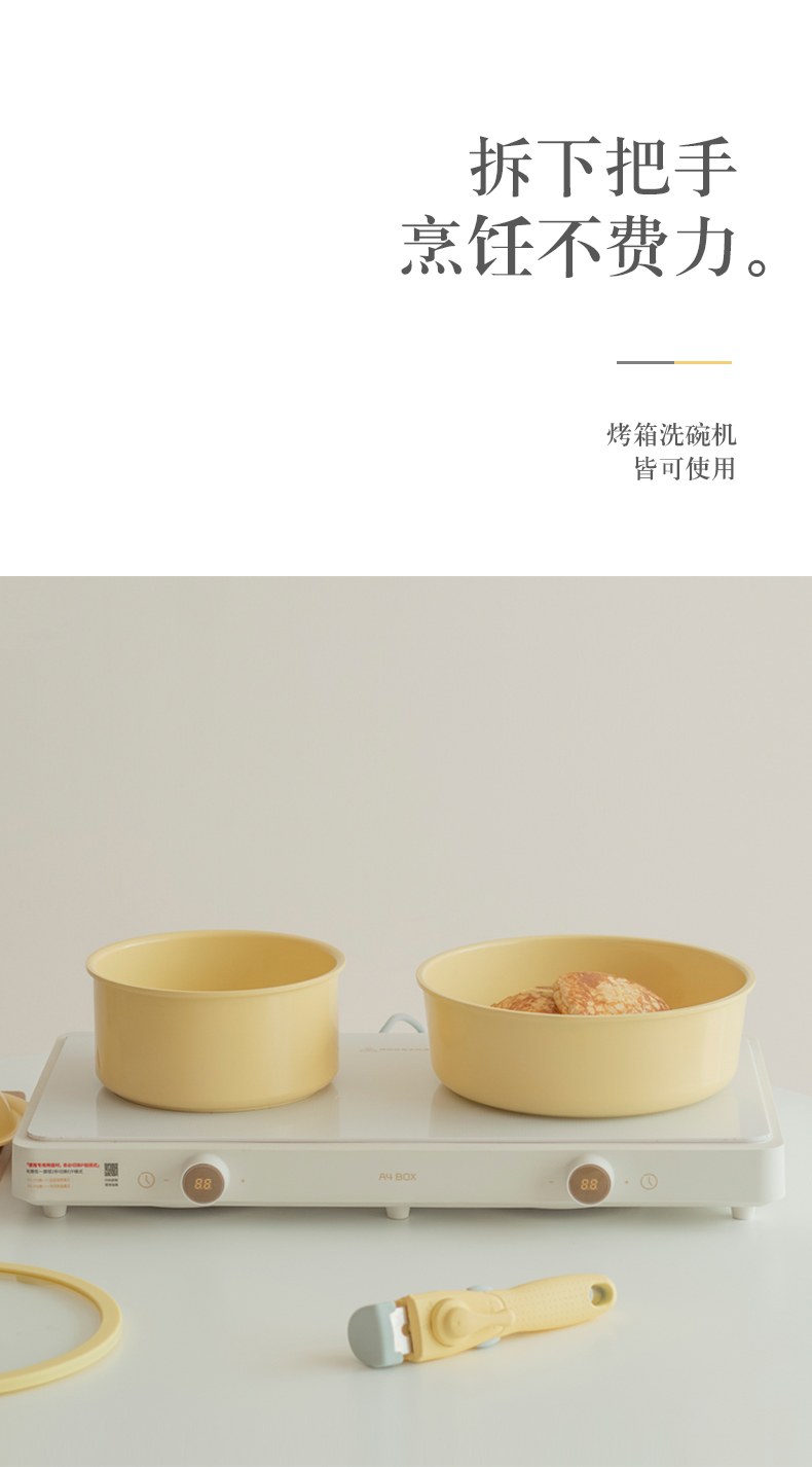 品牌:KIMS COOK 型号:一米阳光 材质:铝合金 毛重:0.89Kg 锅底类型:复合多层底 直径:18cm 适用炉灶:所有 适用锅铲:硅胶铲、木铲 配置:18cm奶锅+24cm煎锅+蒸屉+导热盘+可拆卸把手 |
