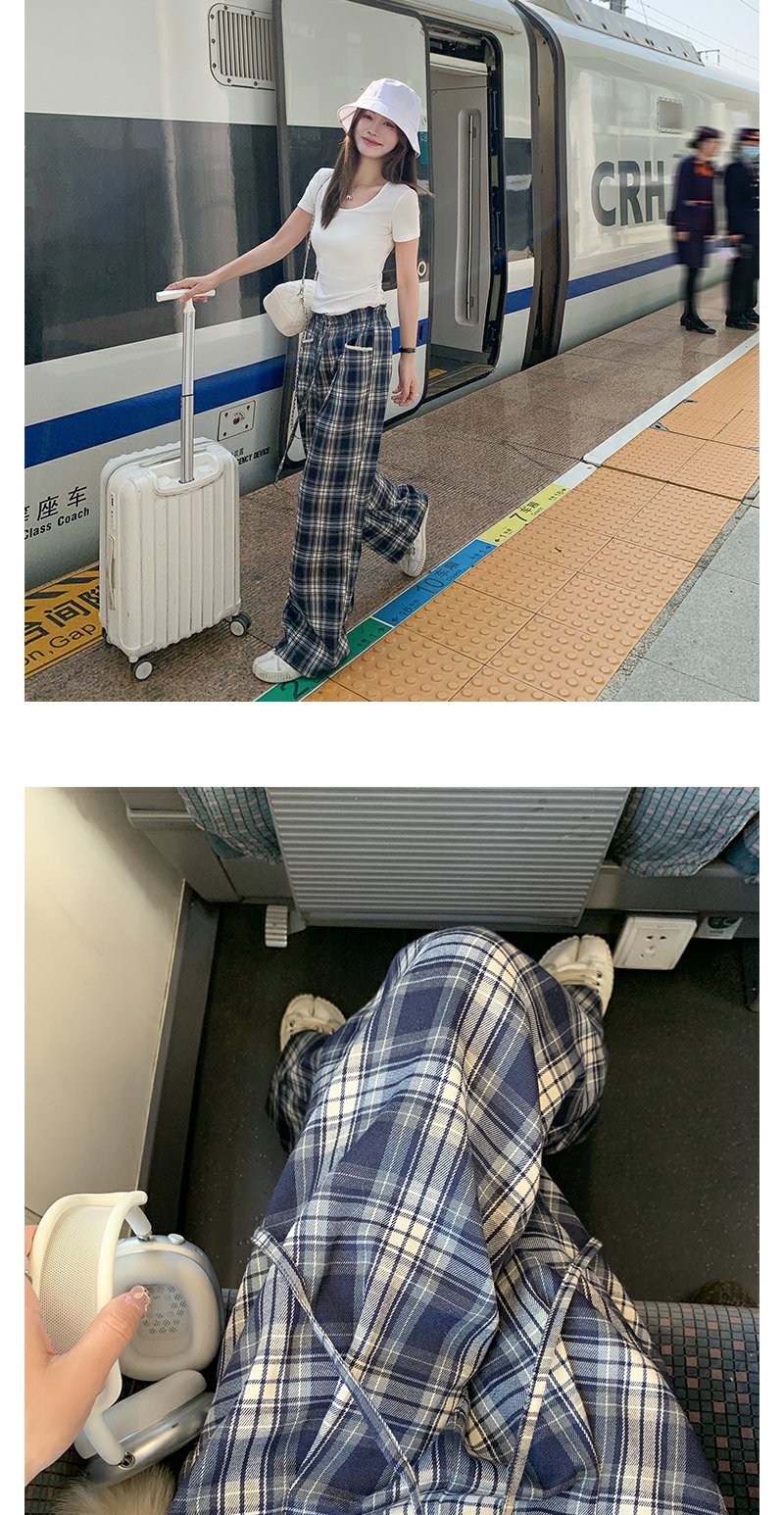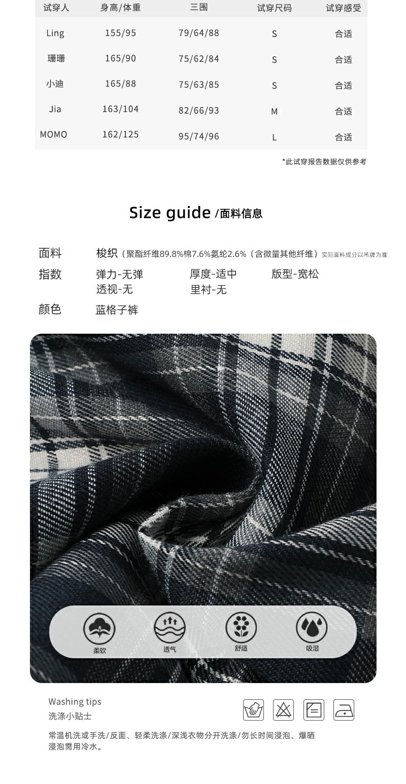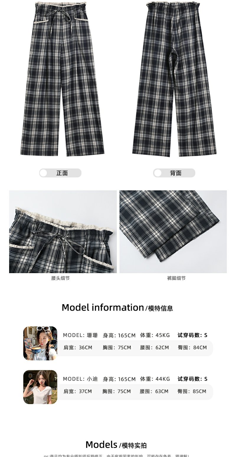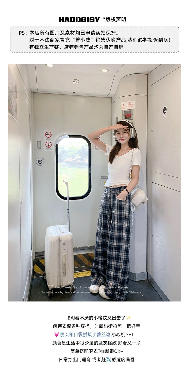 <曾小咸推荐>高腰显瘦抽绳蓝色格子宽松阔腿裤
