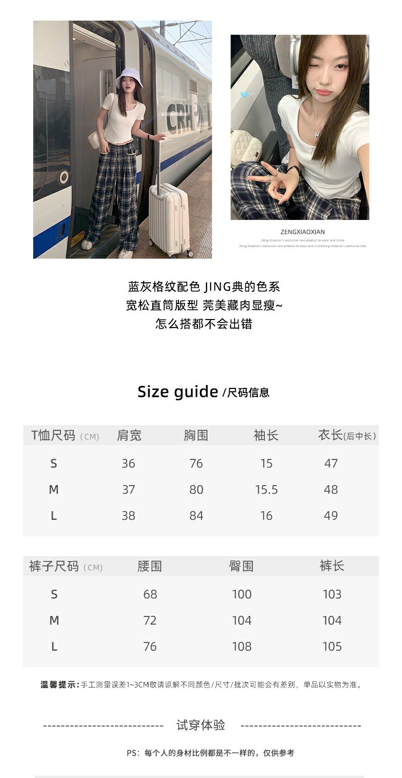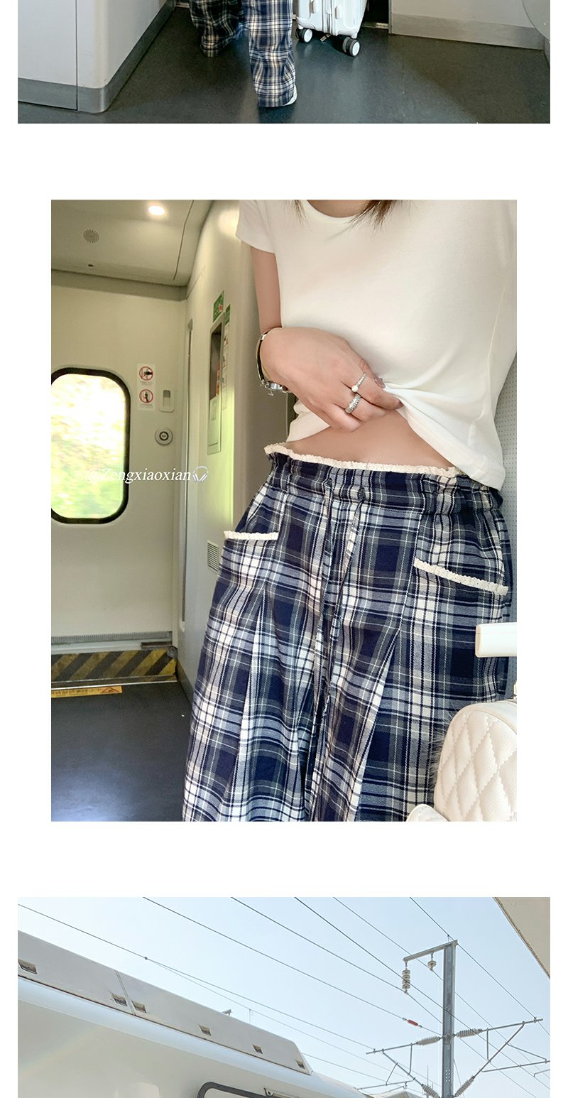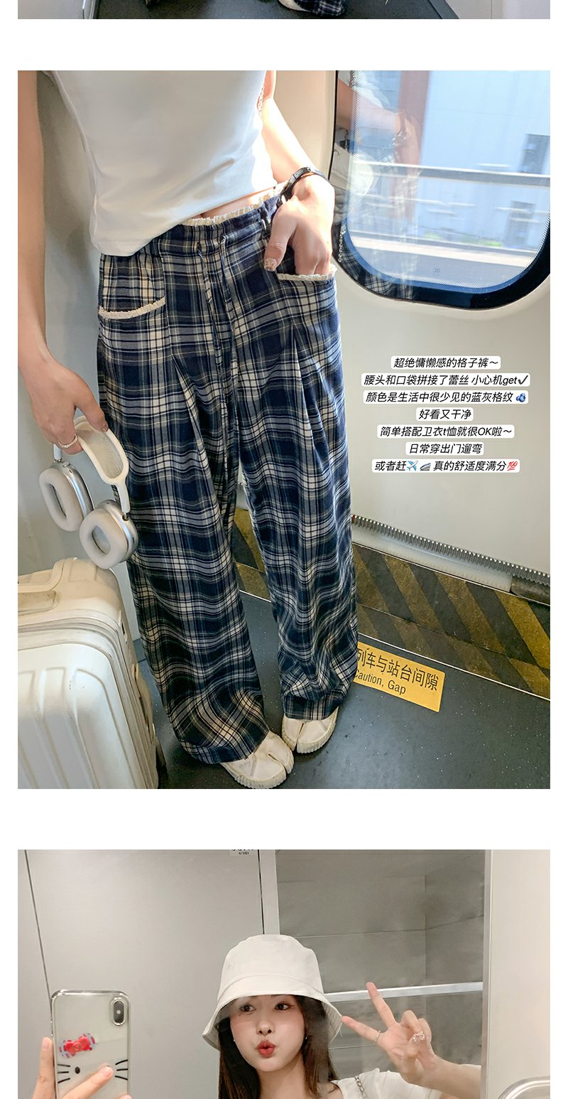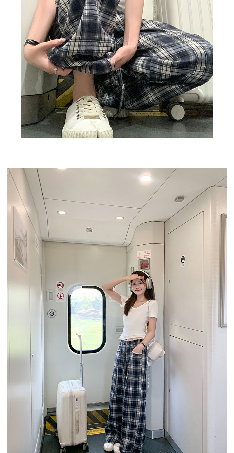 <曾小咸推荐>高腰显瘦抽绳蓝色格子宽松阔腿裤