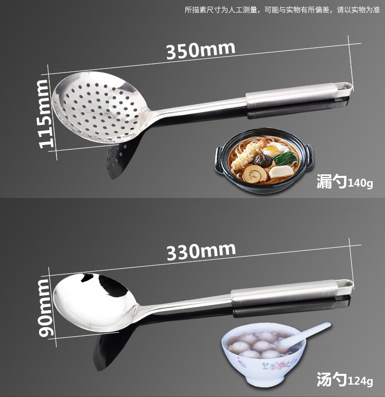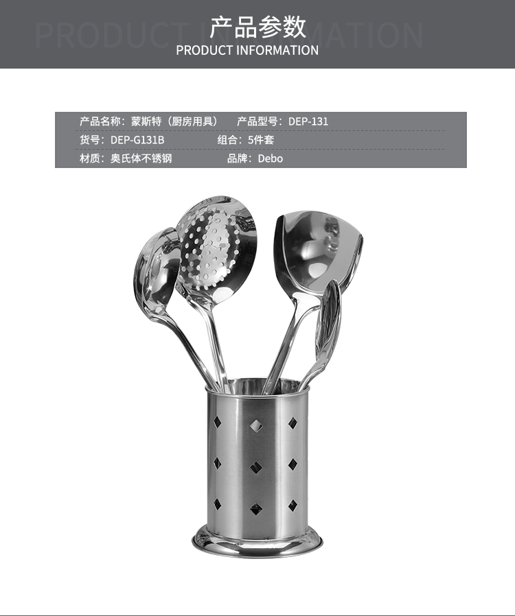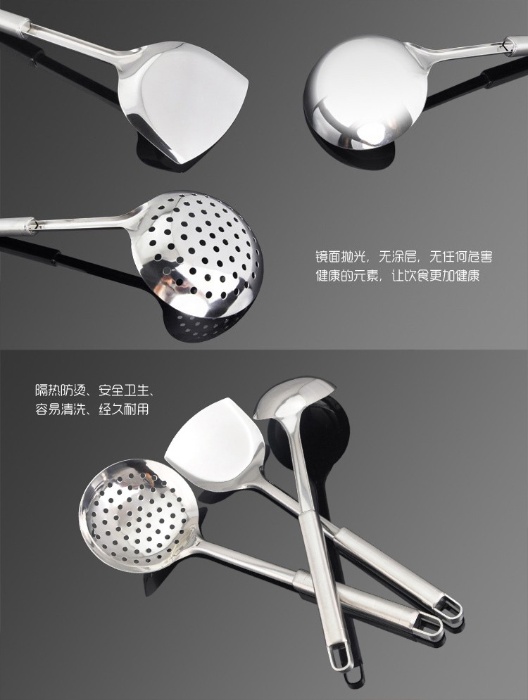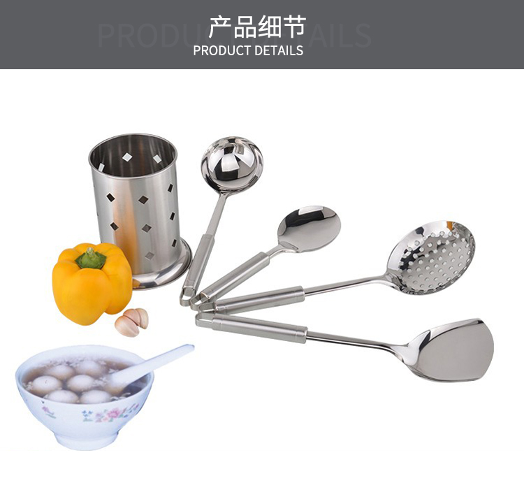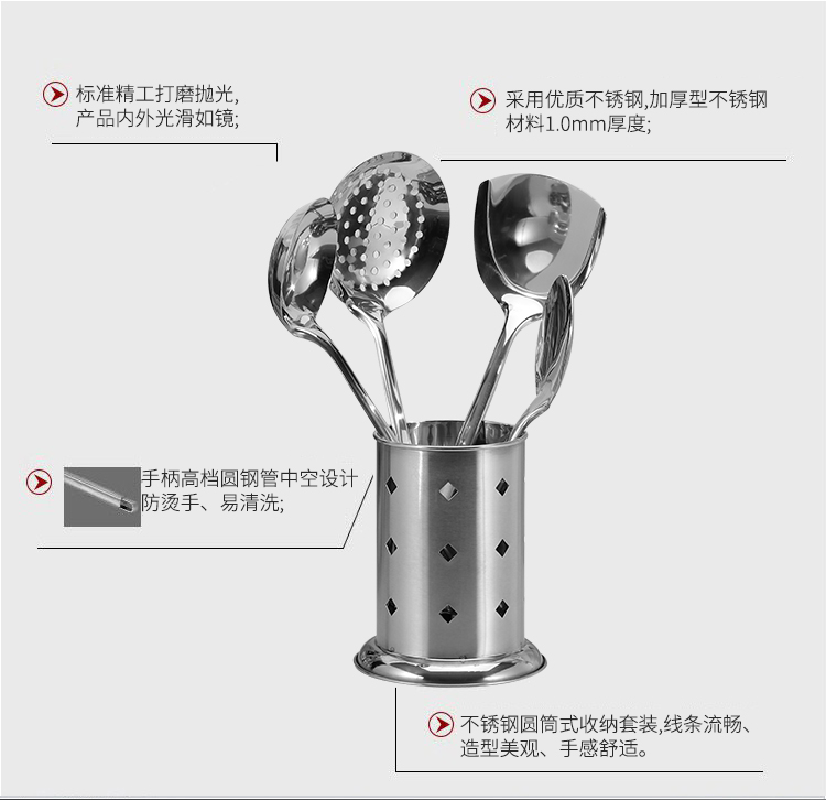 配置:锅铲*1、汤勺*1、漏勺*1、饭勺*1、收纳座*1