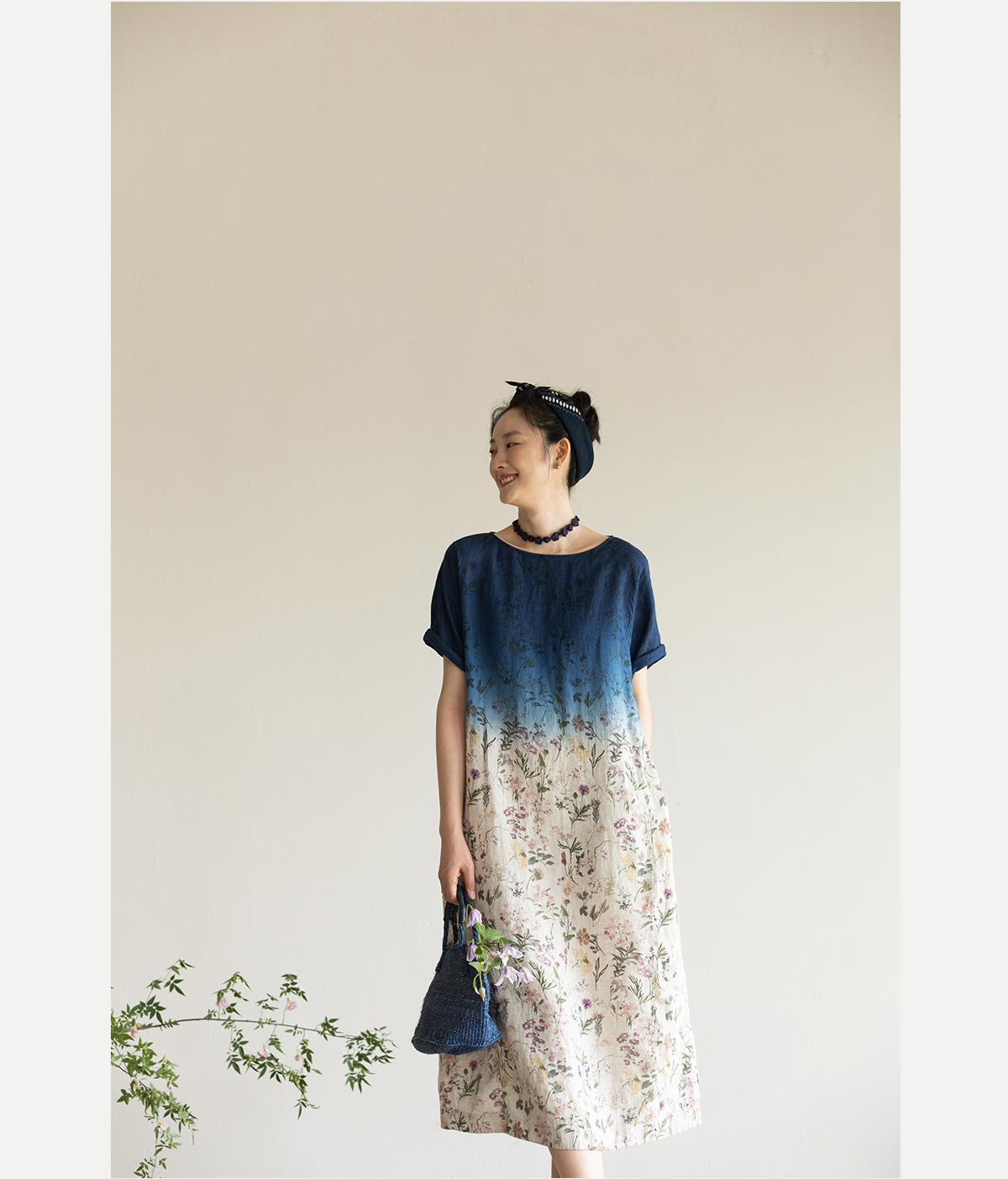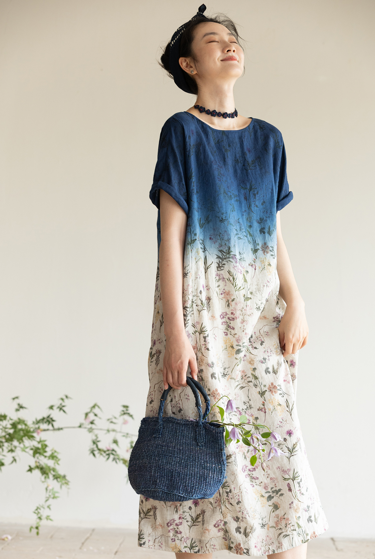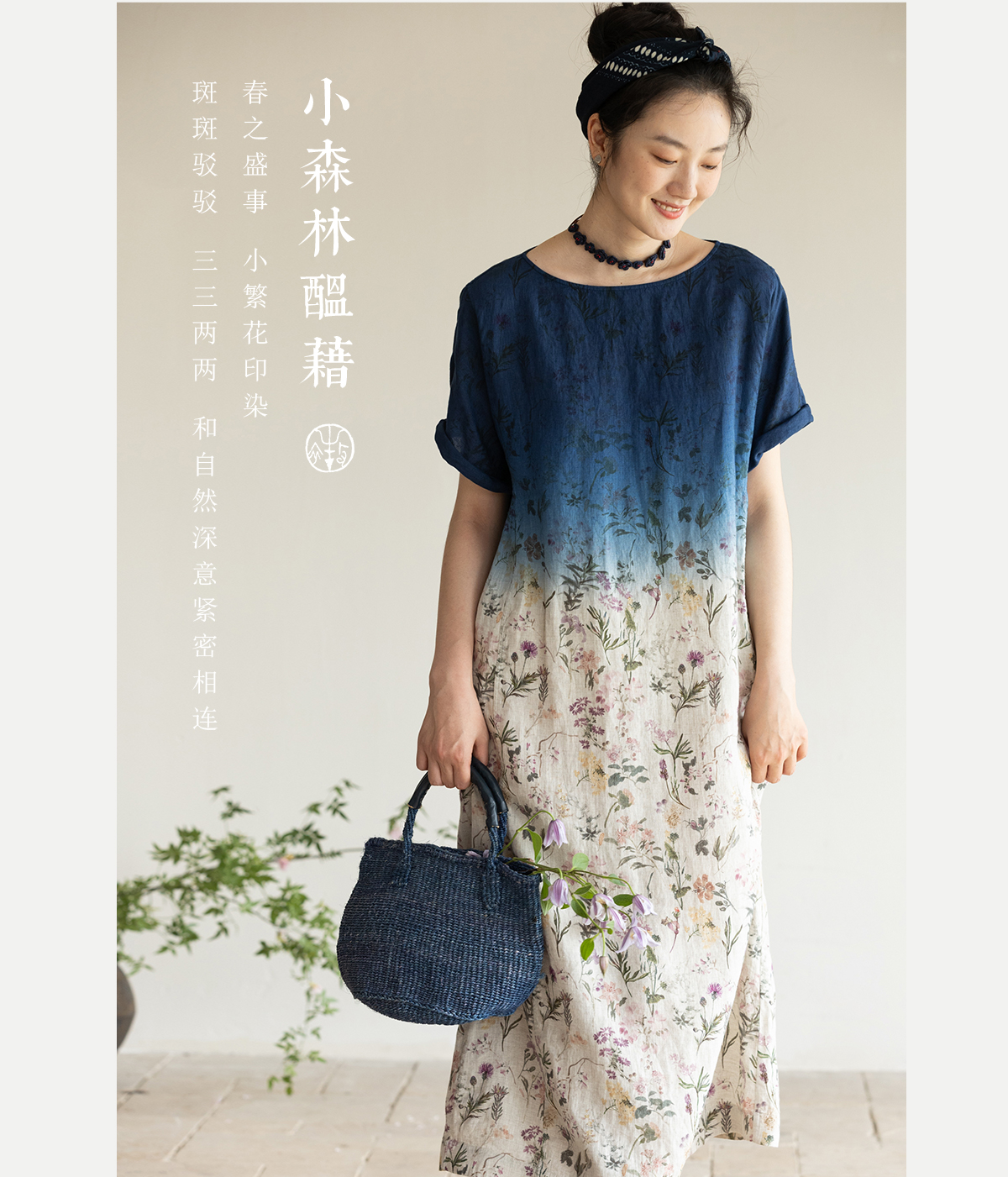 牧衣游原创 印花吊染亚麻连衣裙新款轻薄渐变质朴宽松长裙 夏未