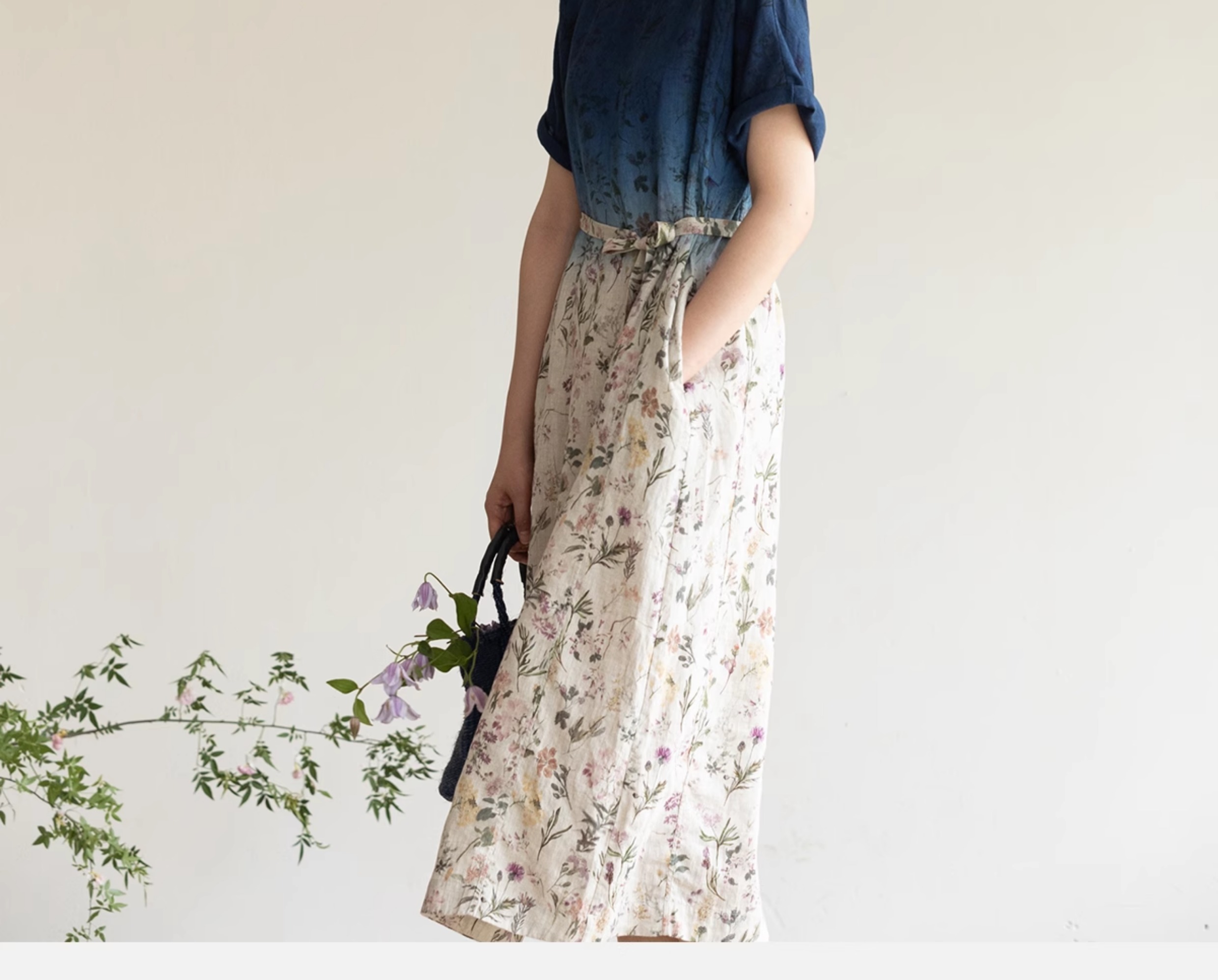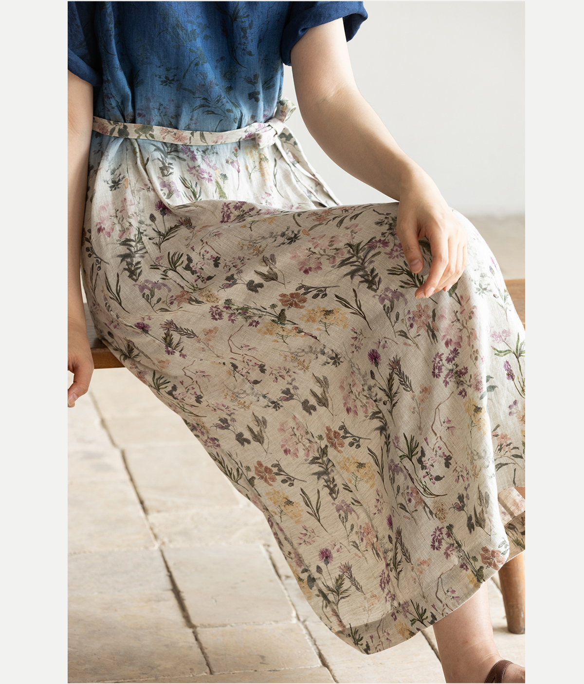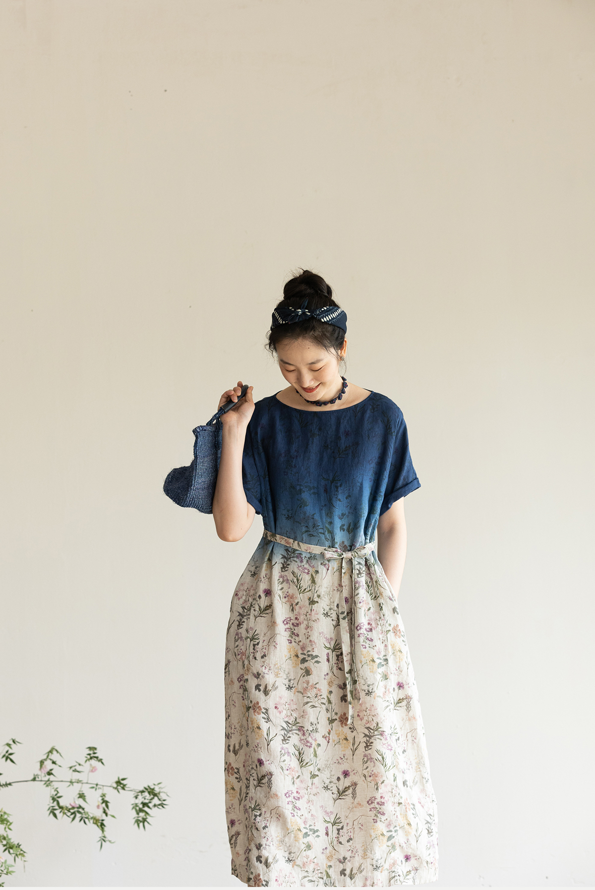 牧衣游原创 印花吊染亚麻连衣裙新款轻薄渐变质朴宽松长裙 夏未