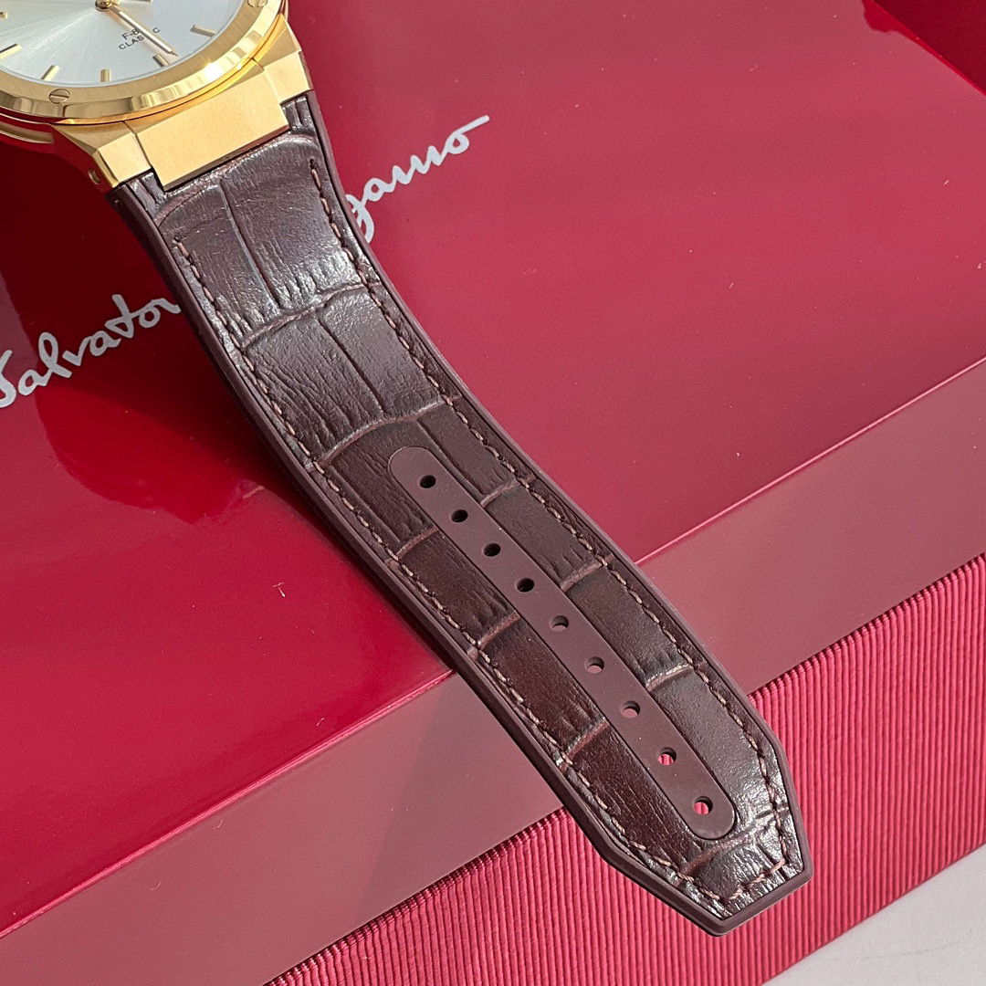 新款首发!外贸出口订单,Ferragmo F-80 Slim系列,简约优雅时尚男表;表径:41mm,采用纤薄的表壳,运动的气质;鳄鱼纹蛇纹小牛皮搭配橡胶表带,运动与优雅联合,彰显匠心精工品质,防水防汗佩戴舒适;简约太阳纹盘面,经典大气三针设计,立体时标Logo增添视觉层次感,硬朗螺钉精钢表壳,拉丝工艺,搭配齿轮F浮雕表冠,突显现代都市型男格调;底盖镌刻Ferragamo总部斯皮尼图案。蓝宝石水晶镜面;瑞士石英机芯,性能稳定,走时精准,50米防水,配原盒包装一手好价!