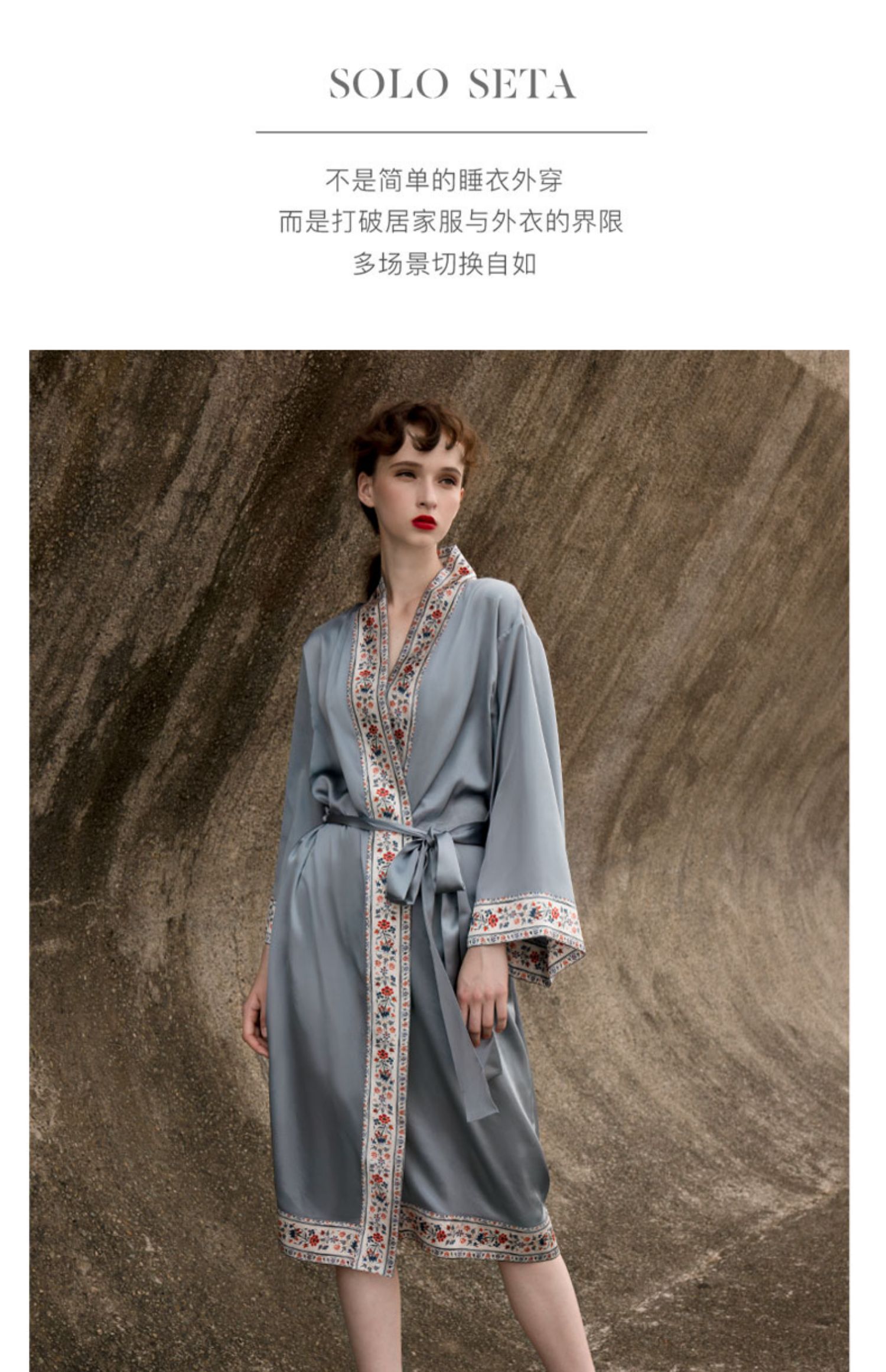 - soloseta专注于真丝织物,灵感源自意大利语,中文含义为“只做真丝”的意思。让睡衣变时尚,居家和外出瞬间切换,使其更具有出街,度假,参加宴会等功能。