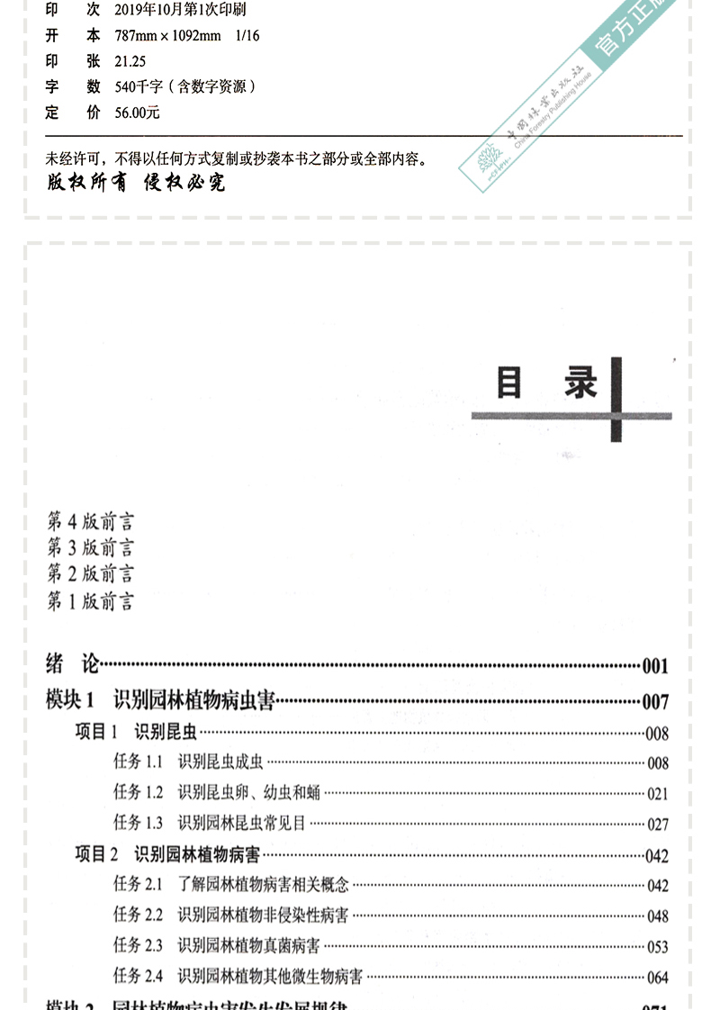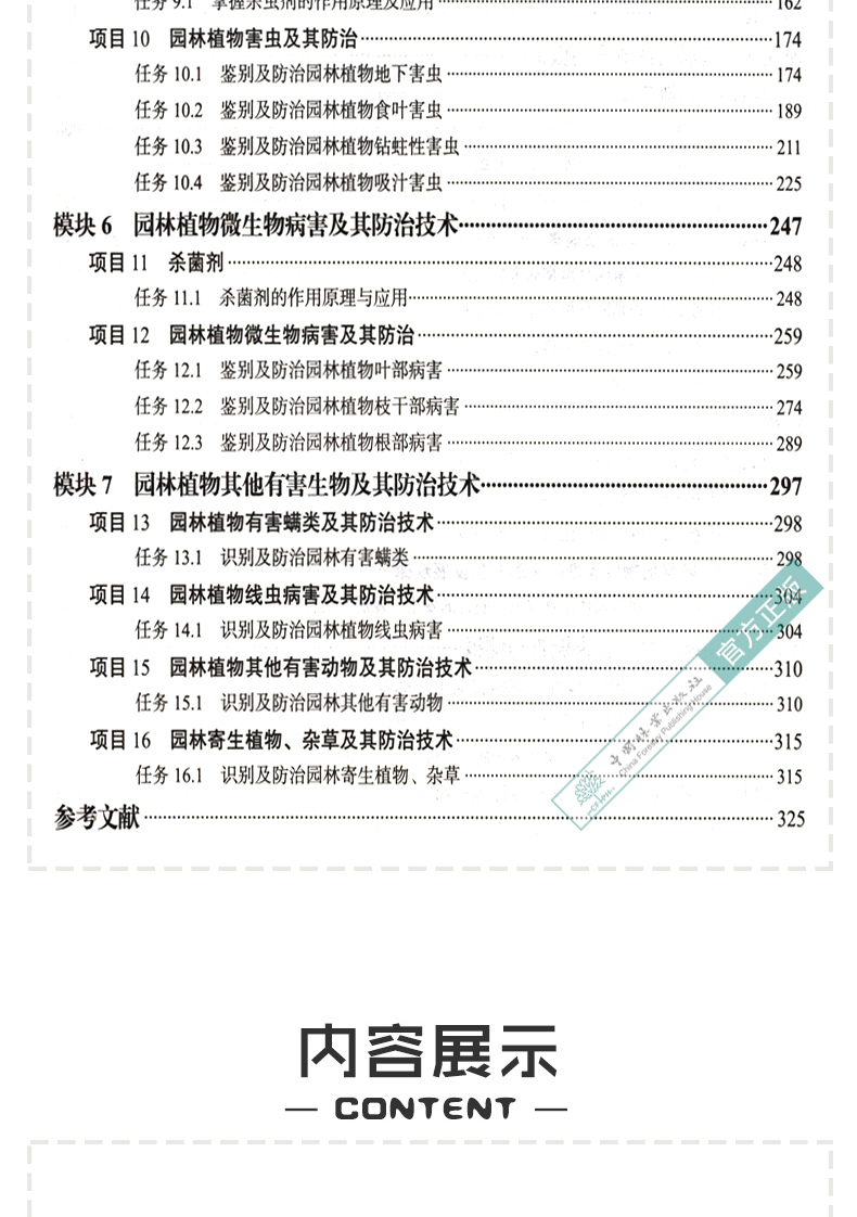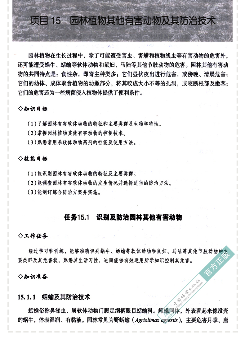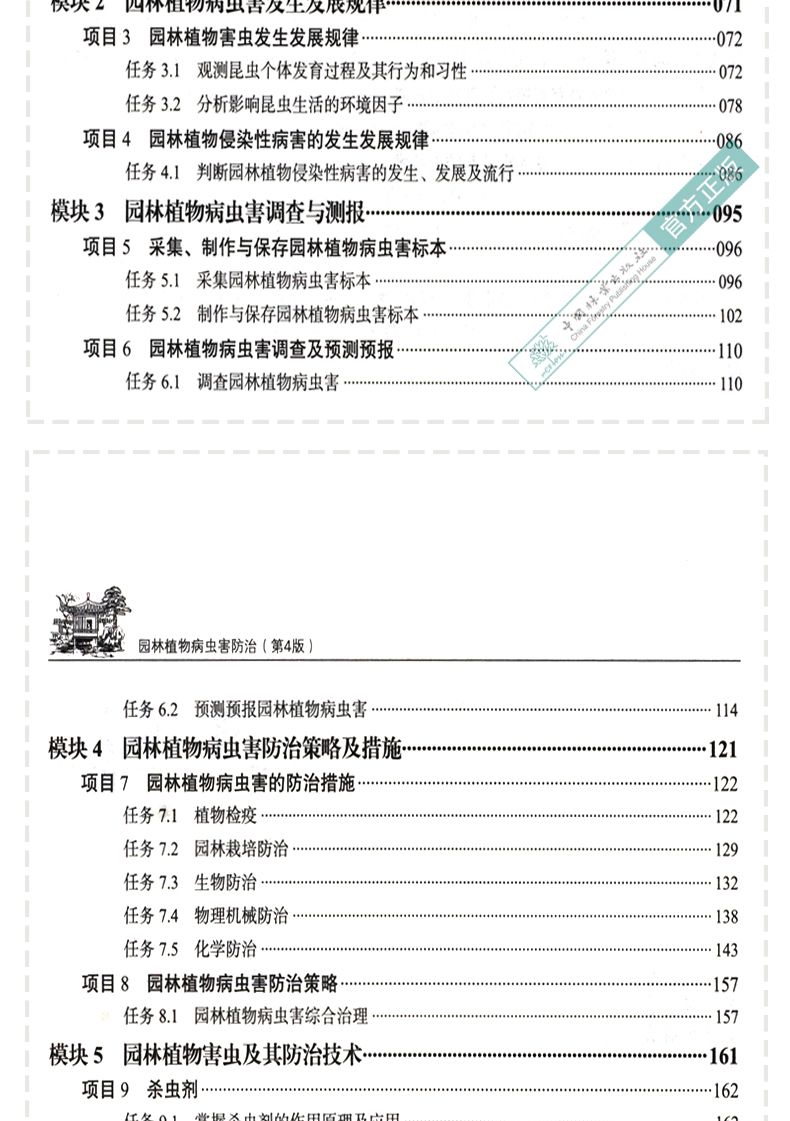 本书为教育部林业职业教育教学指导委员会高职园林类专业工学结合“十二五”规划教材,共分为7个学习单元16个学习项目33个学习性工作任务,包括园林植物病虫害识别、园林植物病虫害发生发展规律、园林植物病虫害调查与测报、园林植物病虫害防治策略及措施、园林害虫及其防治技术、园林植物微生物病害及其防治技术、园林害螨、蜗牛等其他有害生物及其防治技术。