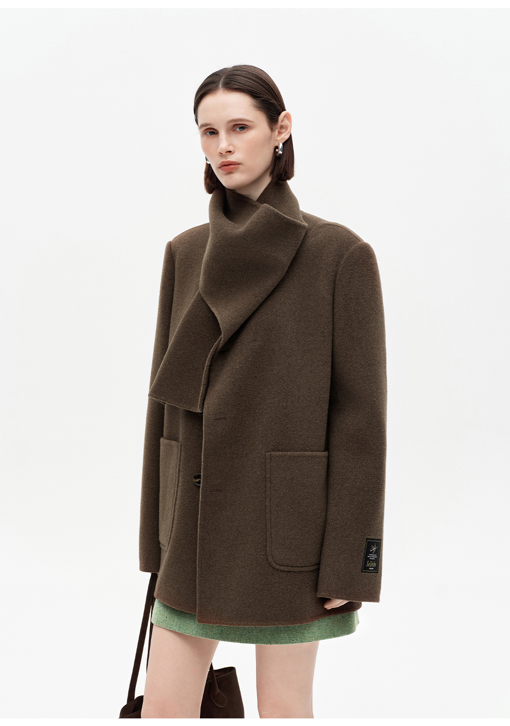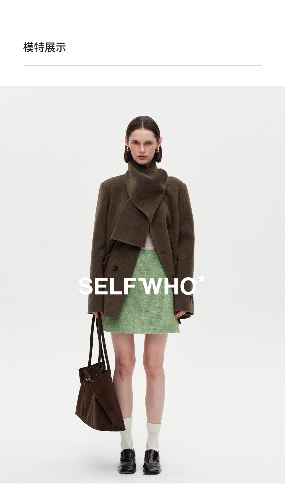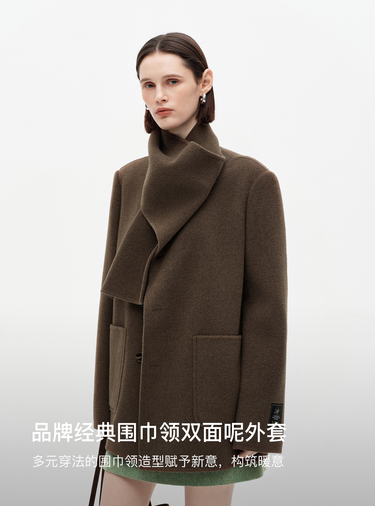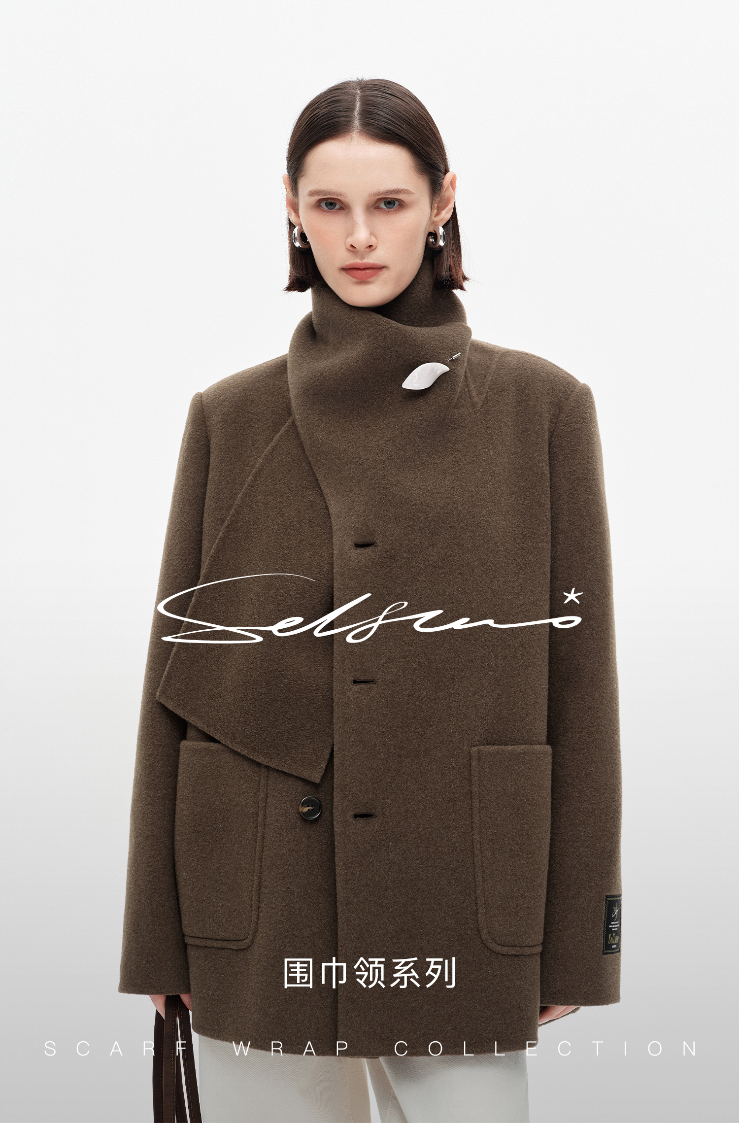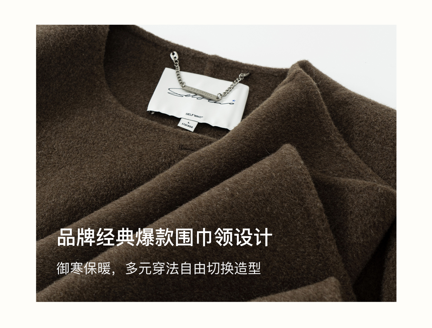 SELFWHO绵羊毛混纺围巾领双面呢外套女2025冬新款中长款毛呢大衣