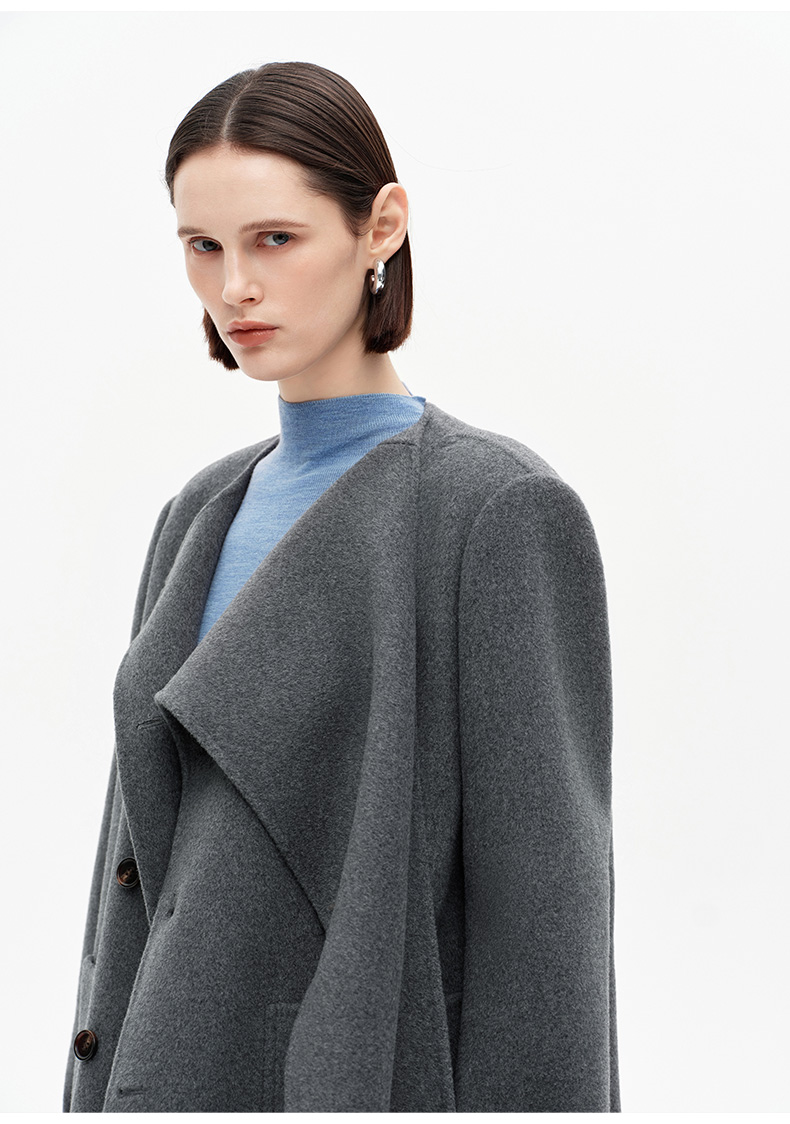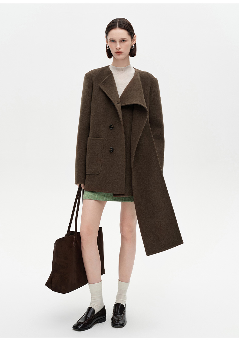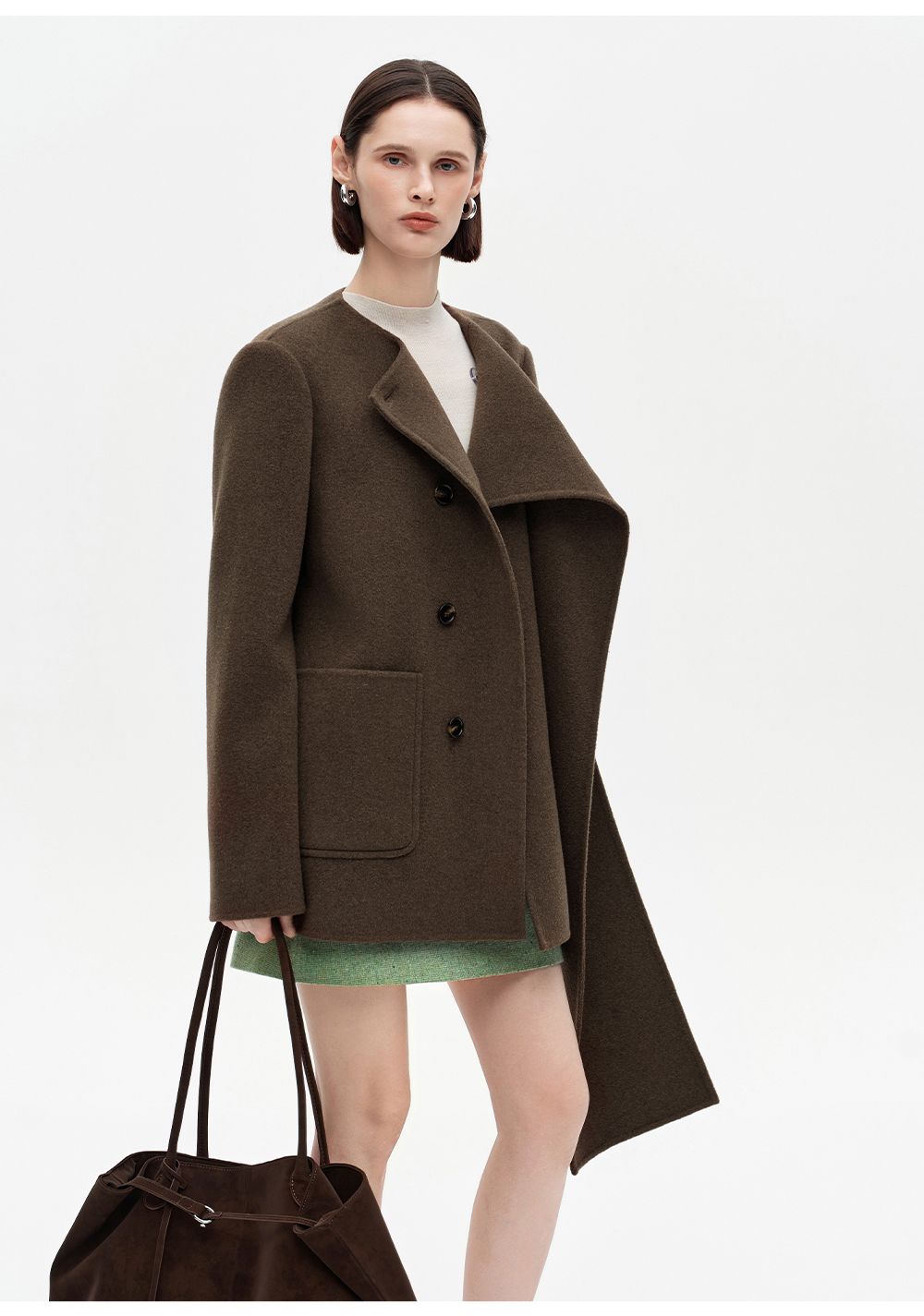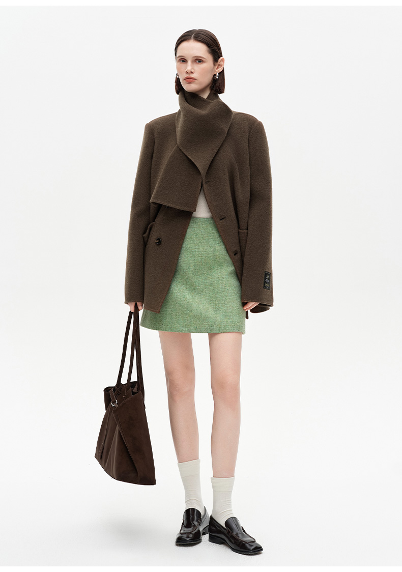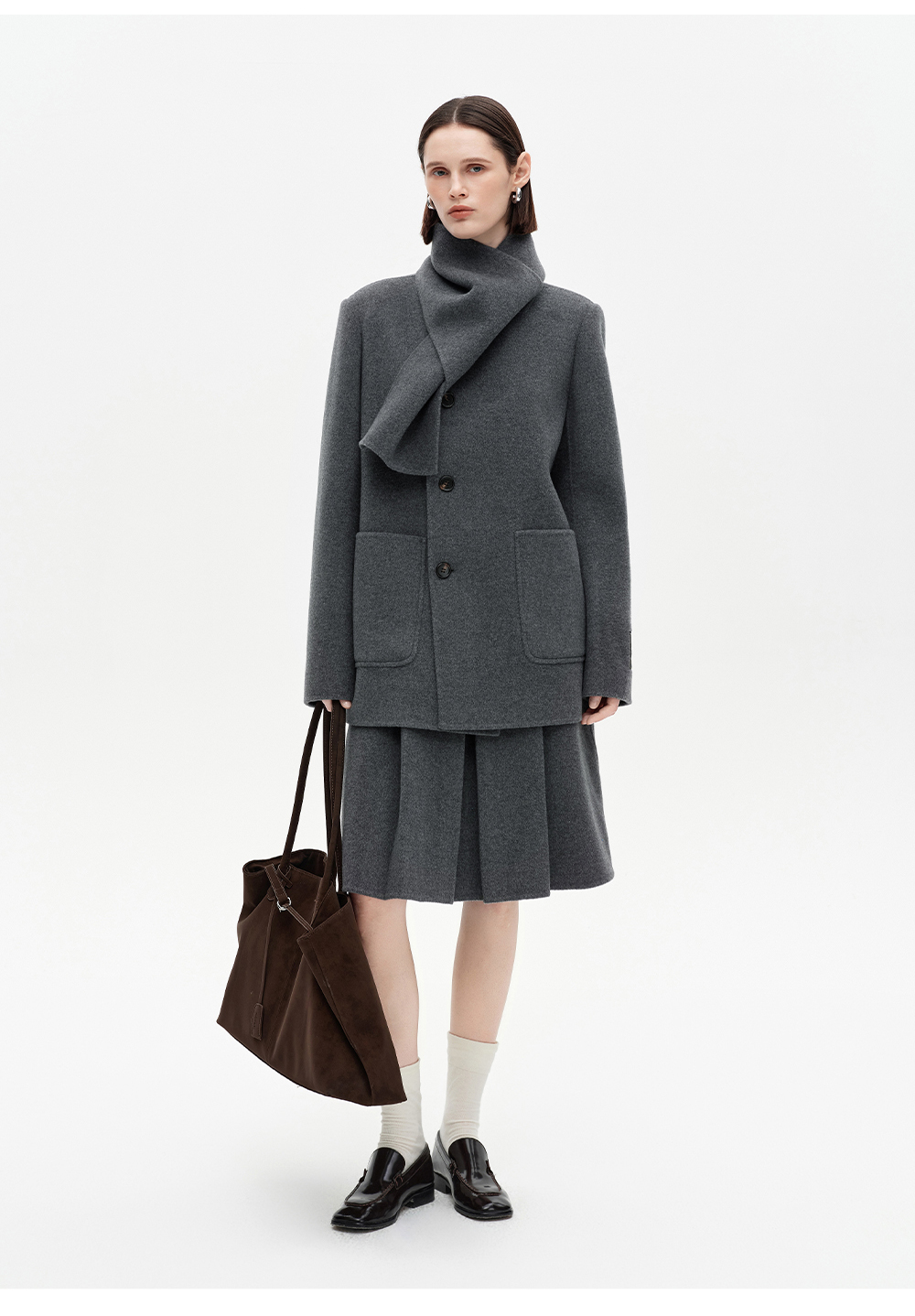 SELFWHO绵羊毛混纺围巾领双面呢外套女2025冬新款中长款毛呢大衣