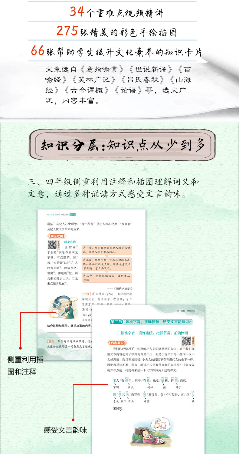 难度分层 相对中高年级,三年级选文简短,内容易理解,注重趣味性,试题相对简单,侧重对利用注释和插图理解词义和文意,通过多种诵读方式感受文言韵味等基础知识点的讲解。