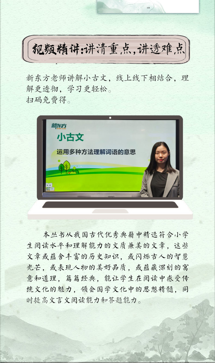 书中每篇小古文都配有音频朗读,能更有效地帮助学生提升阅读能力,感受文言韵味。重难点知识配有新东方老师的视频讲解,生动形象,立体直观,辅助学生进一步理解并消化文言文重难点。“知识卡片”则对文言知识进行拓展,帮助学生加强文化积累,提高文化品味。