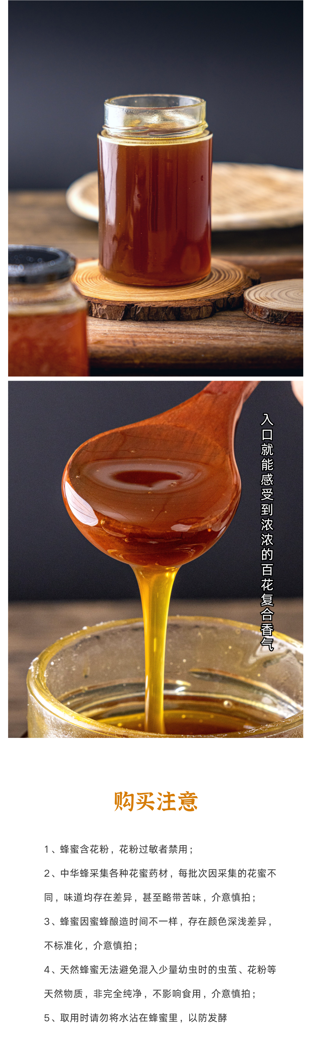 3、天然蜂蜜无法避免混入少量幼虫时的虫茧、花粉等天然物质,非完全纯净,不影响食用,介意慎拍;