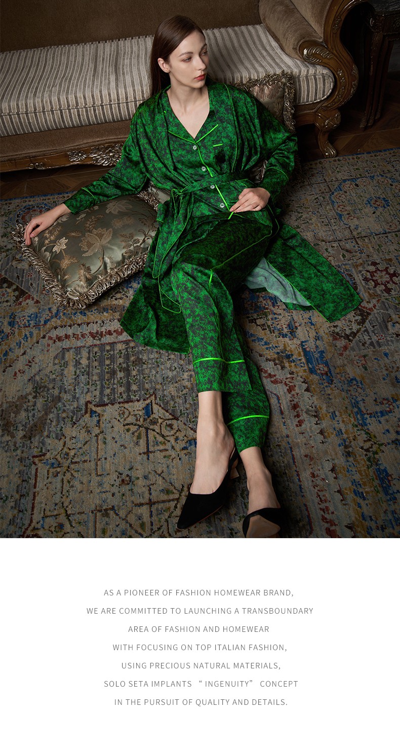 - soloseta专注于真丝织物,灵感源自意大利语,中文含义为“只做真丝”的意思。让睡衣变时尚,居家和外出瞬间切换,使其更具有出街,度假,参加宴会等功能。