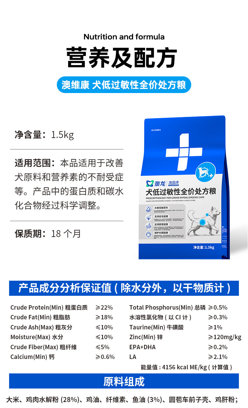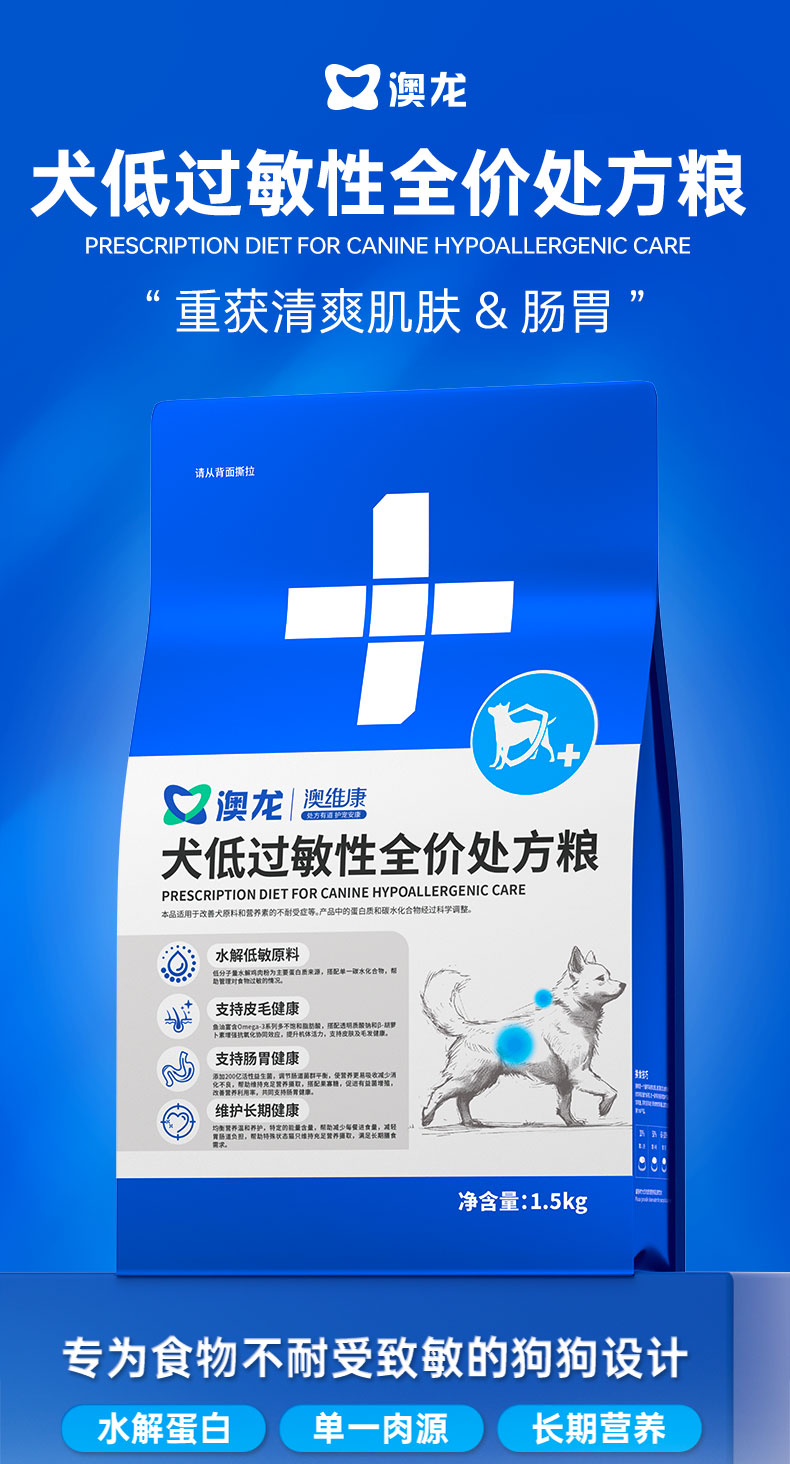 澳龙澳维康犬低过敏性全价处方粮1.5kg赠50g试吃