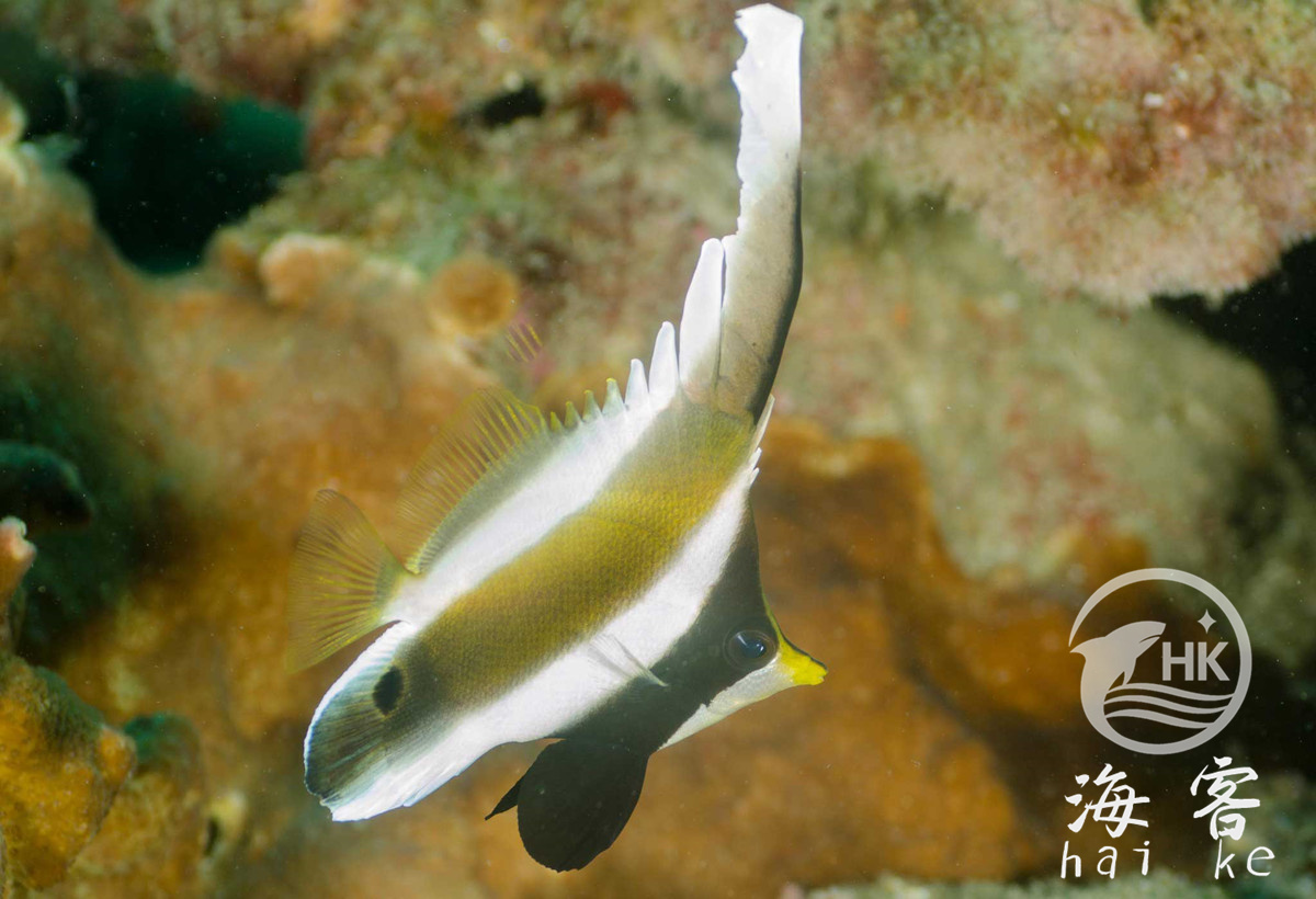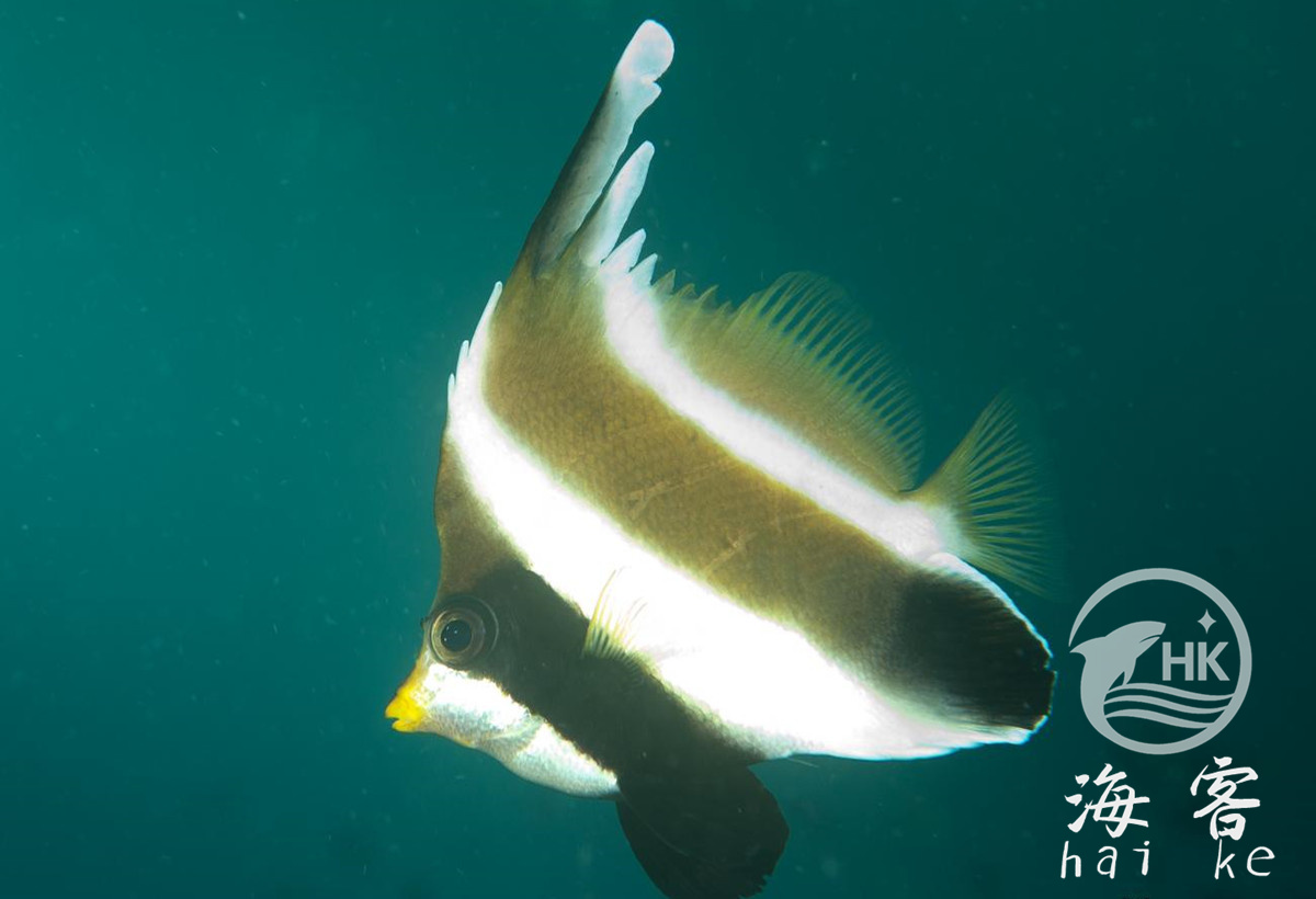 也叫羽毛刀,南洋关刀,金口马夫。有象羽毛一样高高竖起的背鳍,白色的身体,三条褐色垂直条纹,一条穿过眼睛,嘴部是黄色。