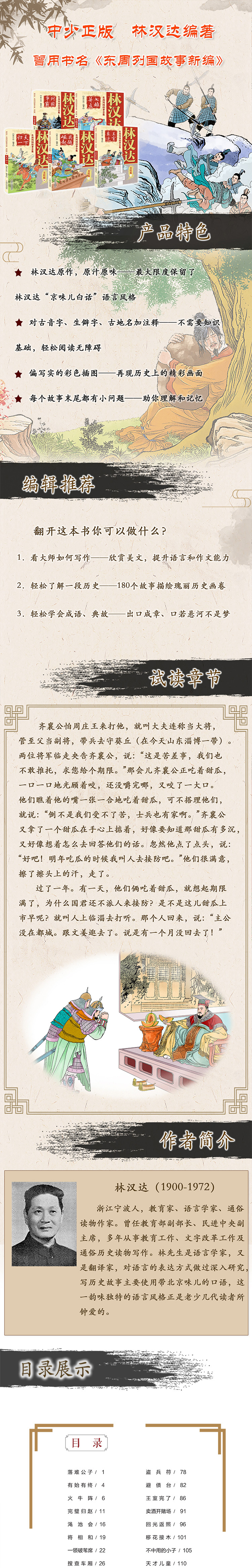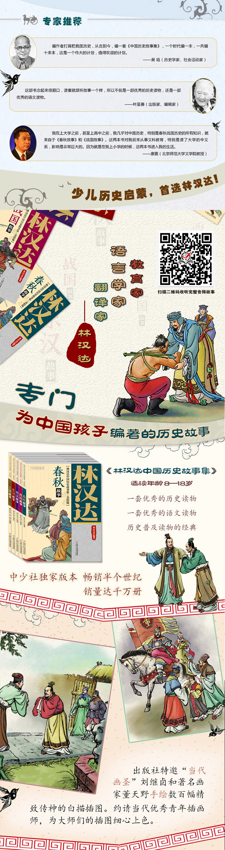 林汉达(1900-1972)浙江宁波人,教育家、语言学家、通俗读物作家。曾任*副部长、民进中央副主席,多年从事教育工作、文字改革工作及通俗历史读物写作。林先生是语言学家,又是翻译家,对语言的表达方式做过深入研究,写历史故事主要使用带北京味儿的口语,这一韵味独特的语言风格正是老少几代读者所钟爱的。