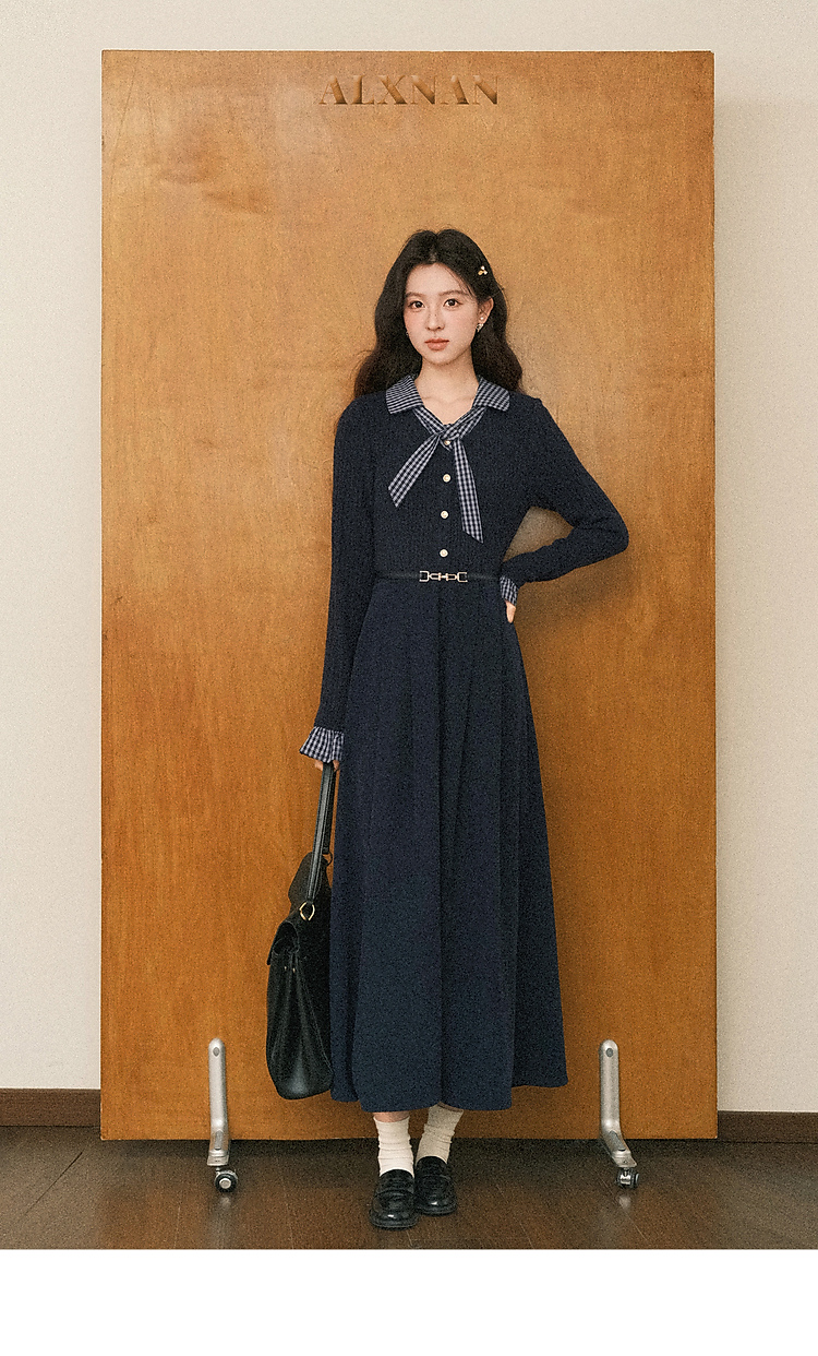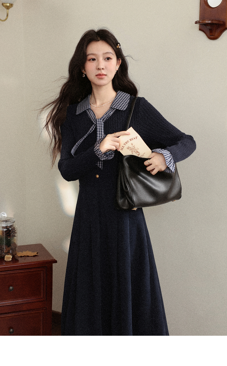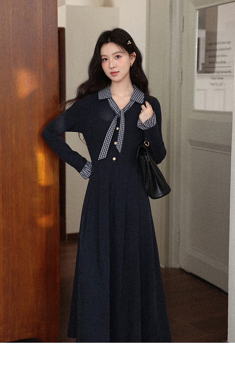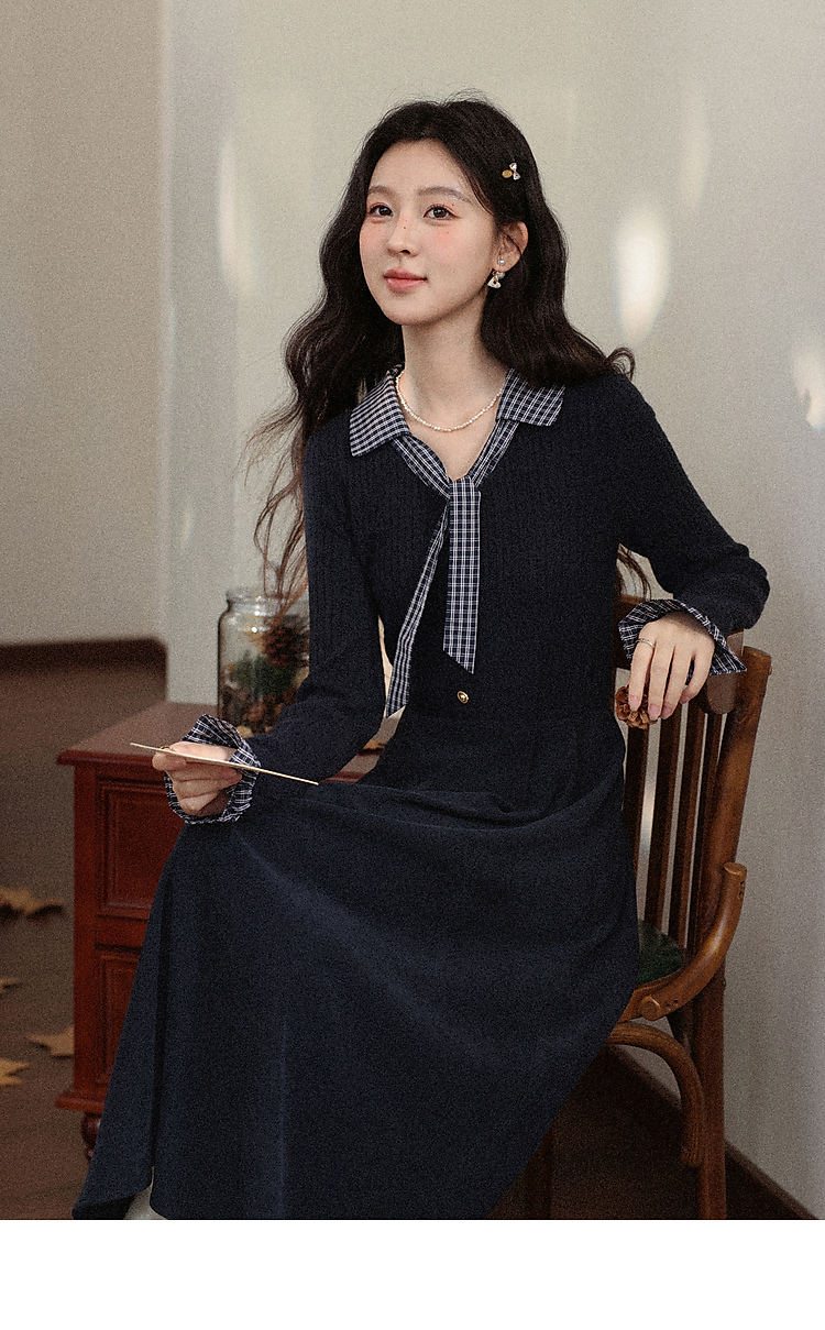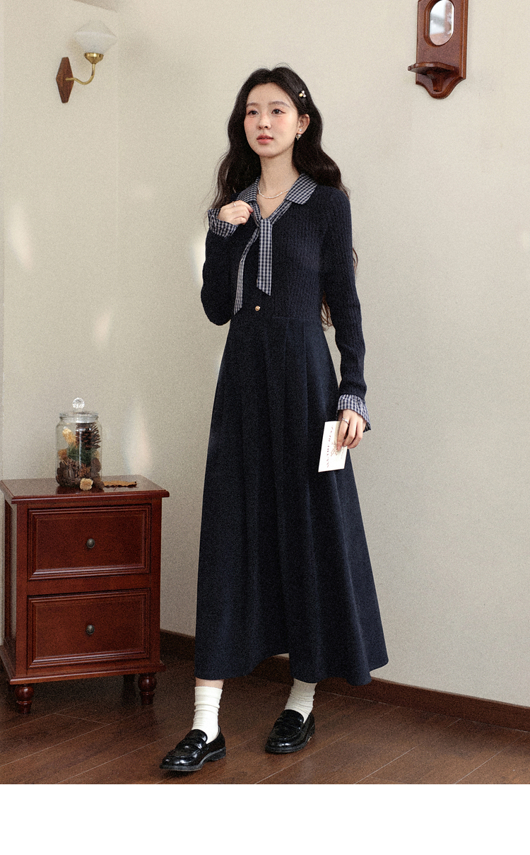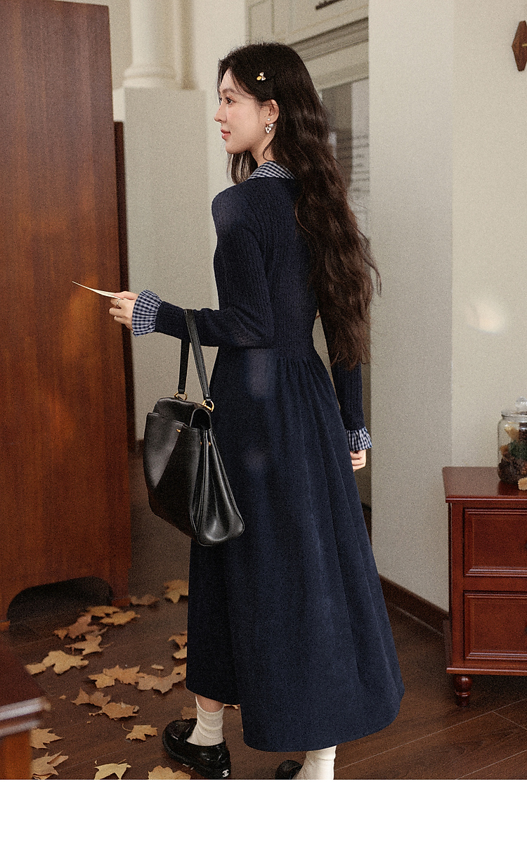 鹿向南「一念清净」韩系气质藏青色连衣裙女秋冬假两件针织打底裙