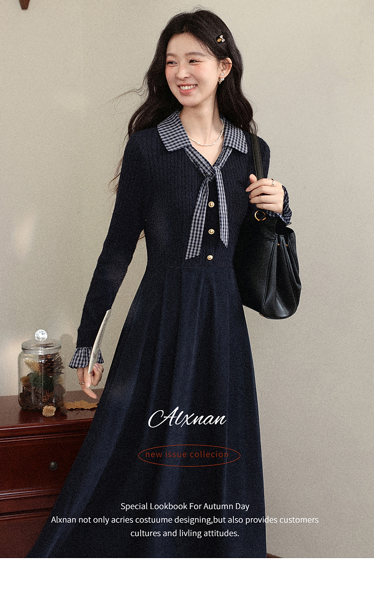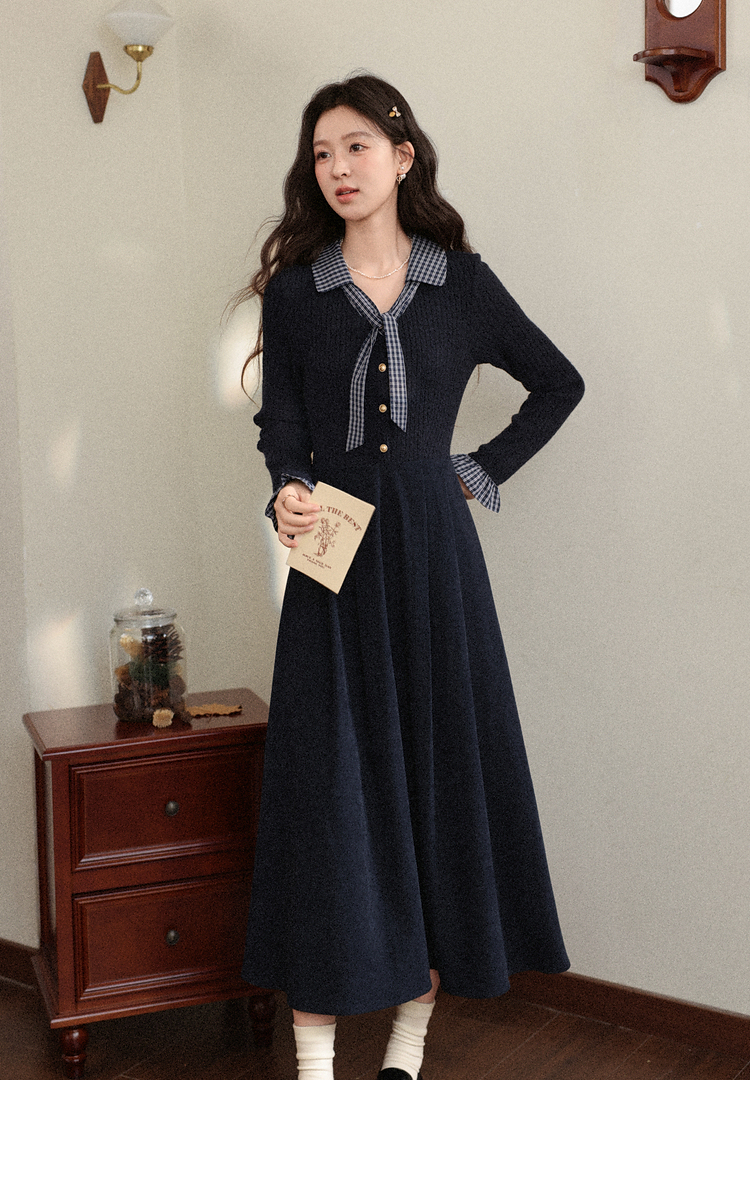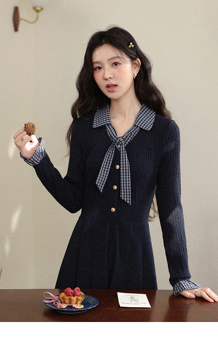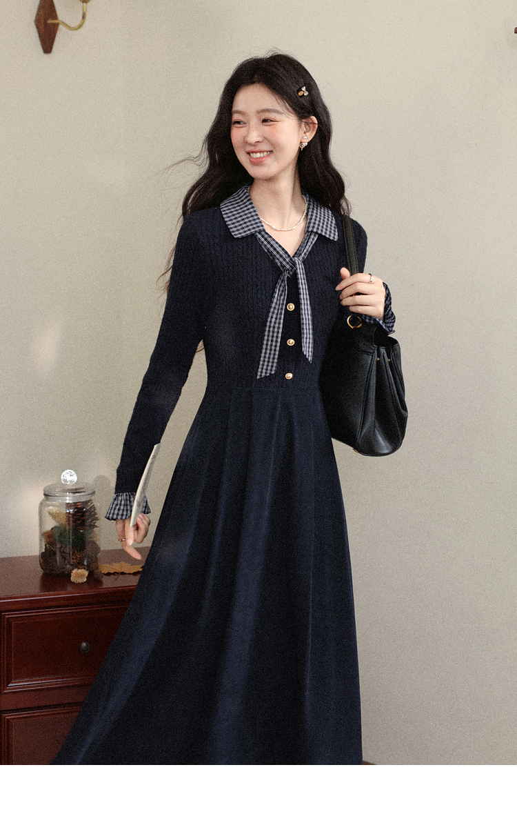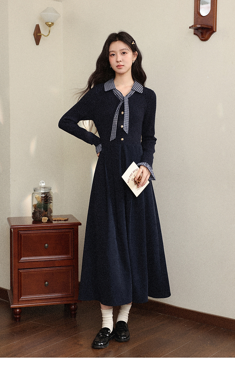 鹿向南「一念清净」韩系气质藏青色连衣裙女秋冬假两件针织打底裙