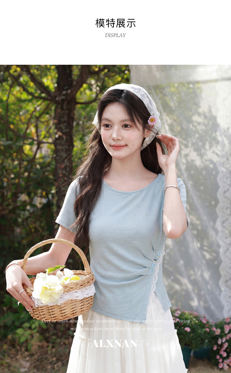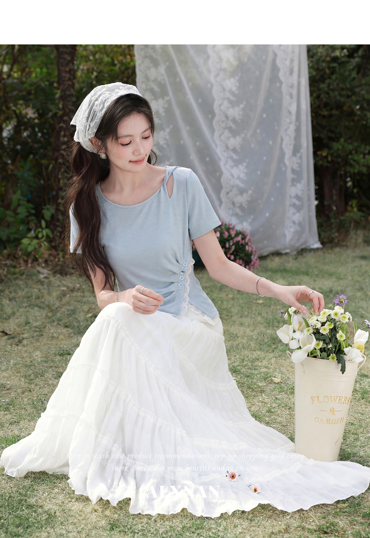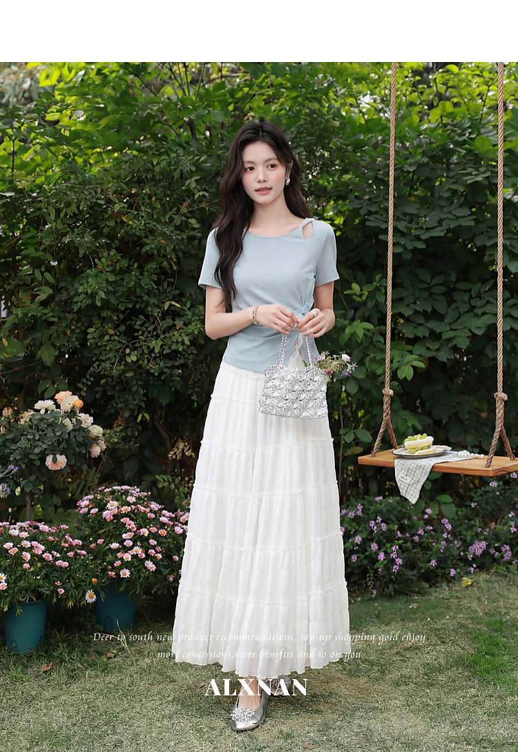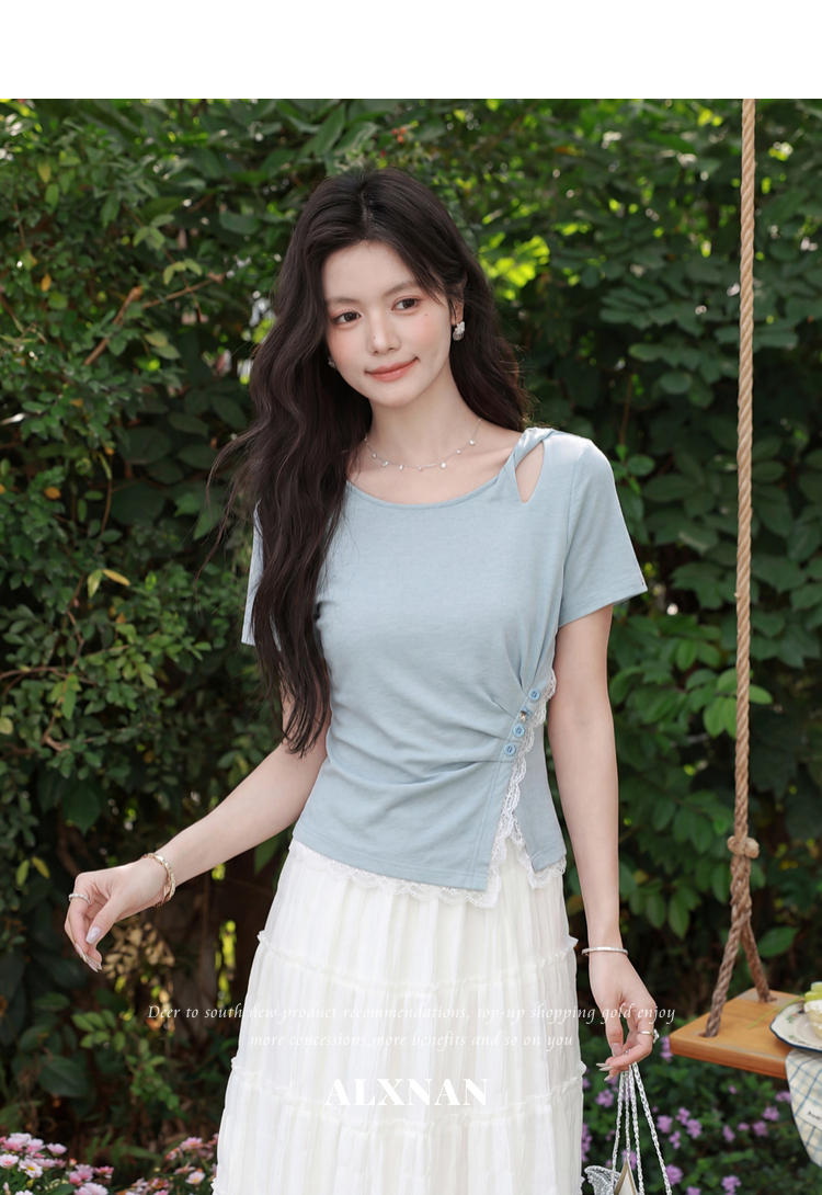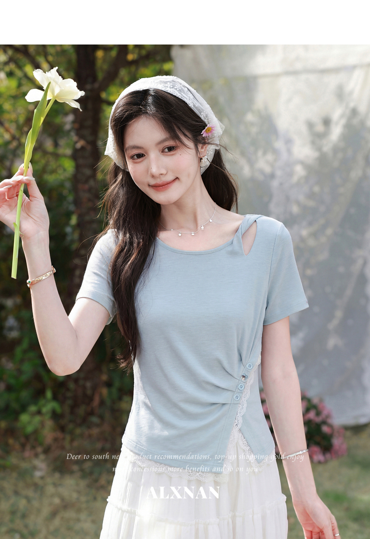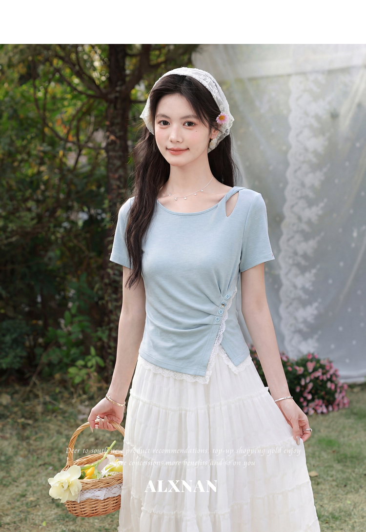 鹿向南「海边情书」设计感蓝色掐腰短袖T恤女夏新款显瘦气质上衣