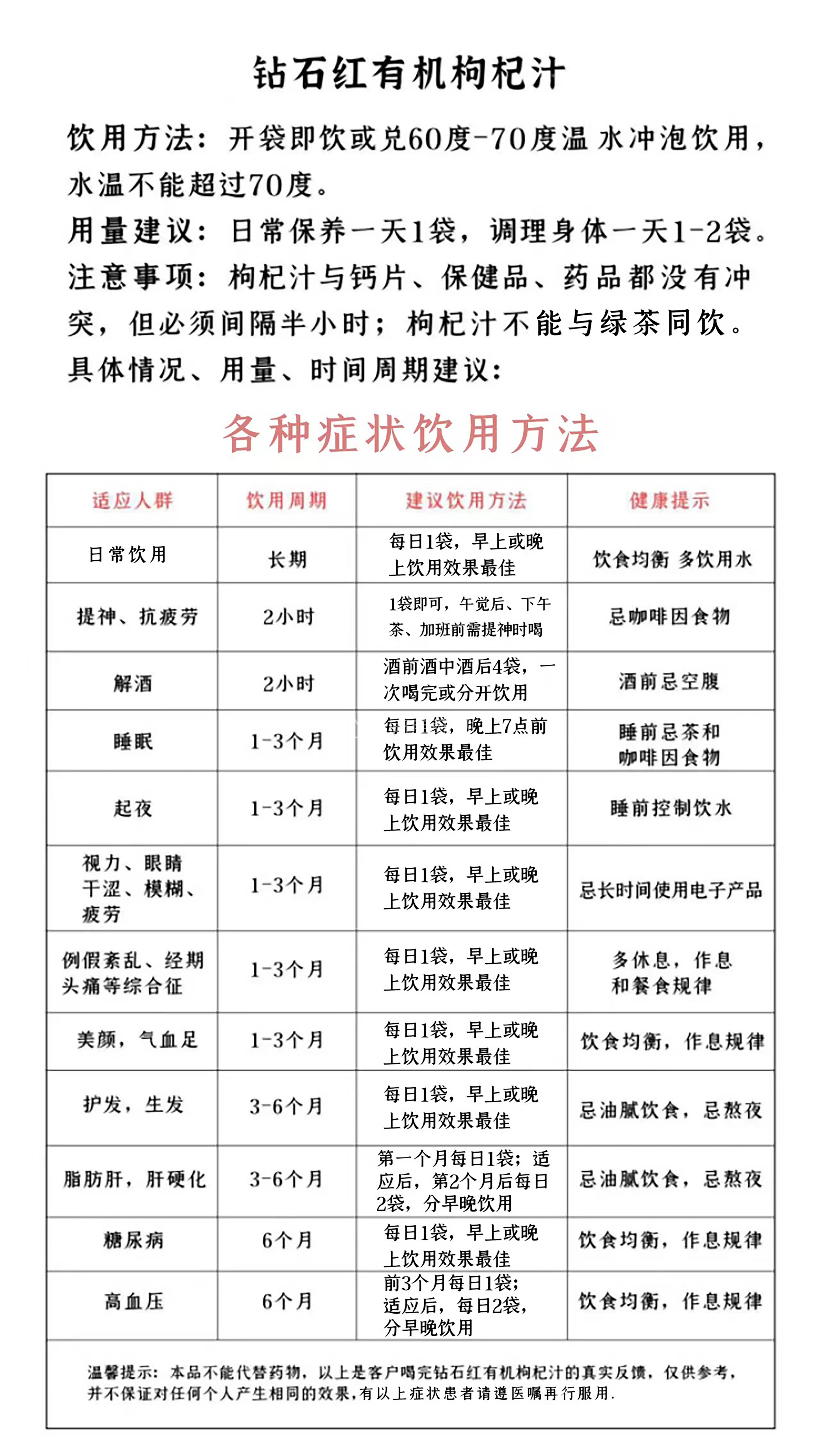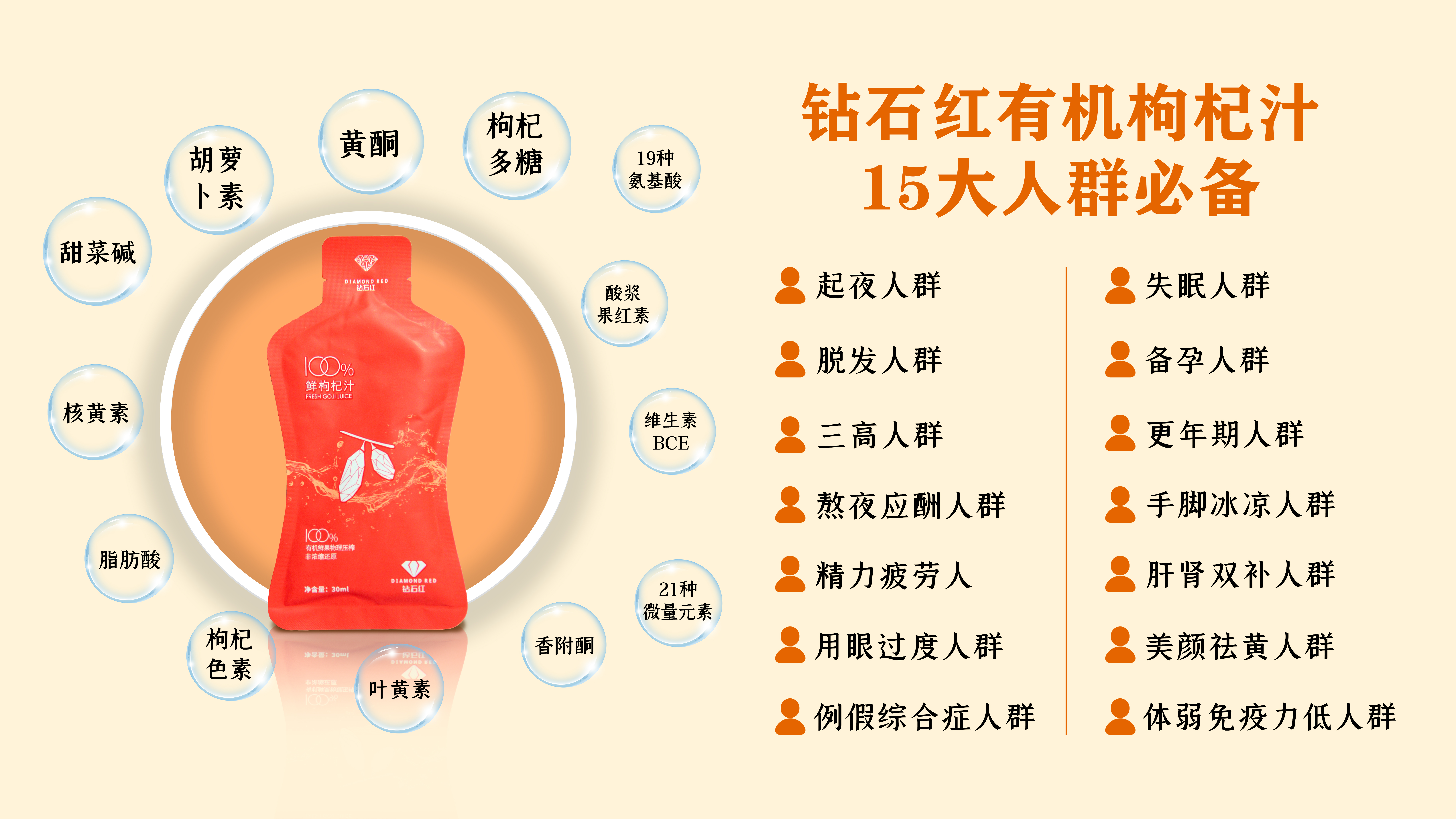 钻石红枸杞汁选用的枸杞是中国最先拿到有机认证的枸杞企业的枸杞,为了保证效果,这些枸杞必须保证没有任何添加剂,对于工厂的要求也是极致的高,采摘的果子坏果率需要达到千分之一以下,采摘6小时必须加工成汁,在此期间的温度把控,均质时间,灭菌温度都需要层层把控,用了自己的工厂,才做出这样高品质的有机枸杞汁。