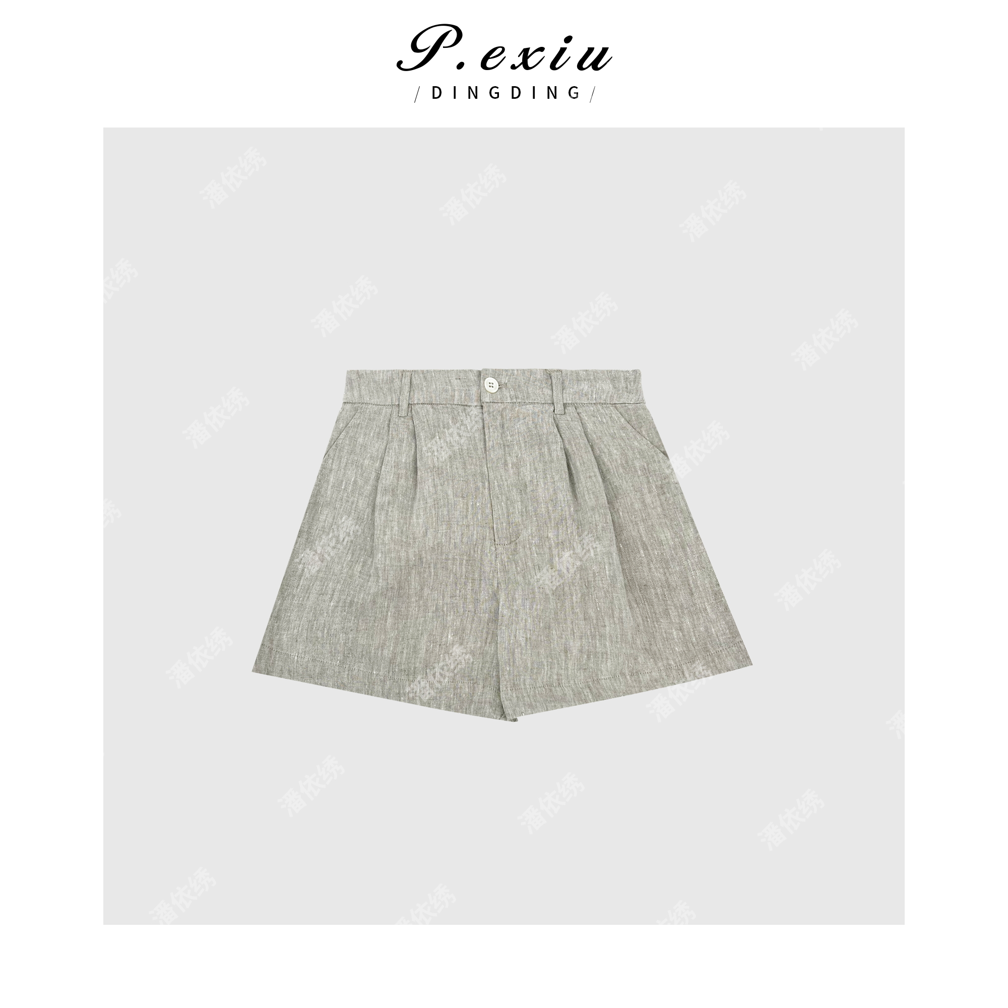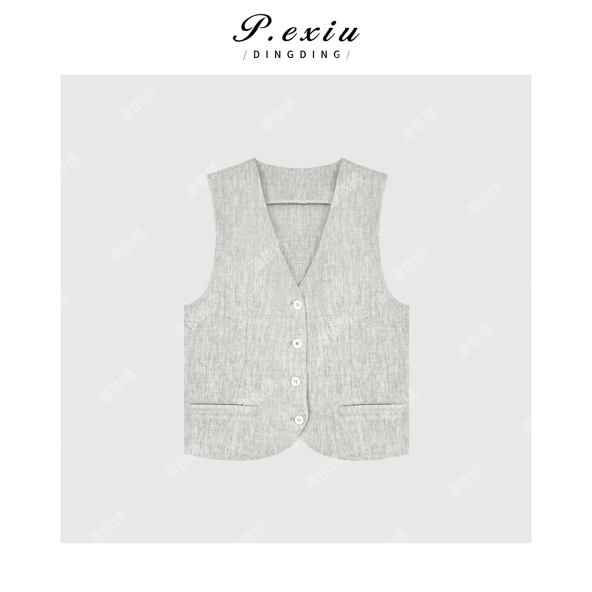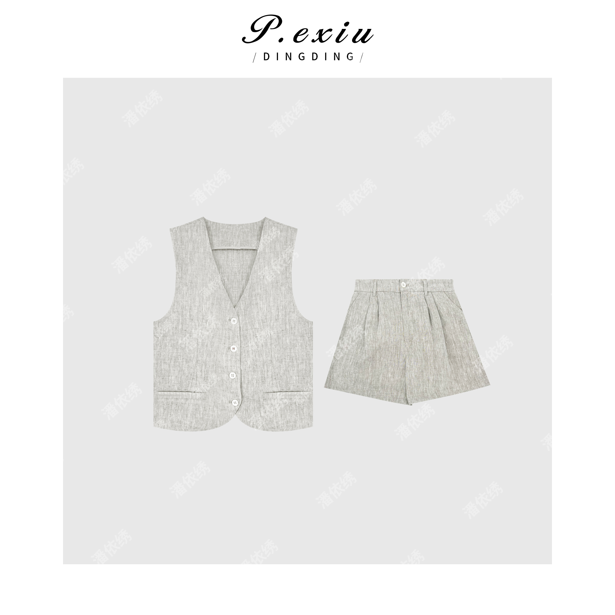 04-3潘依绣丁丁宠粉亚麻简约通勤V领马甲休闲短裤套装 Q0701