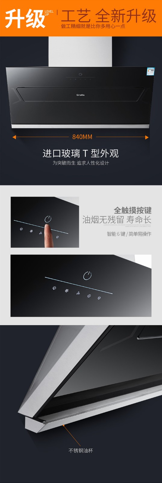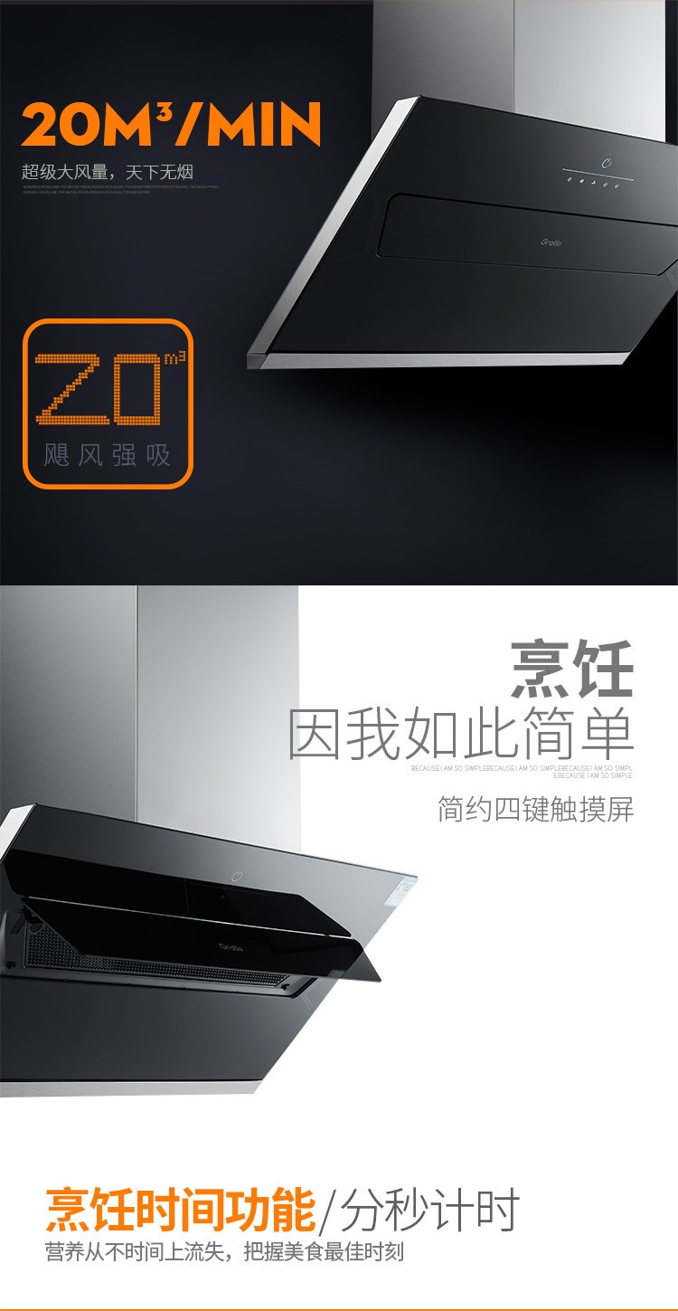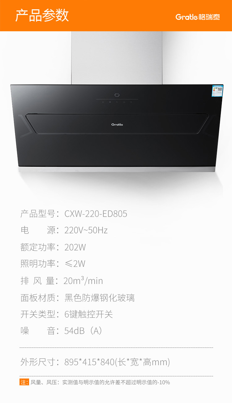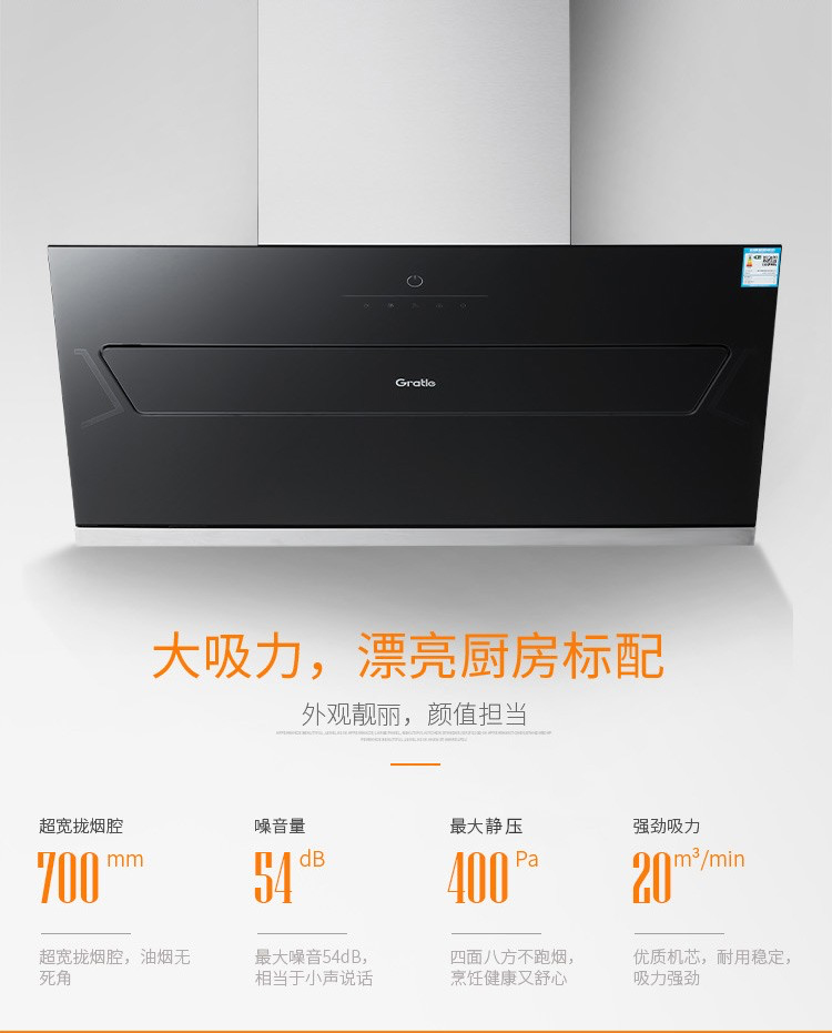 格瑞泰CXW-220-ED805高端全自动家用强力大风量无缝集烟腔油烟
