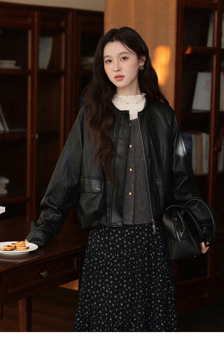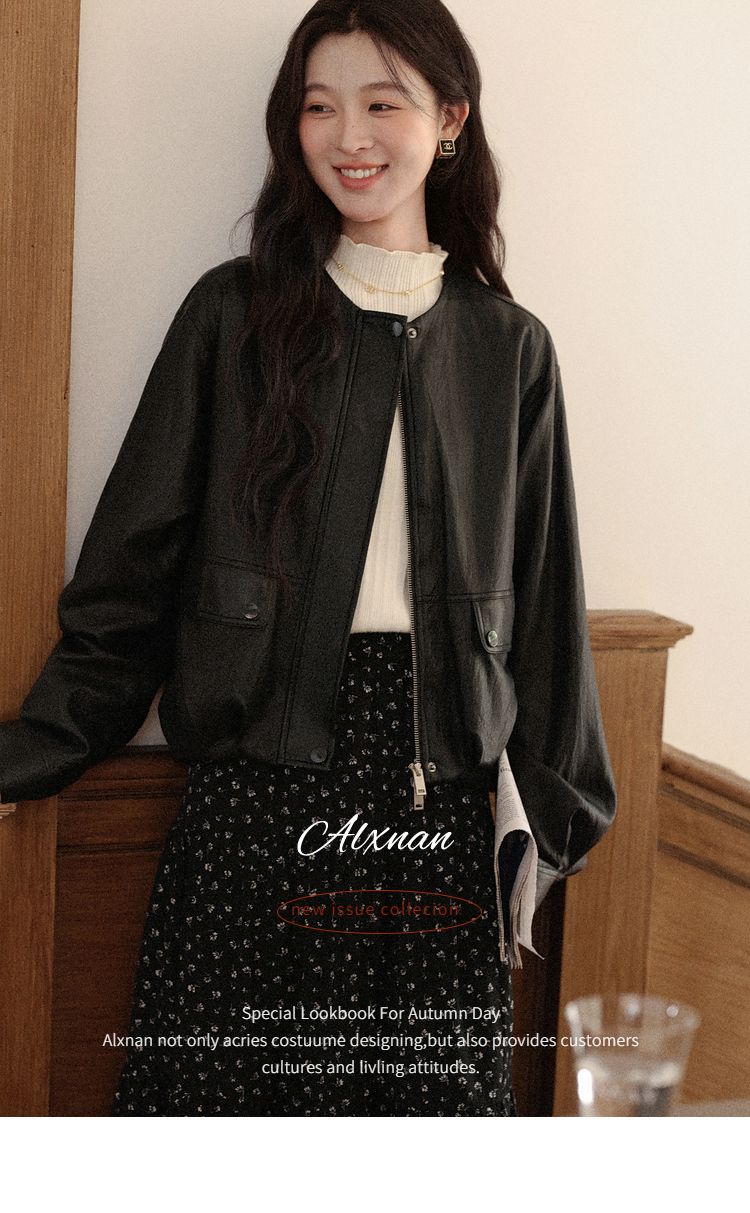 鹿向南「威尼斯诗行」高级感黑色圆领通勤皮衣秋季新款简约外套女