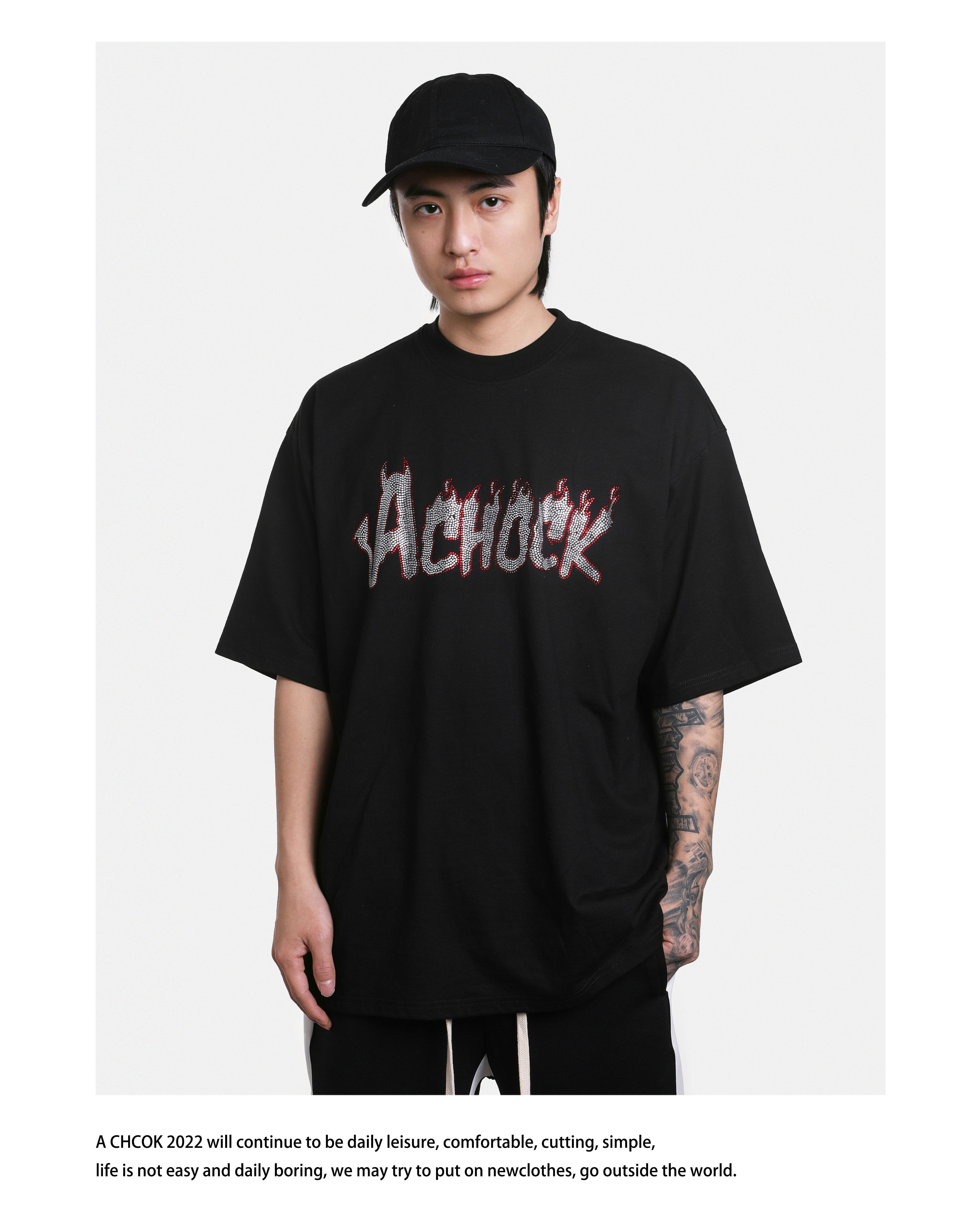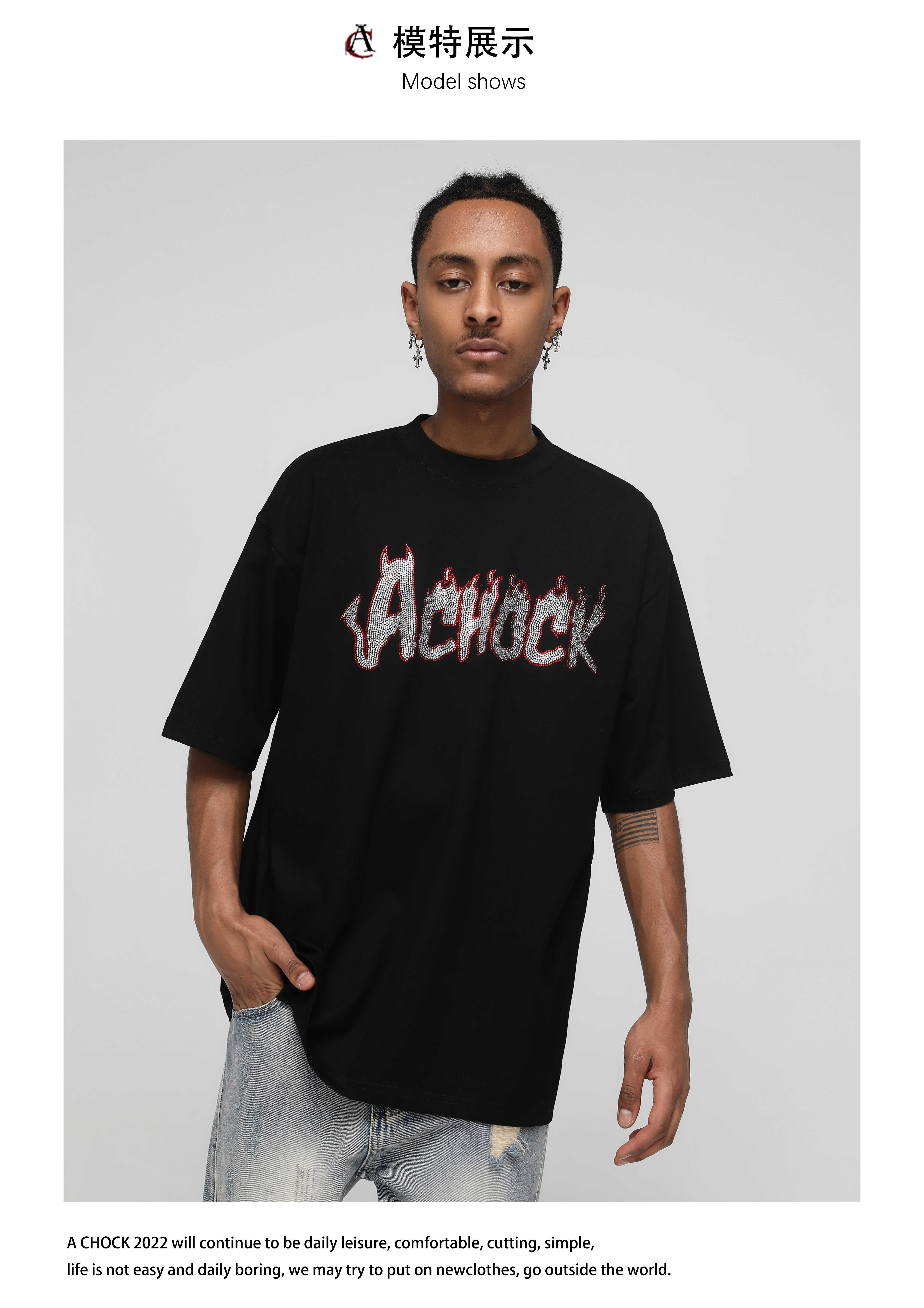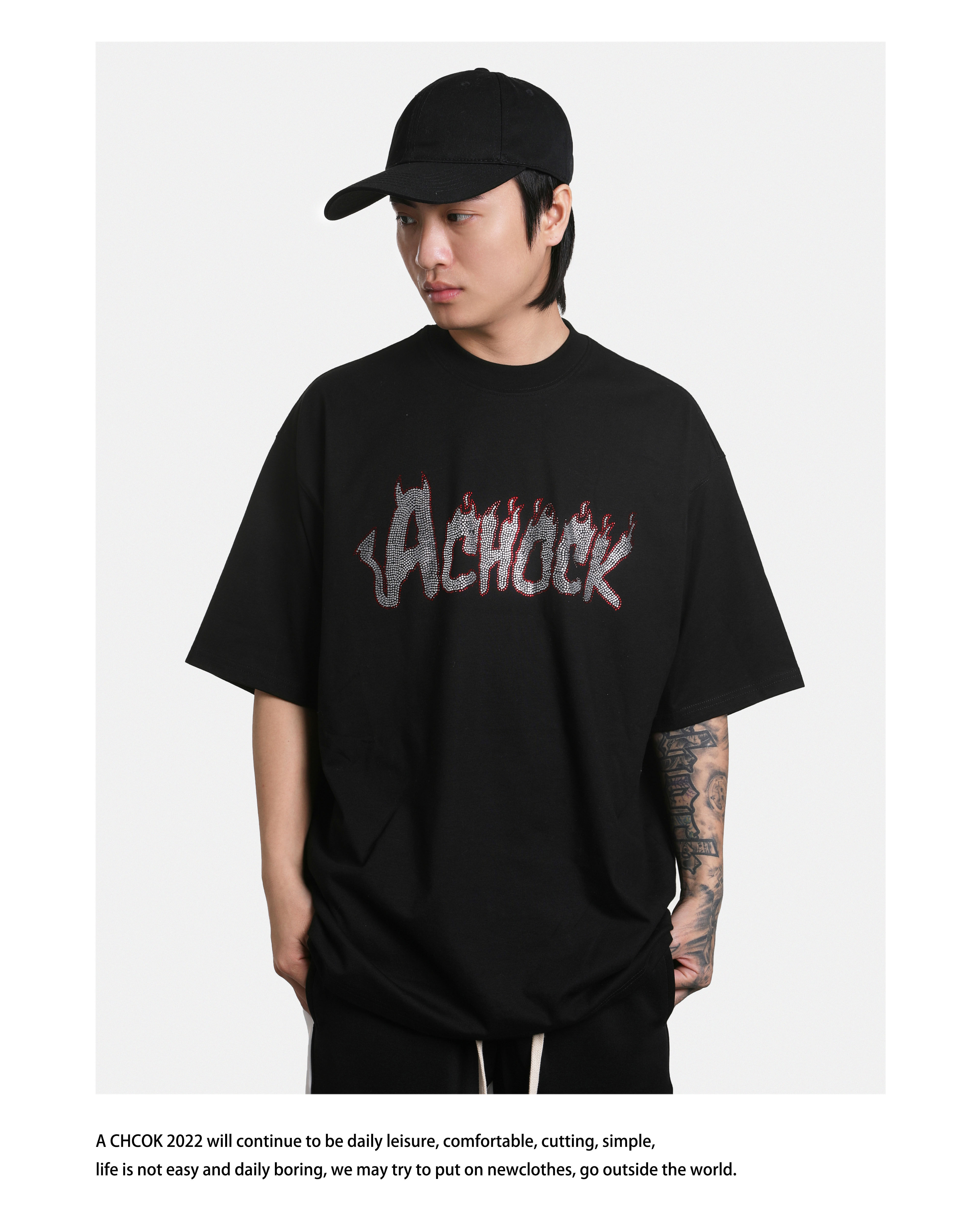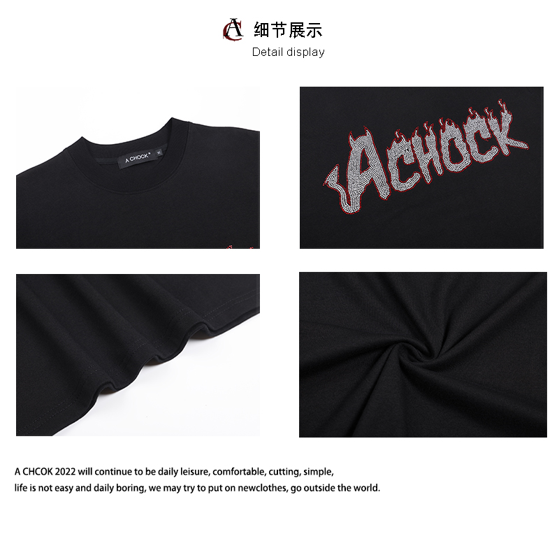 【Achock官方店】国潮创意logo烫钻火焰刺绣t恤2022夏圆领短袖男