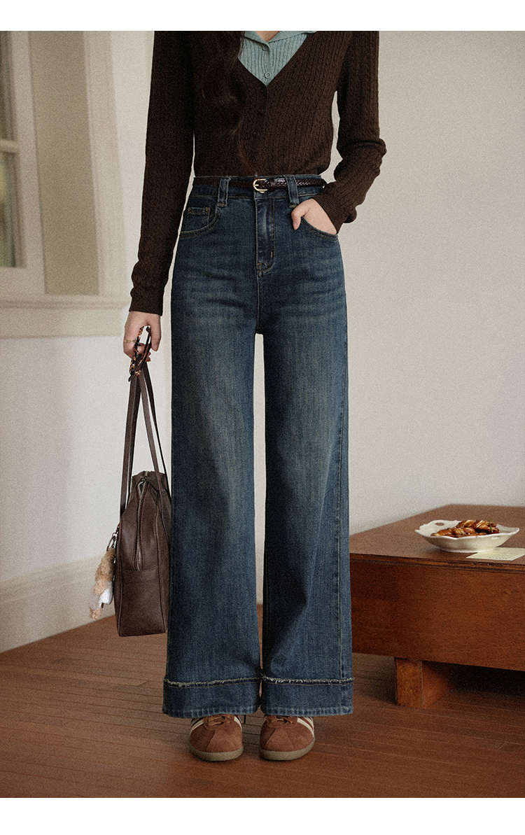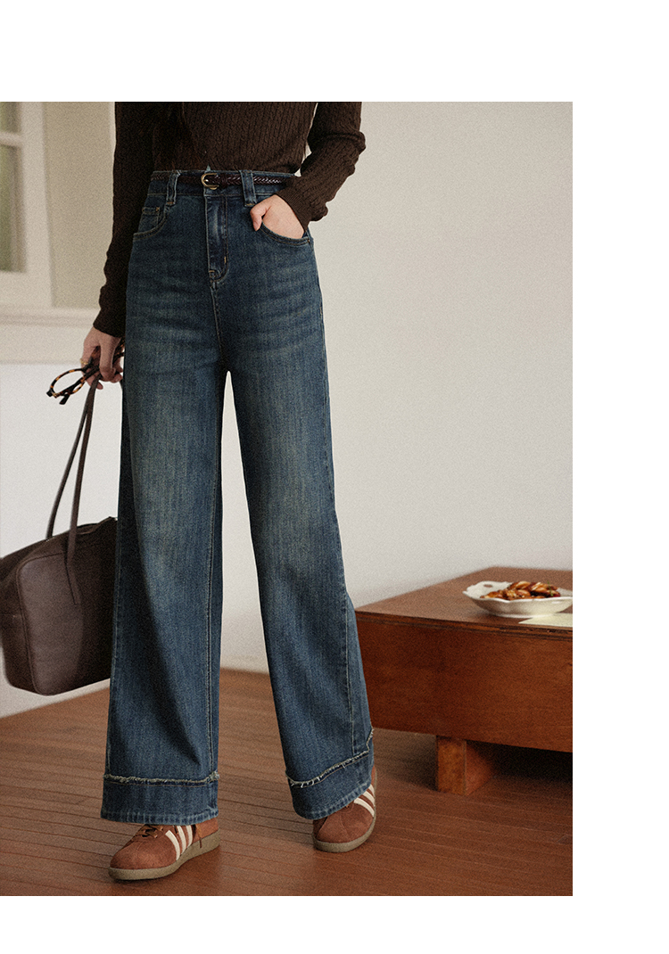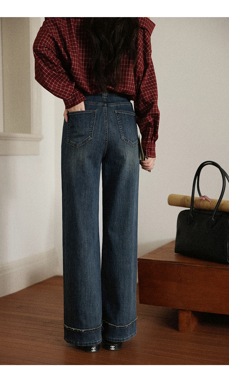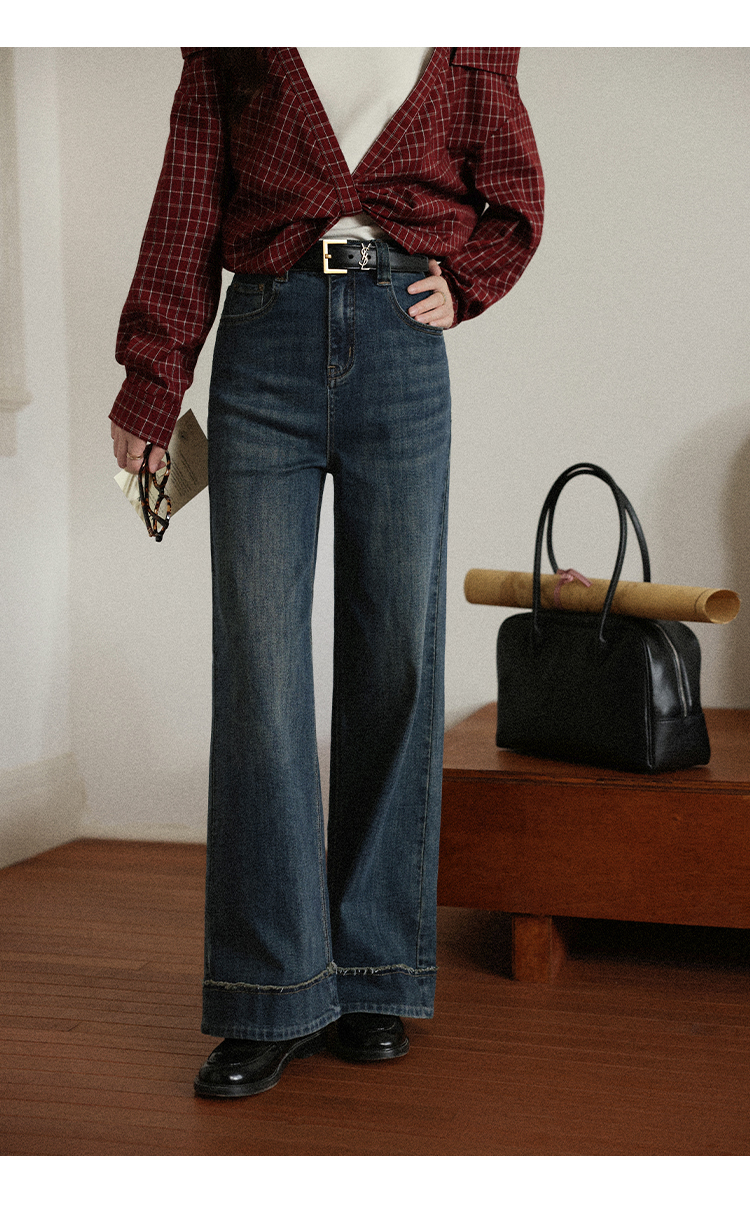 鹿向南「旧岁柔波」复古深蓝色牛仔裤女早秋新款休闲阔腿直筒长裤