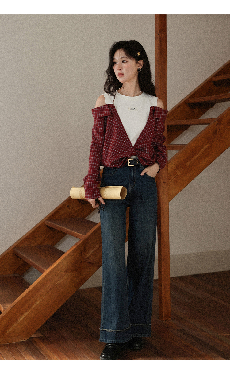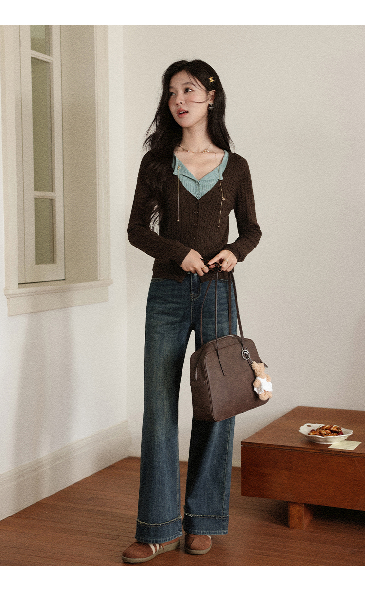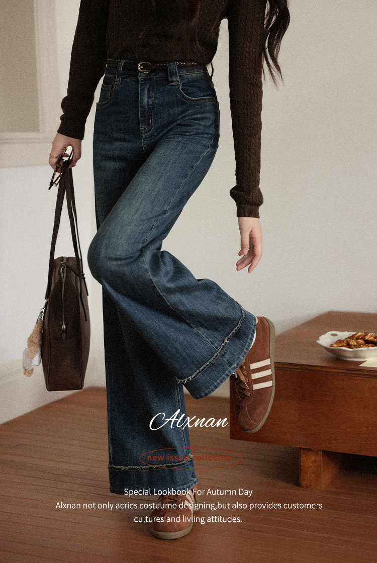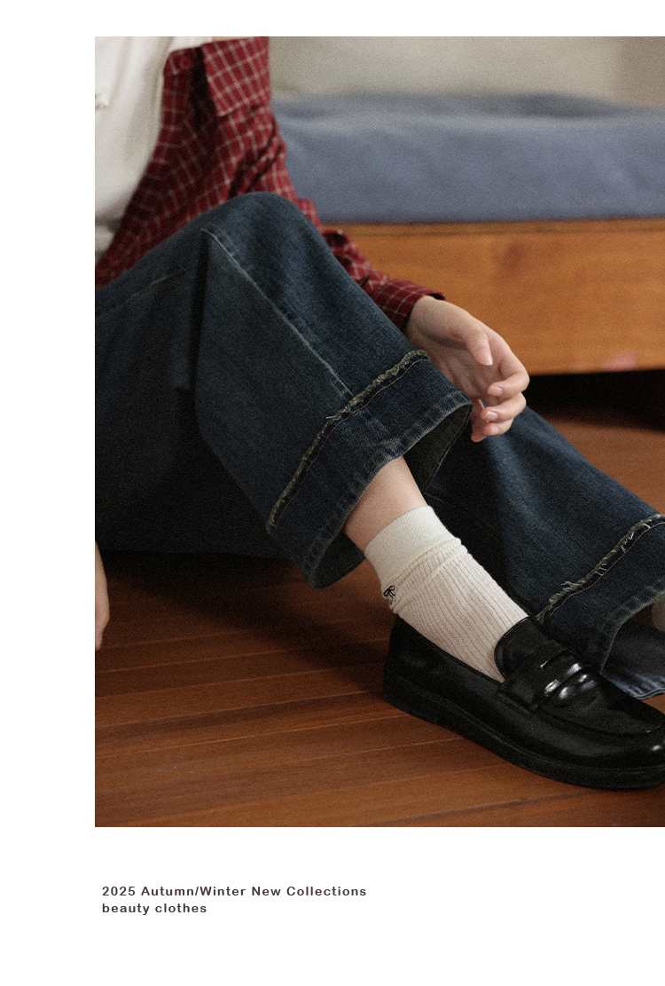 鹿向南「旧岁柔波」复古深蓝色牛仔裤女早秋新款休闲阔腿直筒长裤