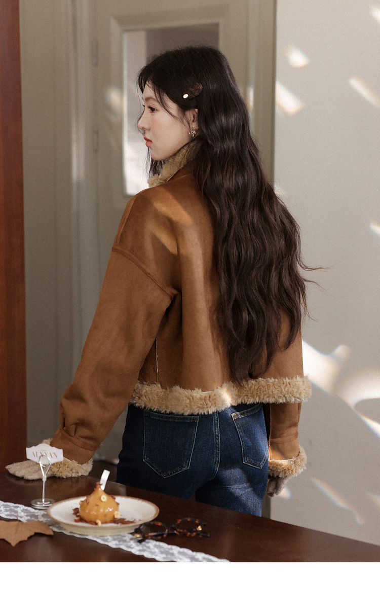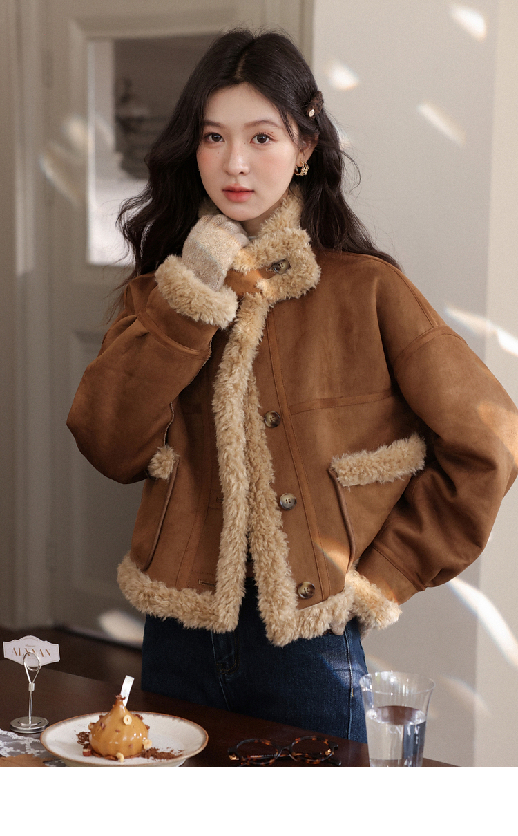 鹿向南「焦糖可颂」美拉德咖色短款外套女冬宽松皮毛一体保暖上衣