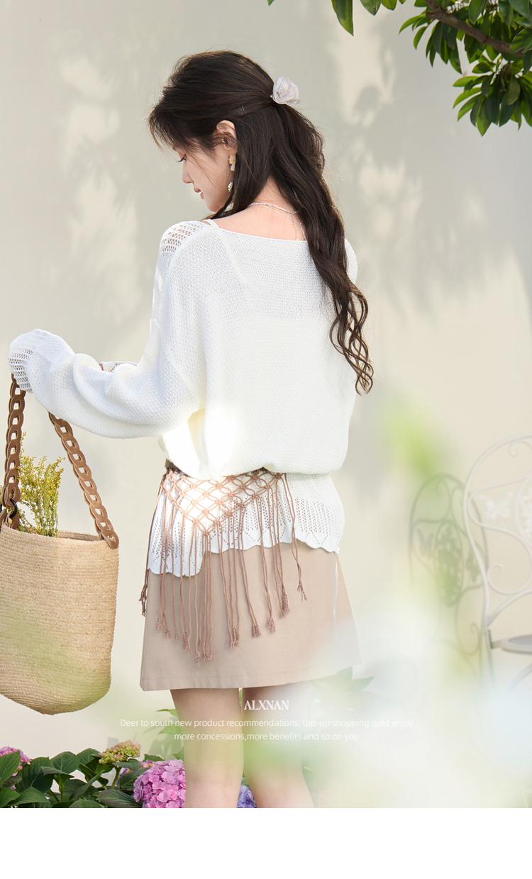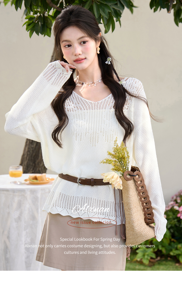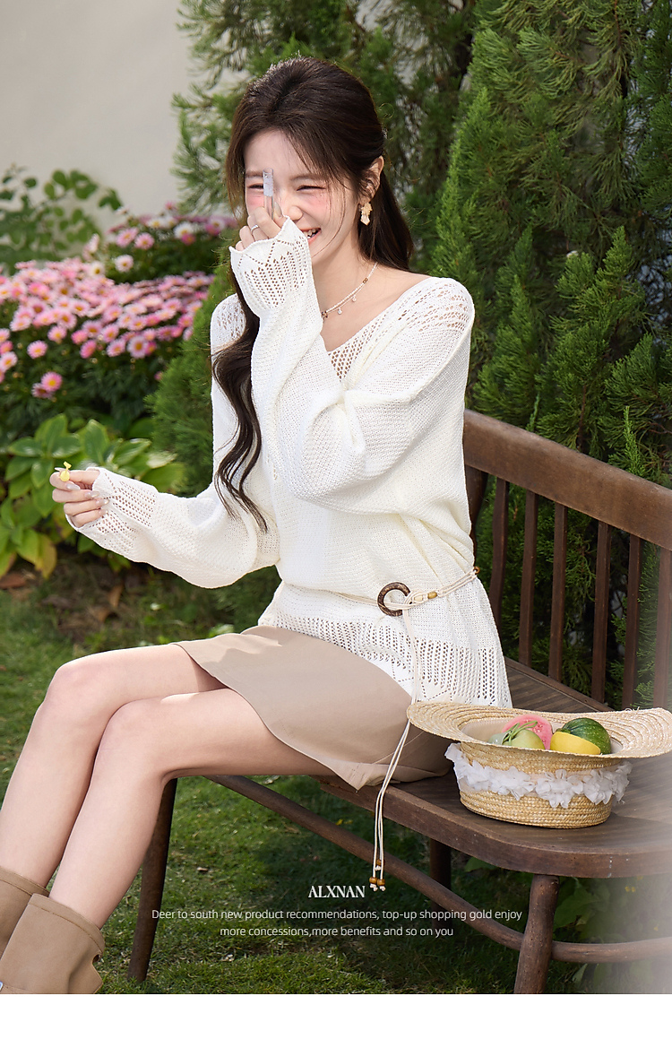 鹿向南「山茶叙春」法式镂空浅杏色慵懒感针织衫女春新款长袖上衣
