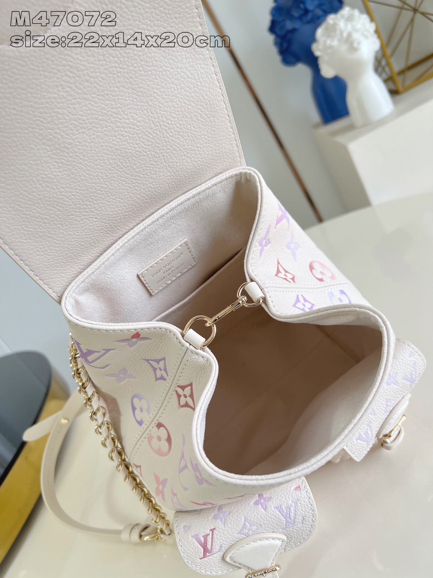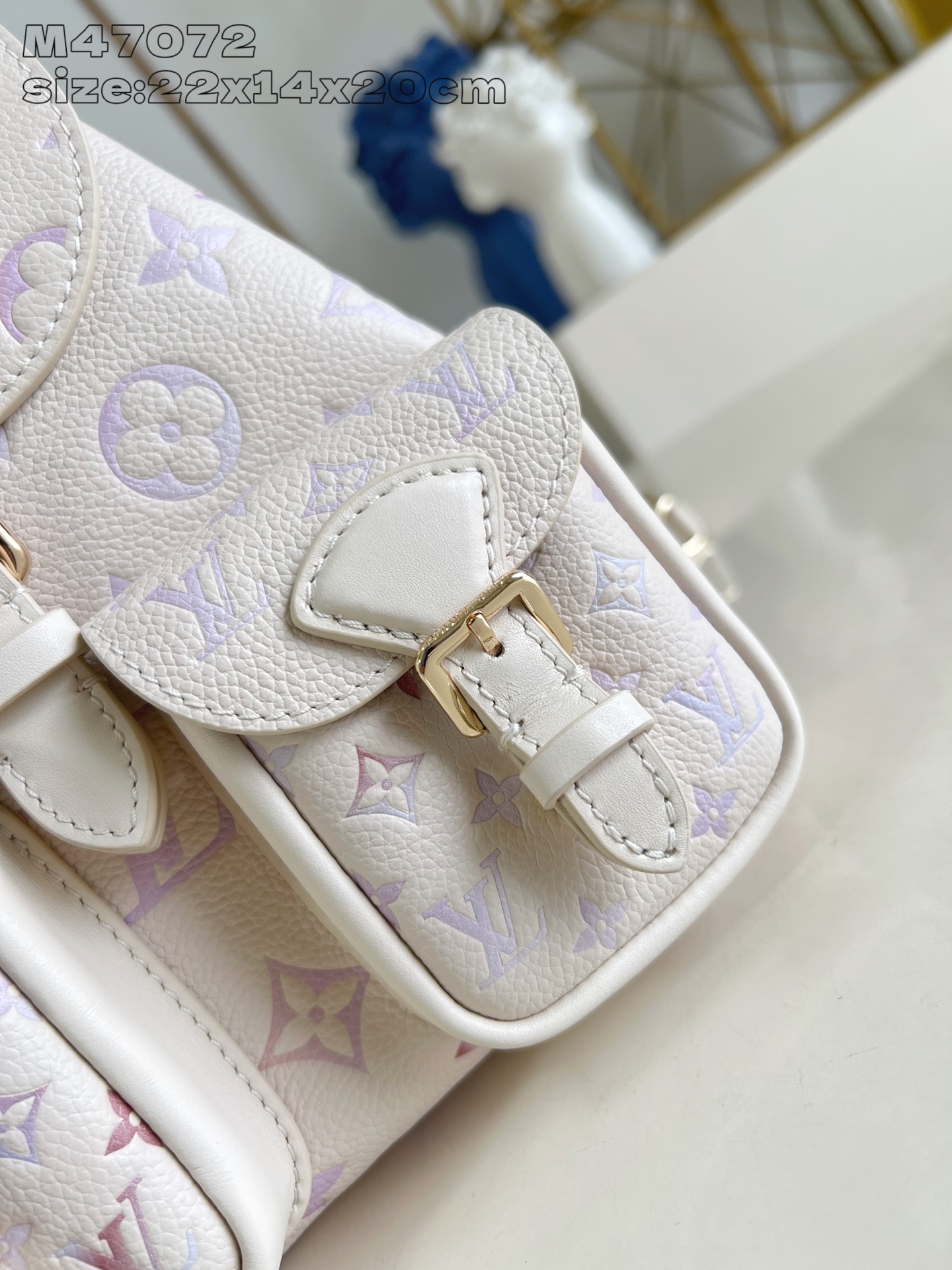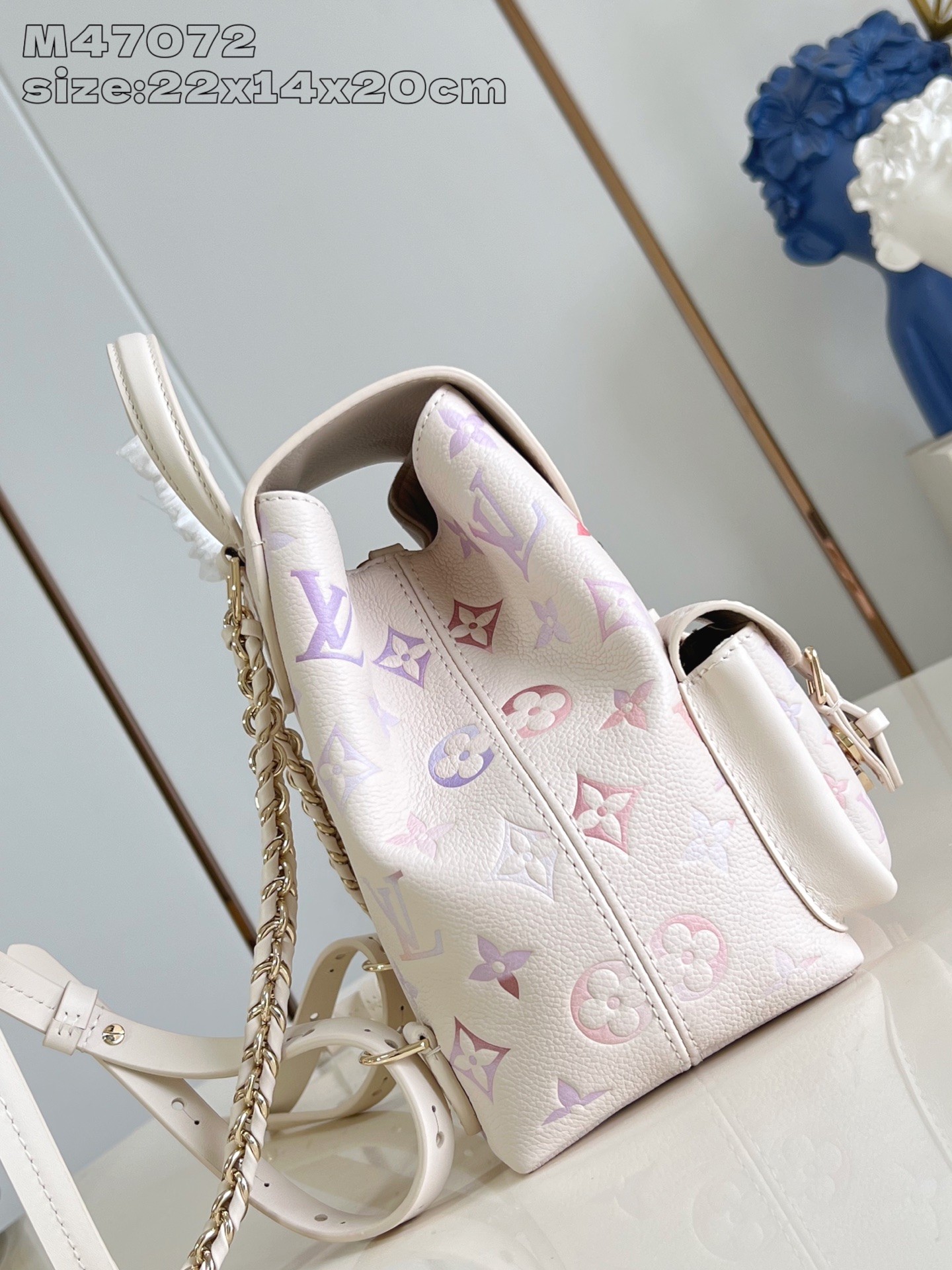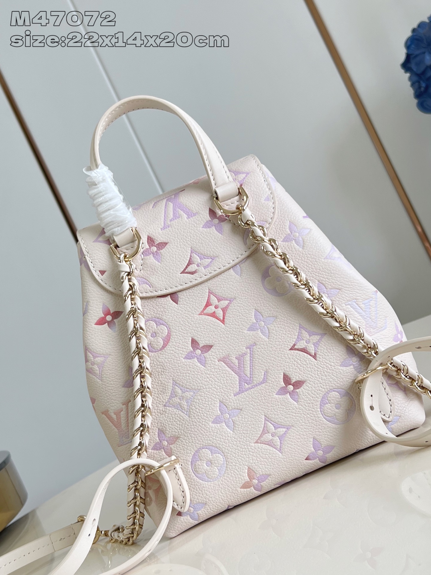 【独家实拍 M47072彩色渐变 】M15113 本款 Backup 双肩包出自 Dream 系列,为 Monogram 压纹粒面皮革渲染别致水彩渐变效果,搭配编织链条和莹泽金属件。翻盖前袋融入磁扣开合,可稳妥收纳小件物品。22 x 14 x 20 厘米 (高 x 宽 x 长度)