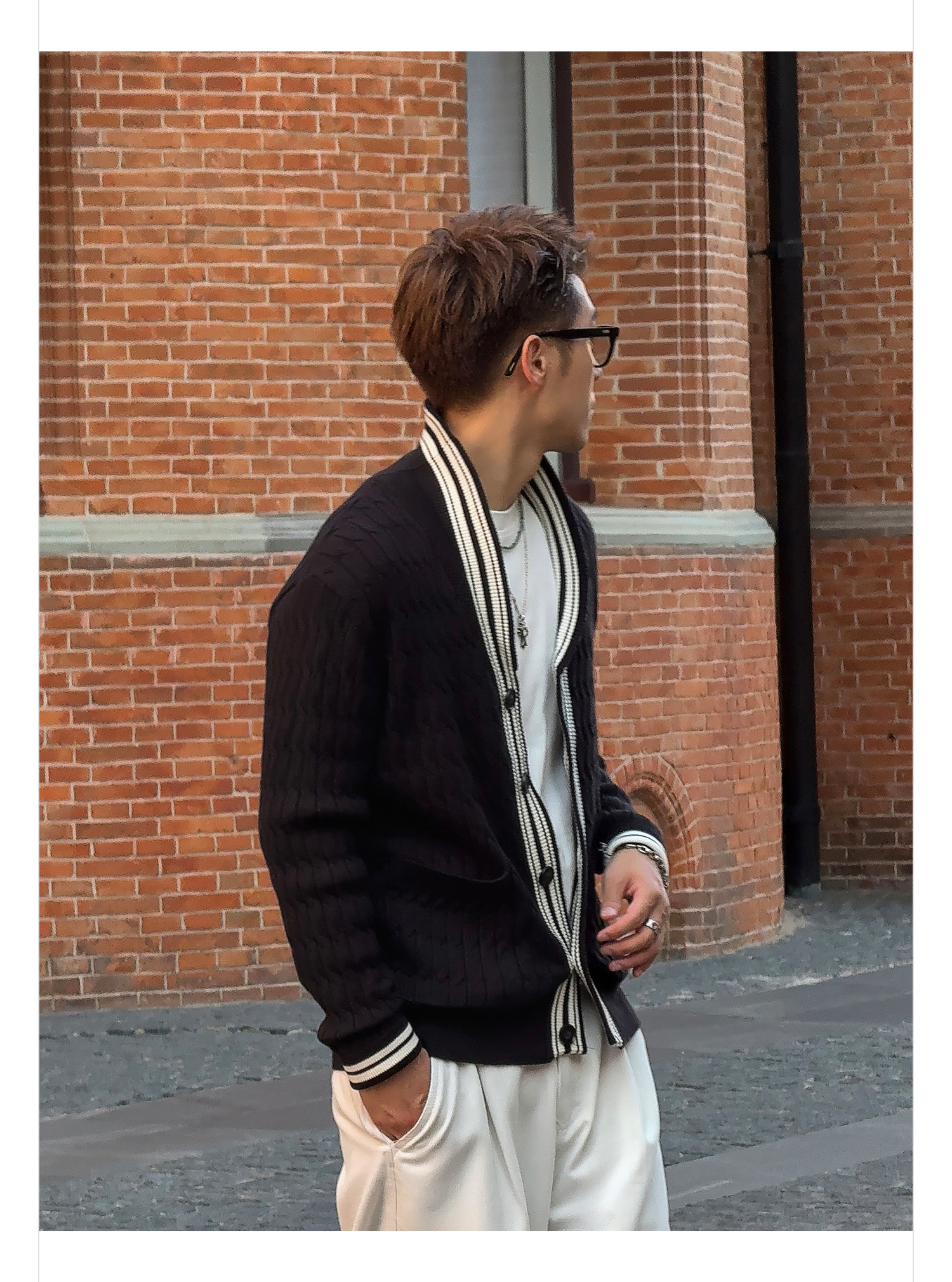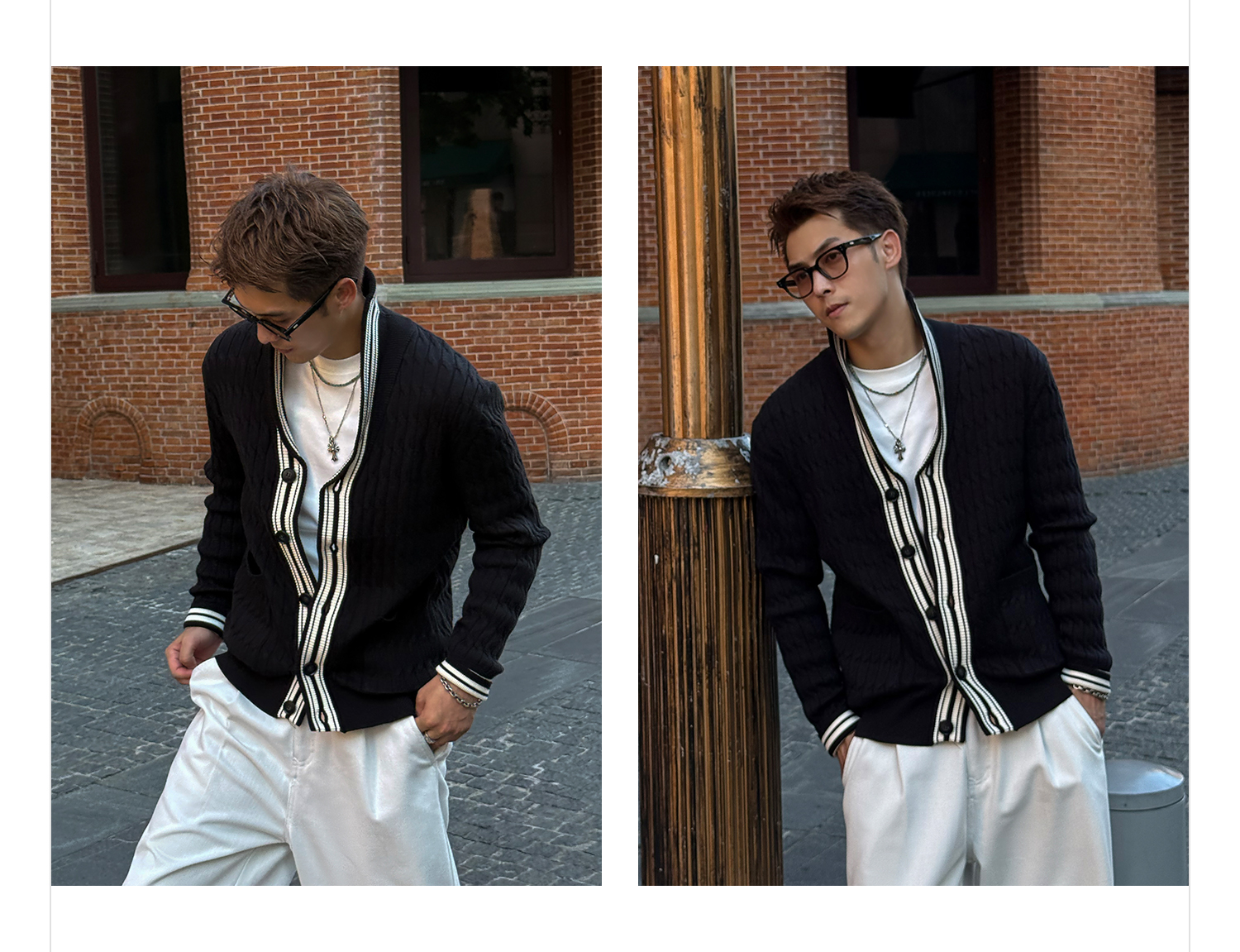 徐太浪【设计拼色 暗花格纹】高级感V领针织衫外套男秋冬开衫毛衣