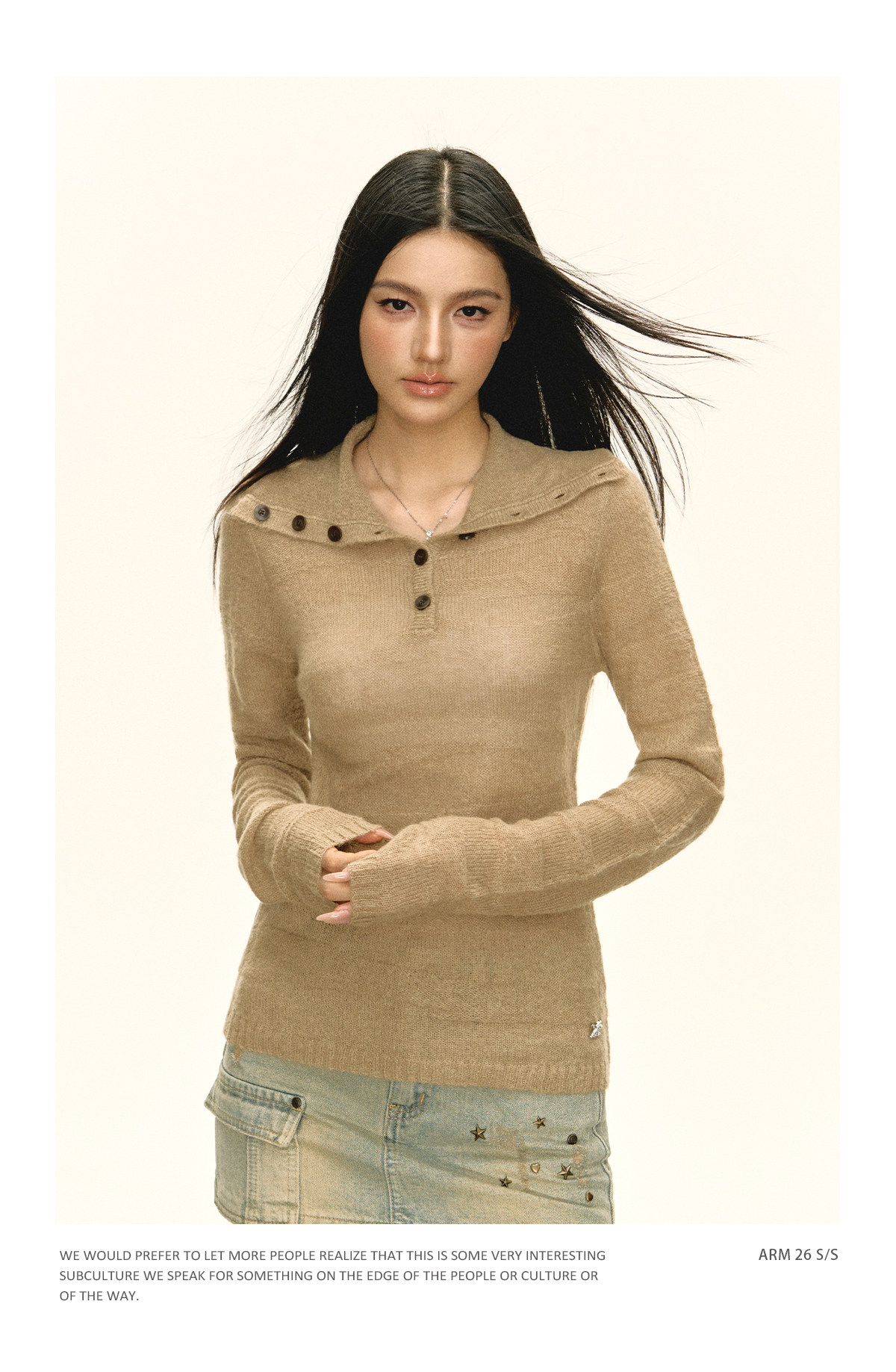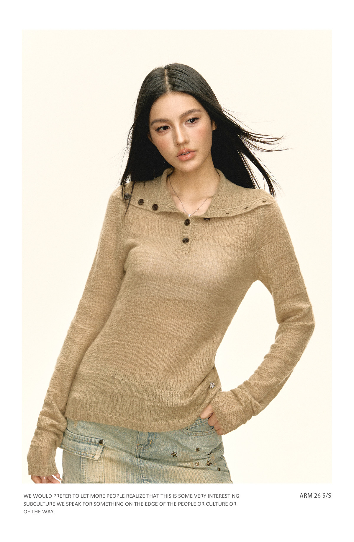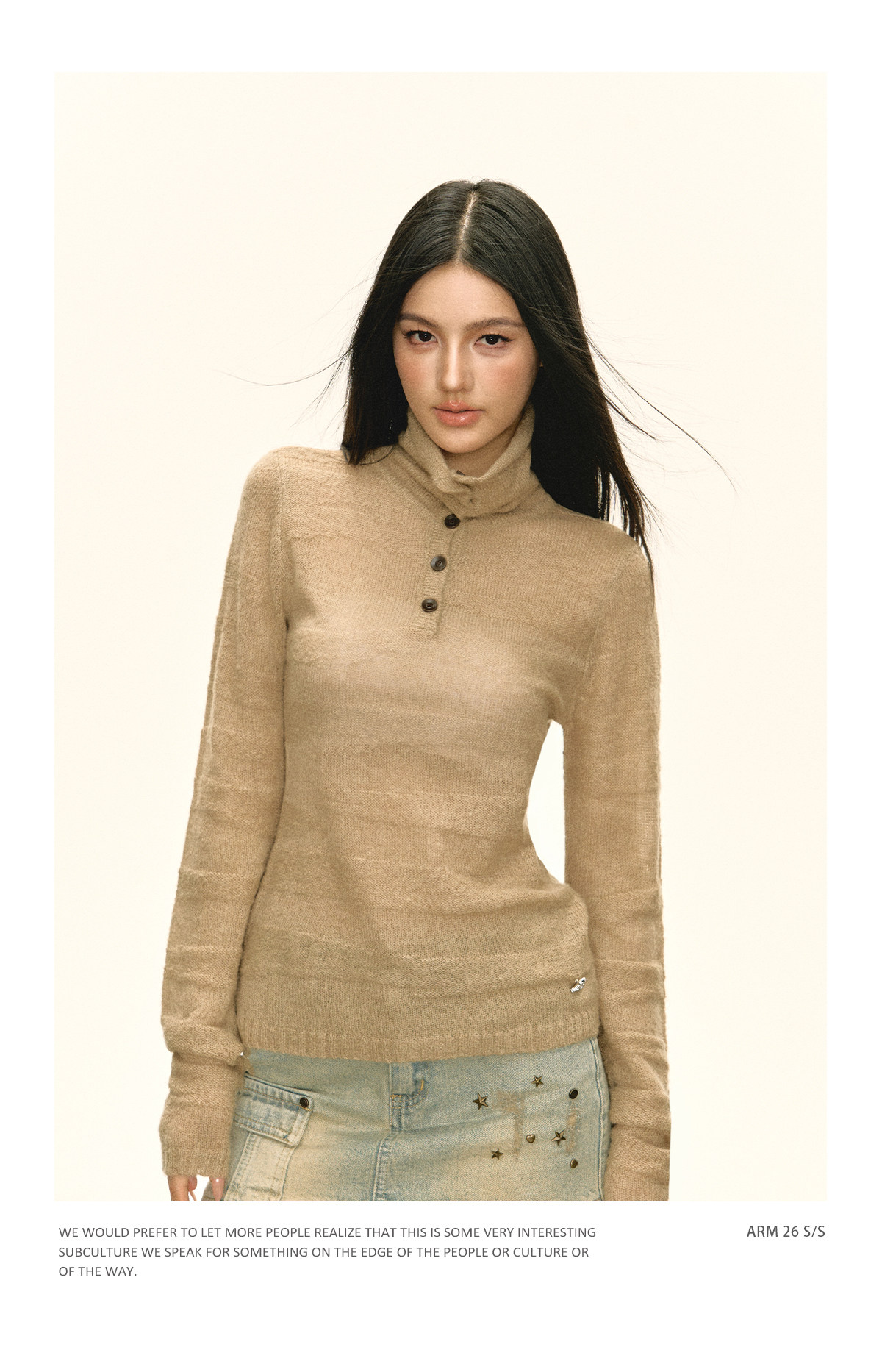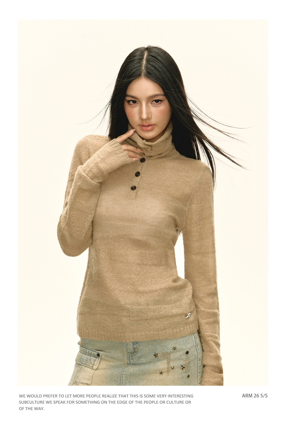 Ariseism 美式复古设计感卡其色纽扣高领针织衫女春秋新款毛衣
