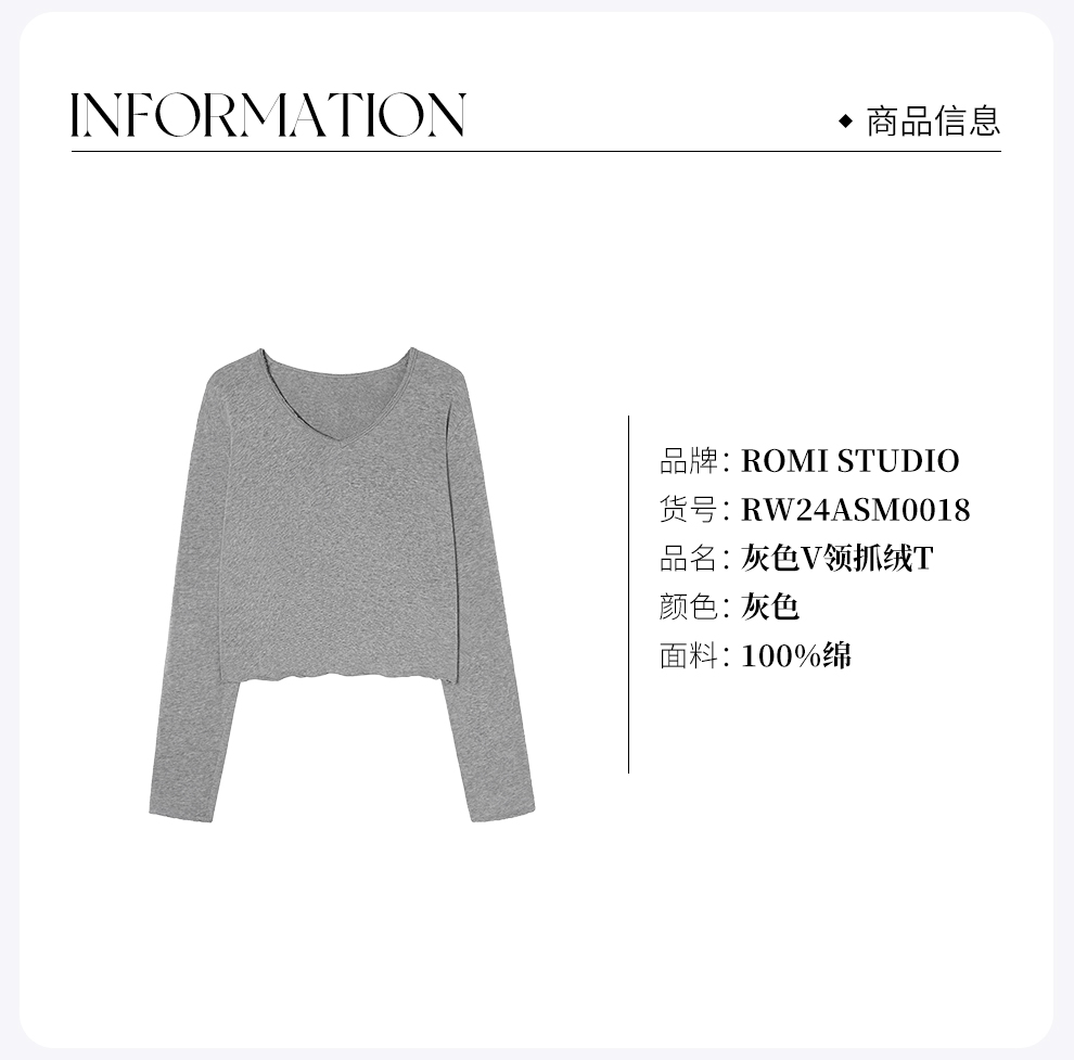 ROMI STUDIO“格雷优雅”100棉V领磨毛抓绒卷边长袖T恤 RW24ASM0018