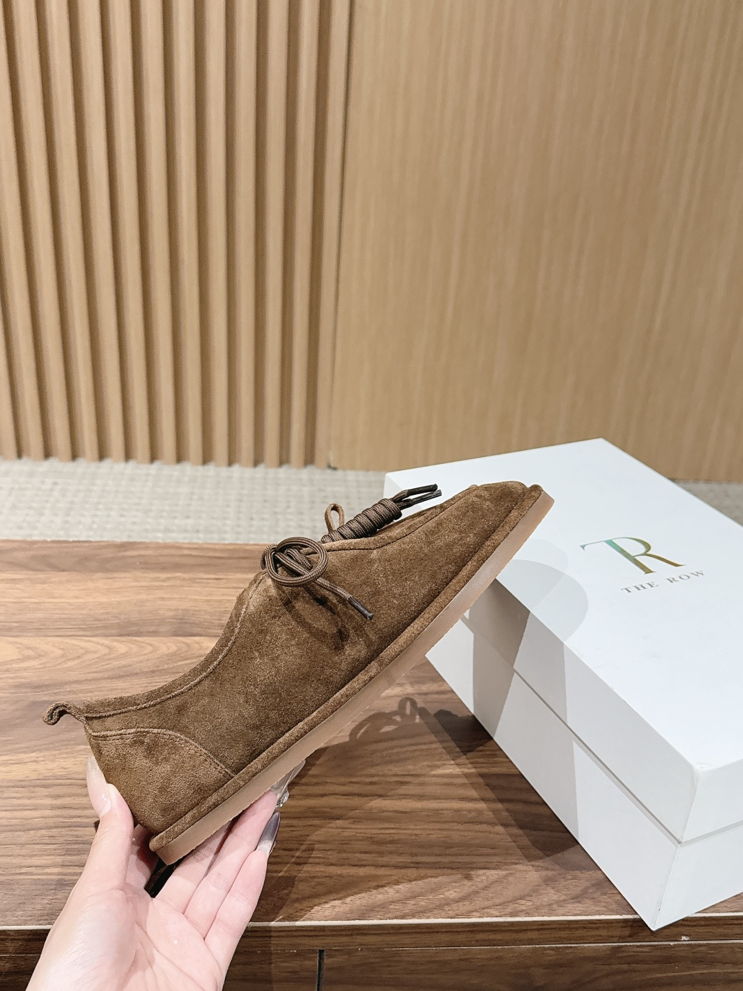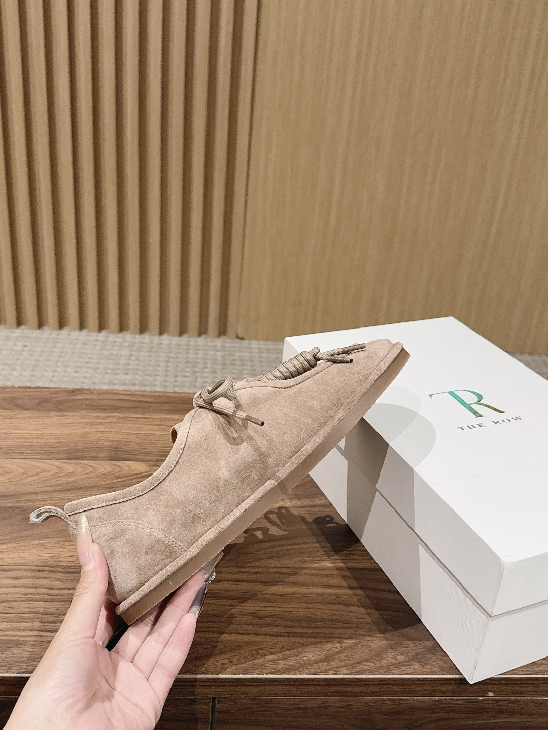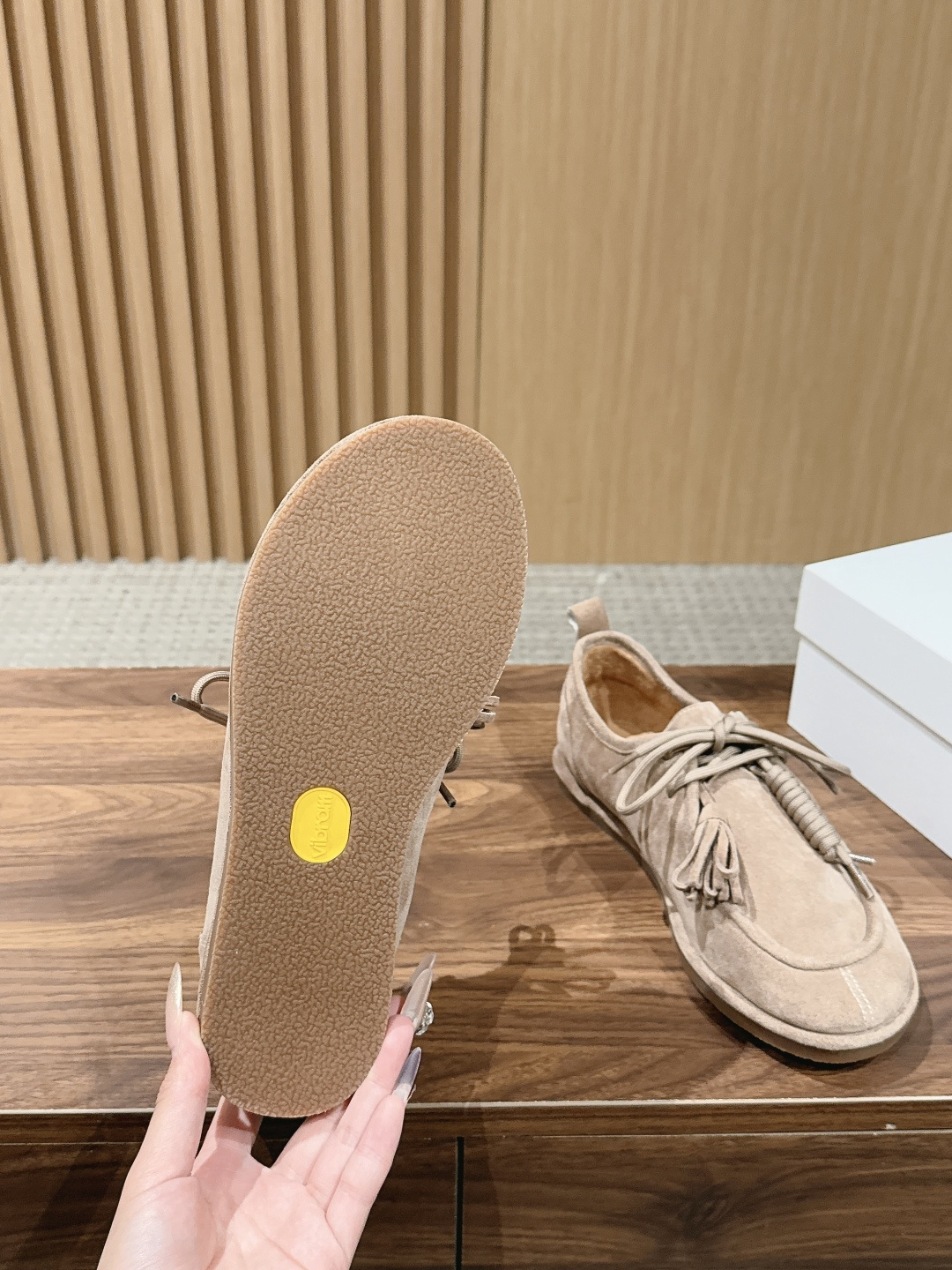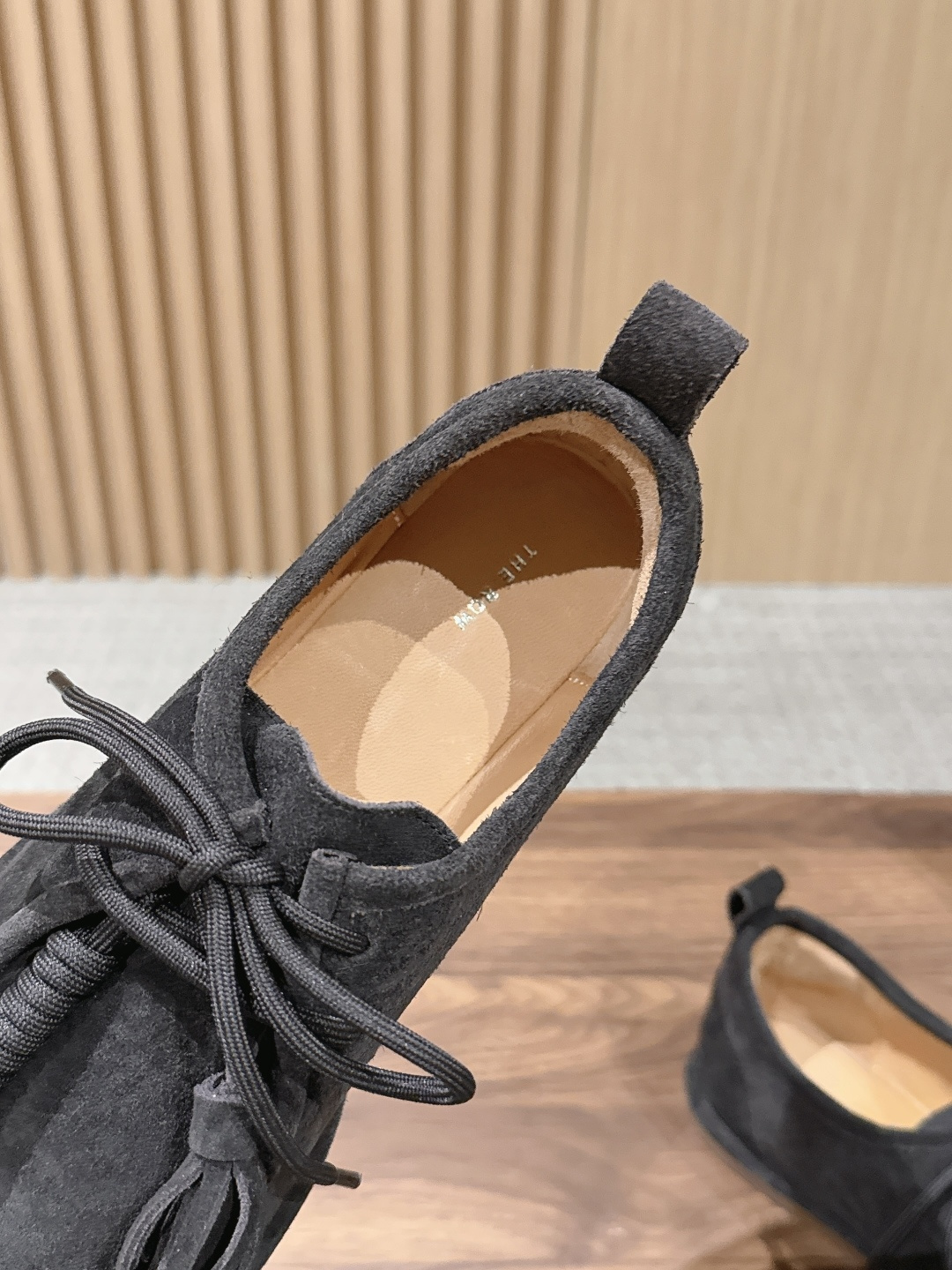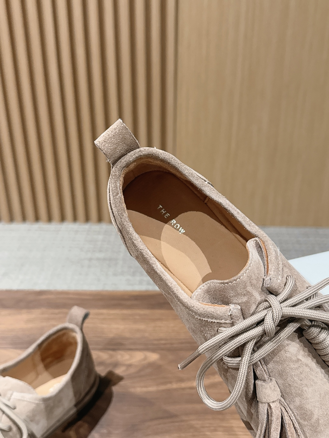 The Row新款系带流苏休闲袋鼠鞋 超级百搭,简直是衣橱里的万能钥匙,什么风格的衣服都能轻松Hold住。这双鞋子的设计真的超级棒,特别轻盈感,穿在脚上丝毫不会显得笨重。它的线条圆滑流畅,就像是艺术家精心勾勒的轮廓,单是静静地看着,就已经能感受到那份由内而外散发出的优雅与美感。它带着一点点正统的气息,却又不失时尚与活力。 鞋头巧妙地采用了圆润的设计,能够完美贴合各种脚型,完全不会有挤脚的不适感,边缘一圈纯手工马克线精密缝合 ,既牢固又美观,可拆卸的个性编绳➕流苏装饰,复古而又别致,每一个结、每一个线头都处理得恰到好处,让人一看就能感受到那份用心和精致。不仅为鞋子增添了独特的辨识度,还让整体的穿搭瞬间变得不再单调,细节感满满 鞋面采用胎牛绒为原料,制作时先将牛皮制成皮革,再用棒磨光使其变软,进而让表面形成特定的细绒. 手感柔滑,给人温暖亲和之感,且磨砂起绒的一面绒,质感均匀顺滑,同时具有良好的透气性、支撑性与耐磨性,拉力好,皮纹细腻,能迅速调节自身温度,冬暖夏凉,还有天然抗异味和防火能力. 内里和垫脚部分,采用的是进口水染牛皮。这种牛皮啊,可不是市场上那种普普通通的牛皮能比的。它特别柔软,吸汗透气性能也是一流的好。你知道吗,它是经过了无化工涂饰的水染工艺处理的,这样一来,它的触感就变得更加丝滑、更加柔软了,简直就像婴儿那娇嫩的肌肤一样,让人一摸就爱不释手。 穿在脚上就像是走在云朵上一样柔软,它的好是肉眼就能看出来的,根本不需要你多加纠结。这样的好东西,遇到了可千万别错过哦! 鞋子360度怎么扭都没问题,单只鞋子的重量竟然只有325克,日常穿着率简直不要太高,不管是上班、约会还是逛街,它都是你的完美选择。 一整天穿下来,脚都不会觉得累或者不舒服,真的是把舒适度拿捏得死死的 模具橡胶大底,柔软又轻便,质感也是一流,它还特别的防滑耐磨,走在湿滑的地面上也不用担心会滑倒。脚感呢,也略带一点弹性,走路的时候特别舒服、不累脚。最重要的是,它还没有臭味、环保呢!这样的鞋子啊,遇到了可千万别错过哦! 面料:进口牛反绒 内里:垫脚进口水染牛皮 大底:模具橡胶大底