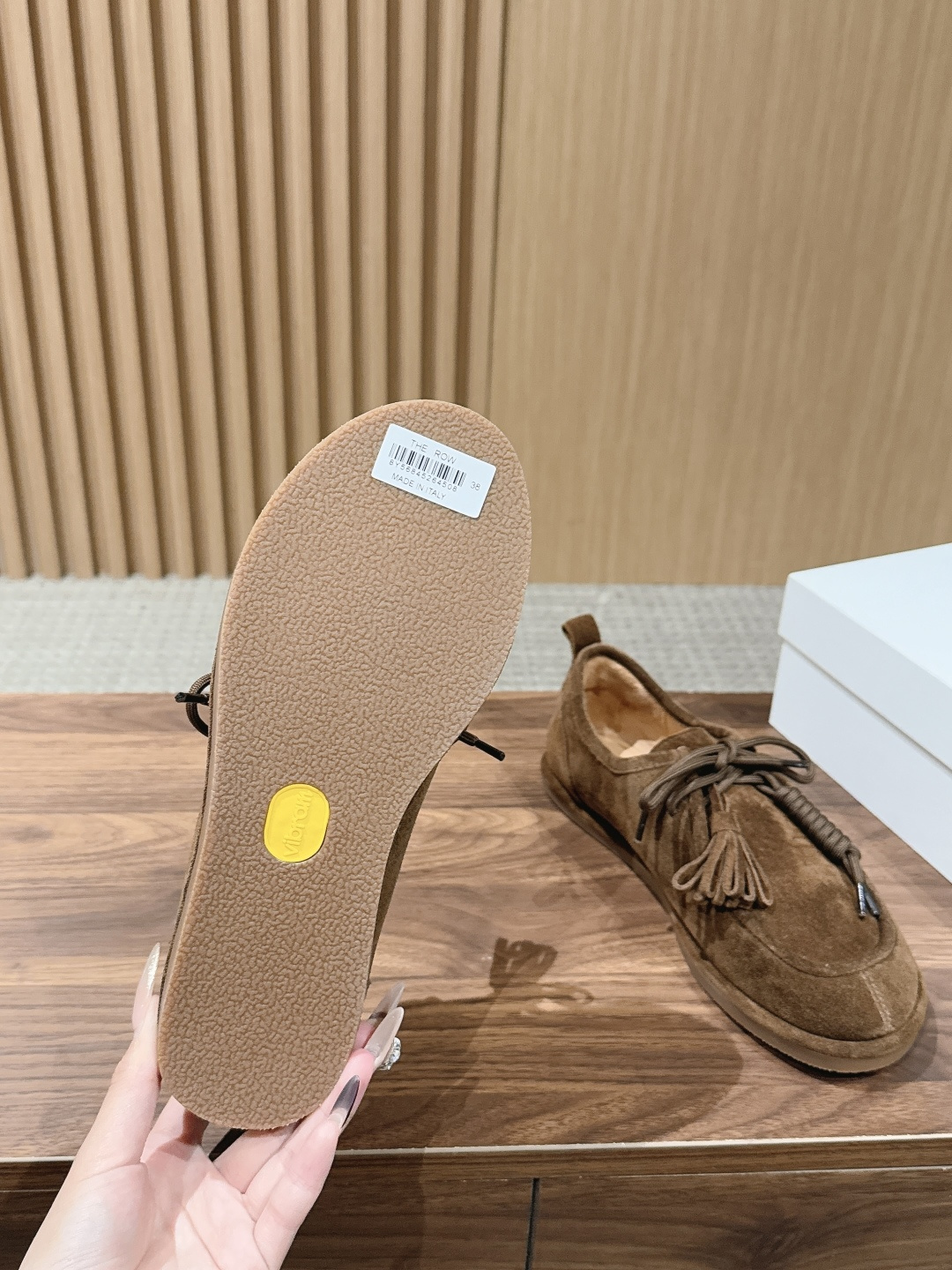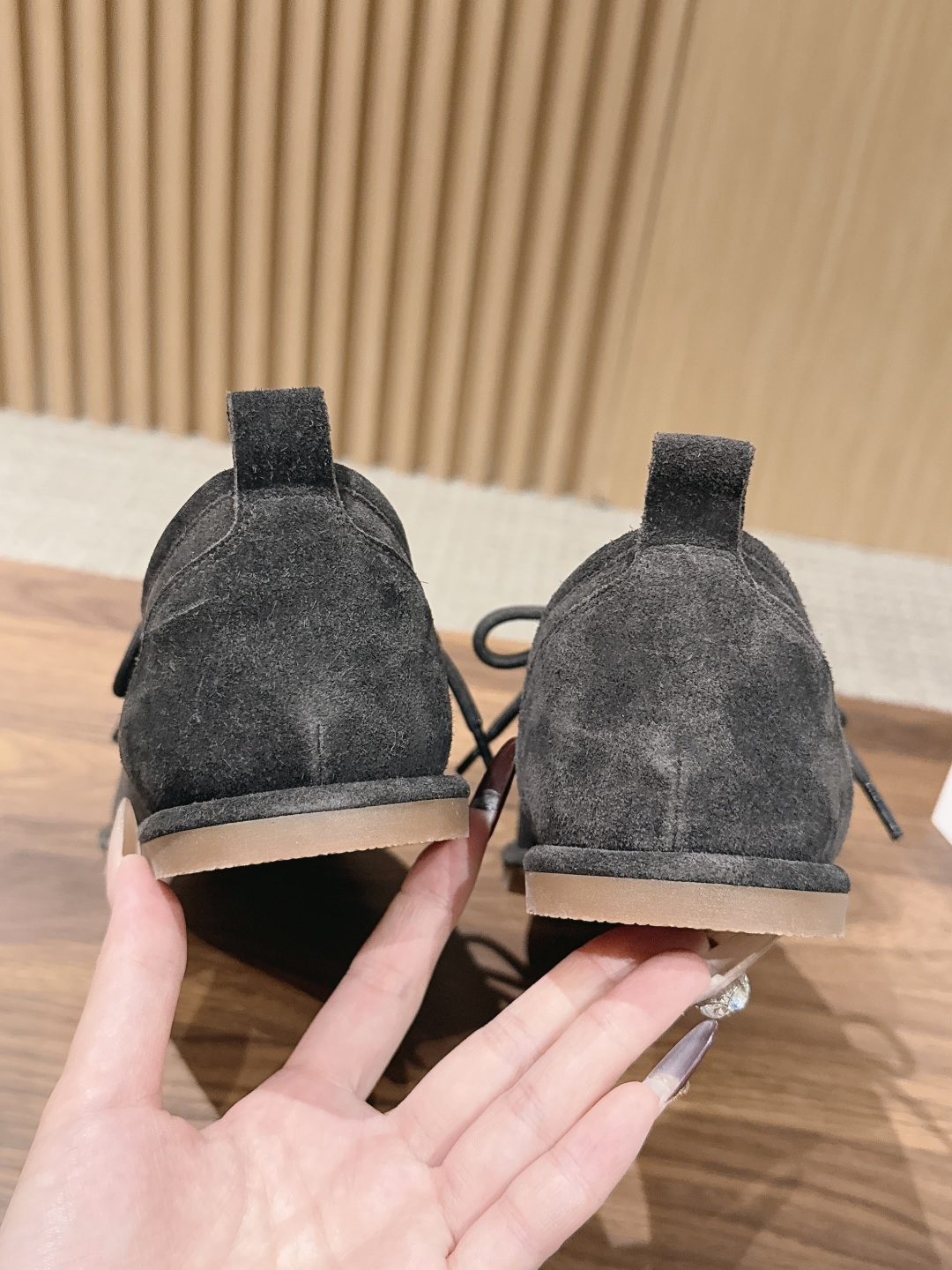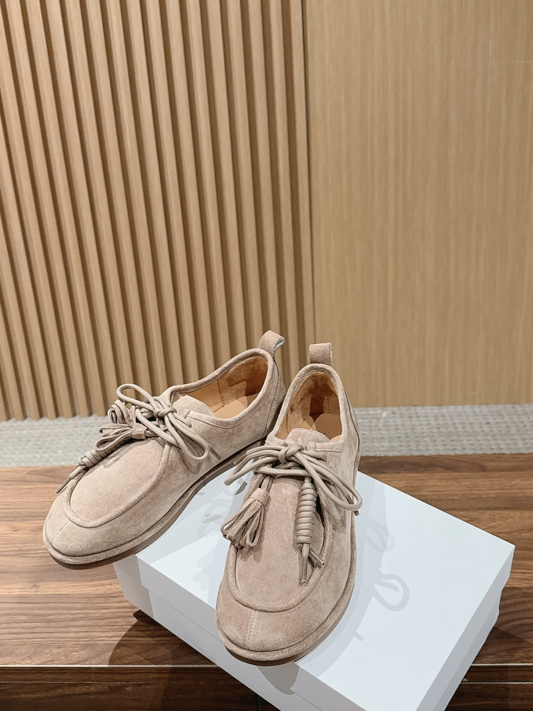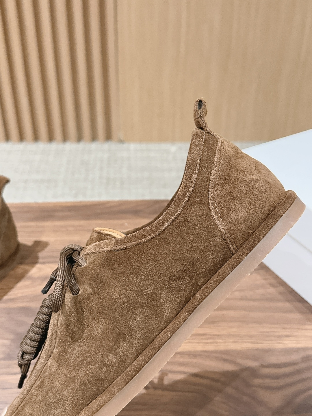 The Row新款系带流苏休闲袋鼠鞋 超级百搭,简直是衣橱里的万能钥匙,什么风格的衣服都能轻松Hold住。这双鞋子的设计真的超级棒,特别轻盈感,穿在脚上丝毫不会显得笨重。它的线条圆滑流畅,就像是艺术家精心勾勒的轮廓,单是静静地看着,就已经能感受到那份由内而外散发出的优雅与美感。它带着一点点正统的气息,却又不失时尚与活力。 鞋头巧妙地采用了圆润的设计,能够完美贴合各种脚型,完全不会有挤脚的不适感,边缘一圈纯手工马克线精密缝合 ,既牢固又美观,可拆卸的个性编绳➕流苏装饰,复古而又别致,每一个结、每一个线头都处理得恰到好处,让人一看就能感受到那份用心和精致。不仅为鞋子增添了独特的辨识度,还让整体的穿搭瞬间变得不再单调,细节感满满 鞋面采用胎牛绒为原料,制作时先将牛皮制成皮革,再用棒磨光使其变软,进而让表面形成特定的细绒. 手感柔滑,给人温暖亲和之感,且磨砂起绒的一面绒,质感均匀顺滑,同时具有良好的透气性、支撑性与耐磨性,拉力好,皮纹细腻,能迅速调节自身温度,冬暖夏凉,还有天然抗异味和防火能力. 内里和垫脚部分,采用的是进口水染牛皮。这种牛皮啊,可不是市场上那种普普通通的牛皮能比的。它特别柔软,吸汗透气性能也是一流的好。你知道吗,它是经过了无化工涂饰的水染工艺处理的,这样一来,它的触感就变得更加丝滑、更加柔软了,简直就像婴儿那娇嫩的肌肤一样,让人一摸就爱不释手。 穿在脚上就像是走在云朵上一样柔软,它的好是肉眼就能看出来的,根本不需要你多加纠结。这样的好东西,遇到了可千万别错过哦! 鞋子360度怎么扭都没问题,单只鞋子的重量竟然只有325克,日常穿着率简直不要太高,不管是上班、约会还是逛街,它都是你的完美选择。 一整天穿下来,脚都不会觉得累或者不舒服,真的是把舒适度拿捏得死死的 模具橡胶大底,柔软又轻便,质感也是一流,它还特别的防滑耐磨,走在湿滑的地面上也不用担心会滑倒。脚感呢,也略带一点弹性,走路的时候特别舒服、不累脚。最重要的是,它还没有臭味、环保呢!这样的鞋子啊,遇到了可千万别错过哦! 面料:进口牛反绒 内里:垫脚进口水染牛皮 大底:模具橡胶大底