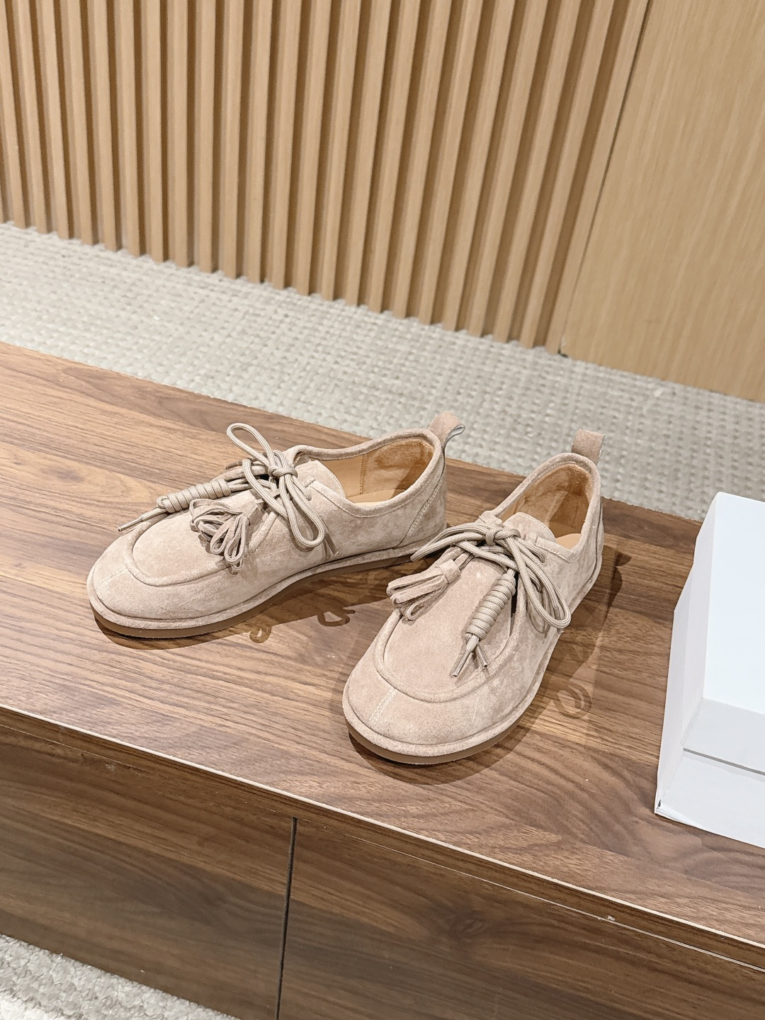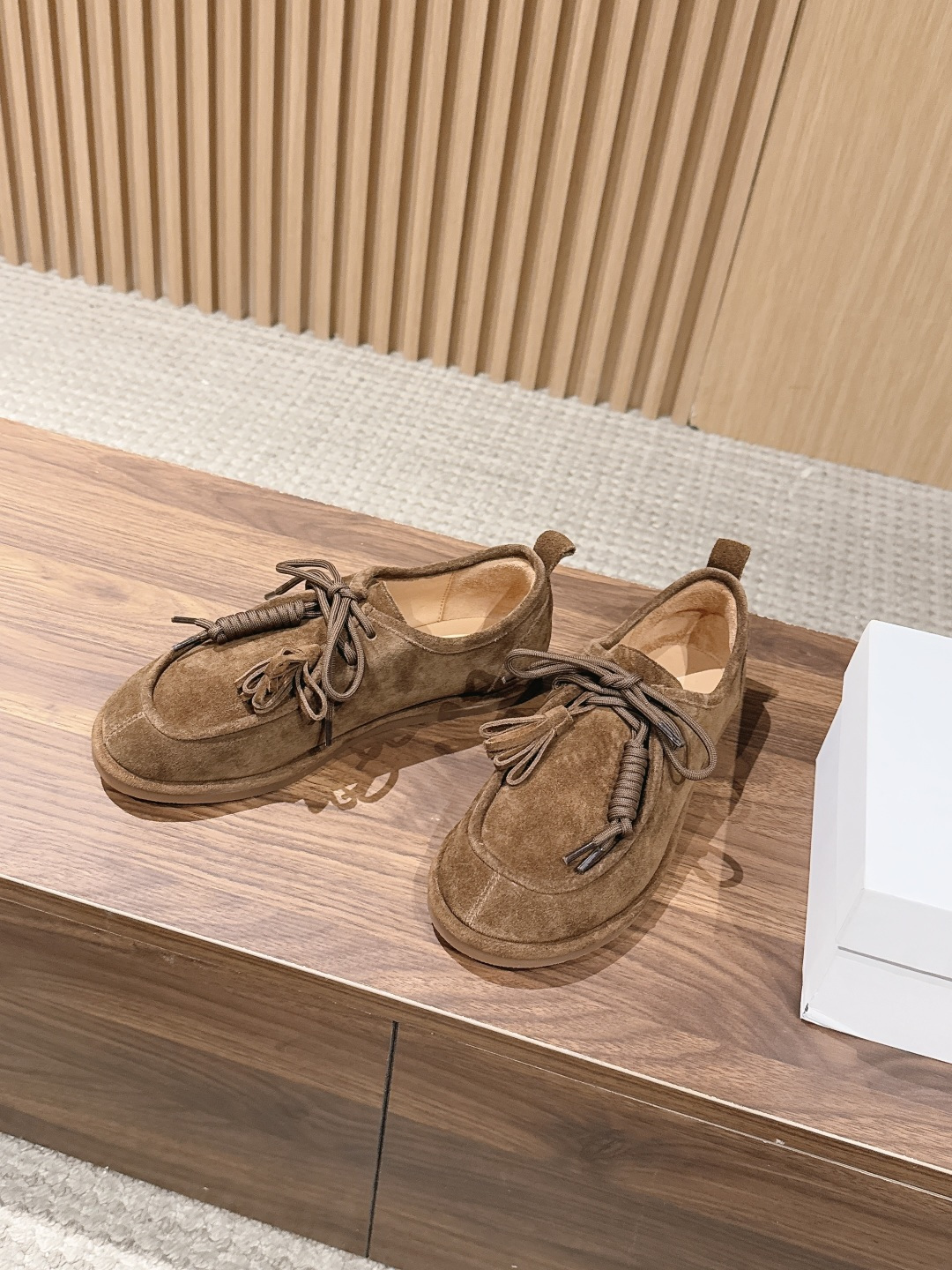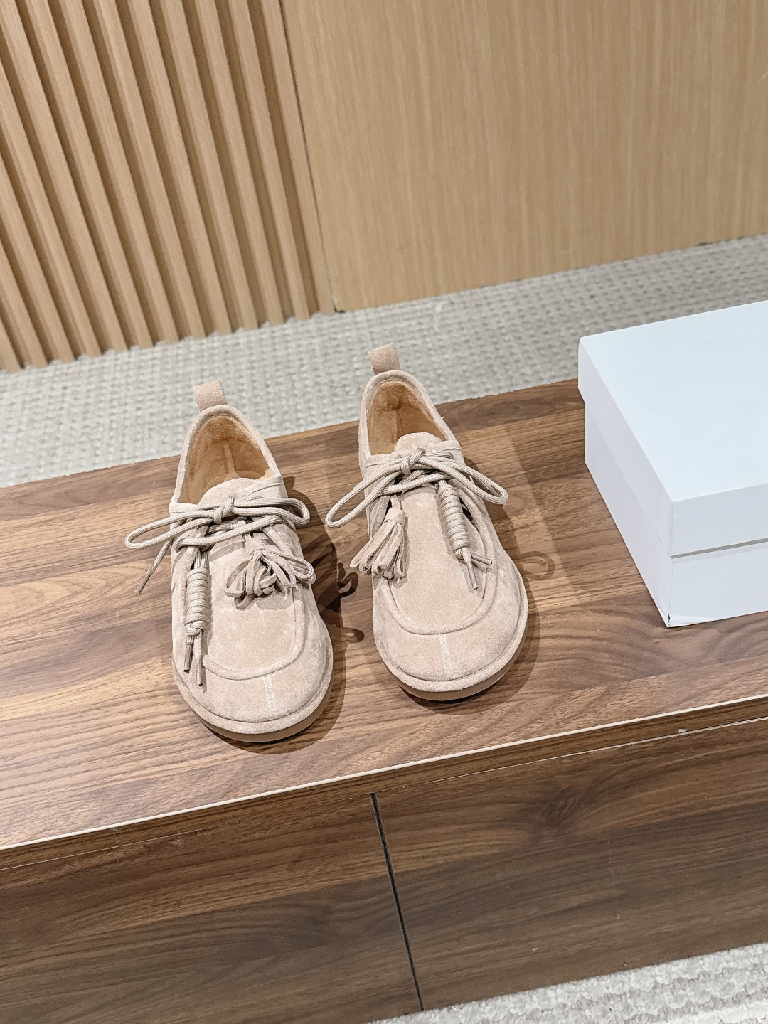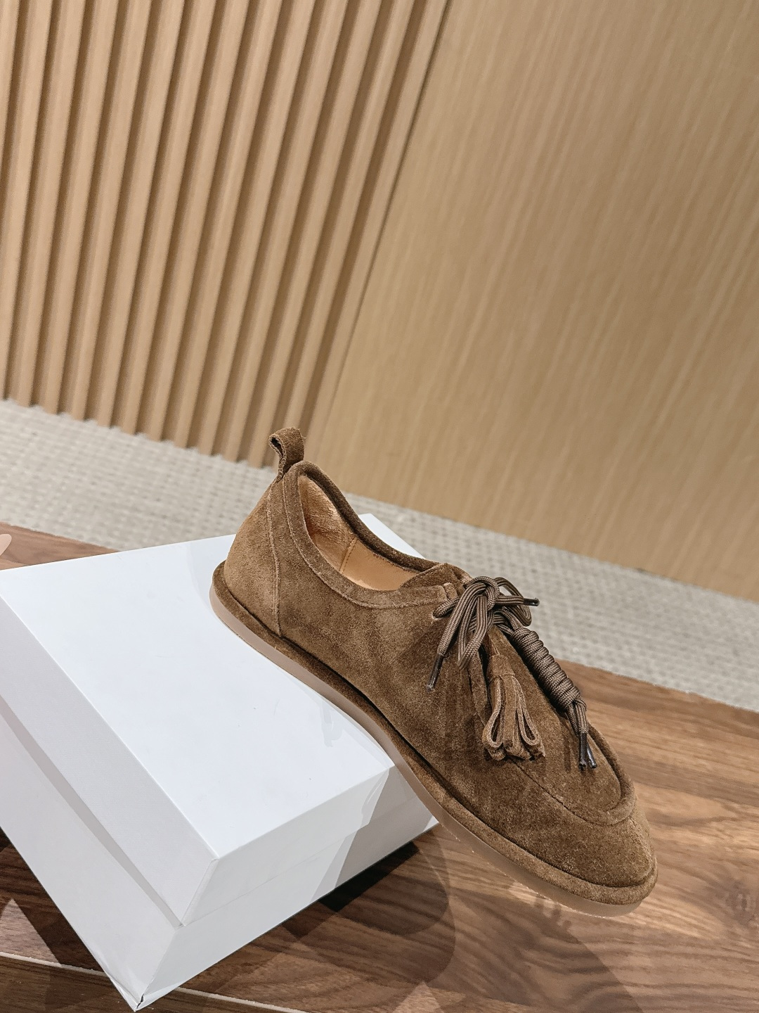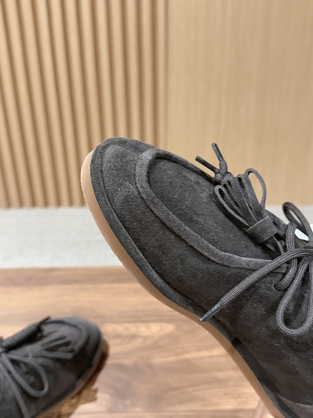 The Row新款系带流苏休闲袋鼠鞋 超级百搭,简直是衣橱里的万能钥匙,什么风格的衣服都能轻松Hold住。这双鞋子的设计真的超级棒,特别轻盈感,穿在脚上丝毫不会显得笨重。它的线条圆滑流畅,就像是艺术家精心勾勒的轮廓,单是静静地看着,就已经能感受到那份由内而外散发出的优雅与美感。它带着一点点正统的气息,却又不失时尚与活力。 鞋头巧妙地采用了圆润的设计,能够完美贴合各种脚型,完全不会有挤脚的不适感,边缘一圈纯手工马克线精密缝合 ,既牢固又美观,可拆卸的个性编绳➕流苏装饰,复古而又别致,每一个结、每一个线头都处理得恰到好处,让人一看就能感受到那份用心和精致。不仅为鞋子增添了独特的辨识度,还让整体的穿搭瞬间变得不再单调,细节感满满 鞋面采用胎牛绒为原料,制作时先将牛皮制成皮革,再用棒磨光使其变软,进而让表面形成特定的细绒. 手感柔滑,给人温暖亲和之感,且磨砂起绒的一面绒,质感均匀顺滑,同时具有良好的透气性、支撑性与耐磨性,拉力好,皮纹细腻,能迅速调节自身温度,冬暖夏凉,还有天然抗异味和防火能力. 内里和垫脚部分,采用的是进口水染牛皮。这种牛皮啊,可不是市场上那种普普通通的牛皮能比的。它特别柔软,吸汗透气性能也是一流的好。你知道吗,它是经过了无化工涂饰的水染工艺处理的,这样一来,它的触感就变得更加丝滑、更加柔软了,简直就像婴儿那娇嫩的肌肤一样,让人一摸就爱不释手。 穿在脚上就像是走在云朵上一样柔软,它的好是肉眼就能看出来的,根本不需要你多加纠结。这样的好东西,遇到了可千万别错过哦! 鞋子360度怎么扭都没问题,单只鞋子的重量竟然只有325克,日常穿着率简直不要太高,不管是上班、约会还是逛街,它都是你的完美选择。 一整天穿下来,脚都不会觉得累或者不舒服,真的是把舒适度拿捏得死死的 模具橡胶大底,柔软又轻便,质感也是一流,它还特别的防滑耐磨,走在湿滑的地面上也不用担心会滑倒。脚感呢,也略带一点弹性,走路的时候特别舒服、不累脚。最重要的是,它还没有臭味、环保呢!这样的鞋子啊,遇到了可千万别错过哦! 面料:进口牛反绒 内里:垫脚进口水染牛皮 大底:模具橡胶大底