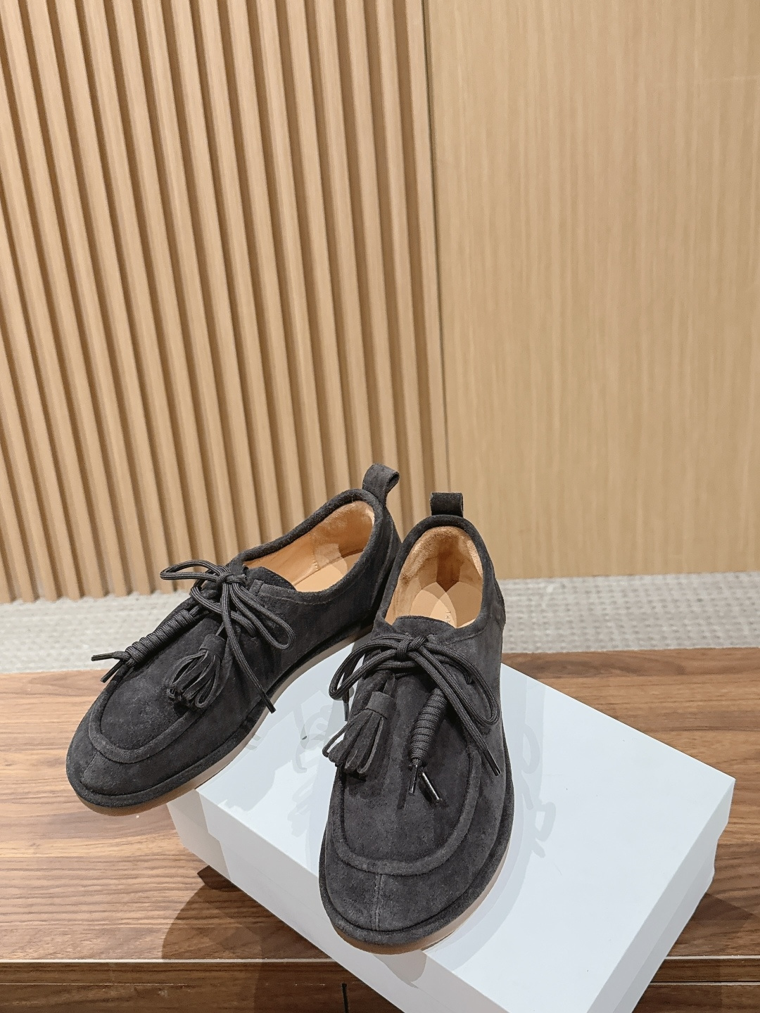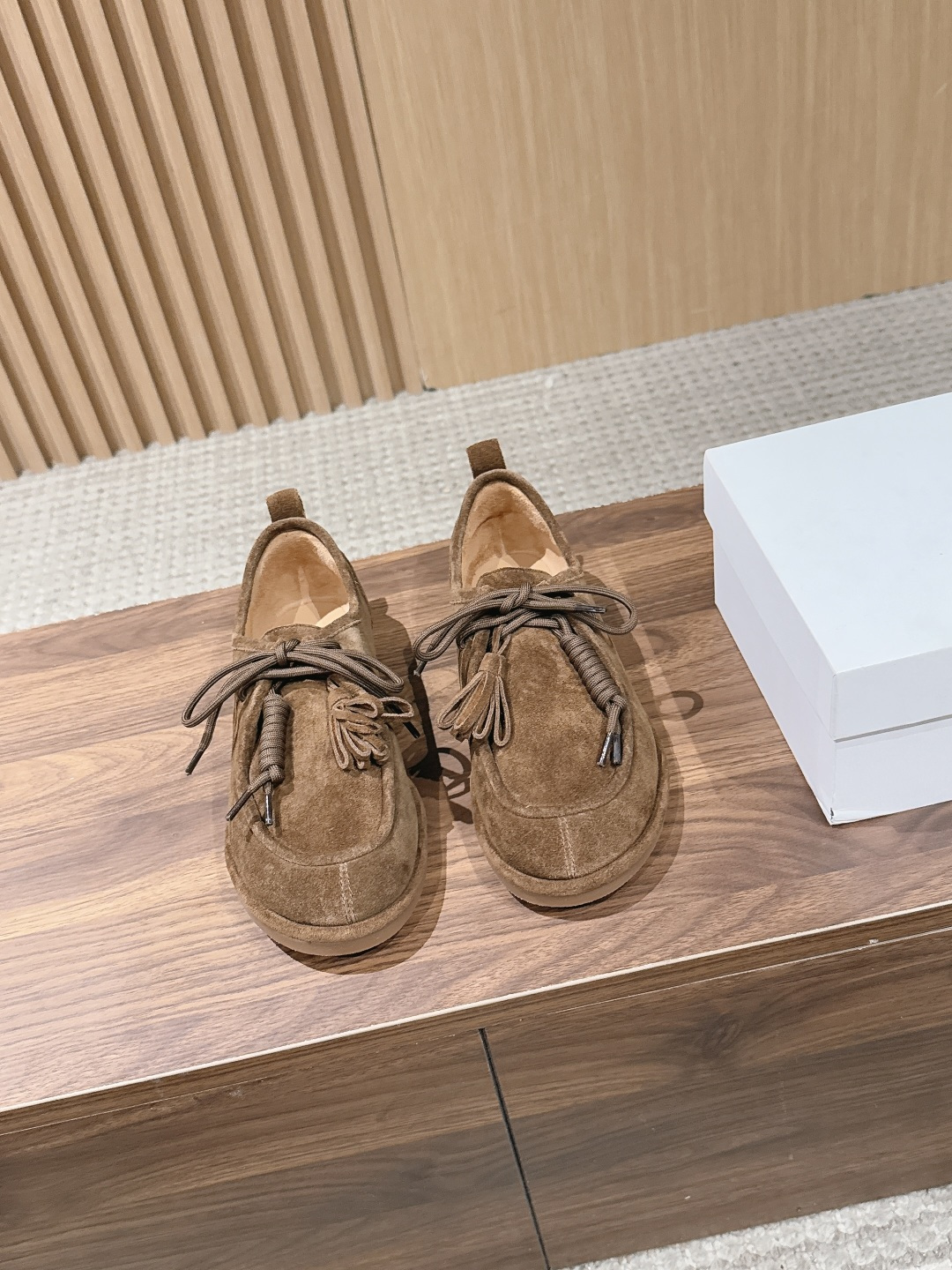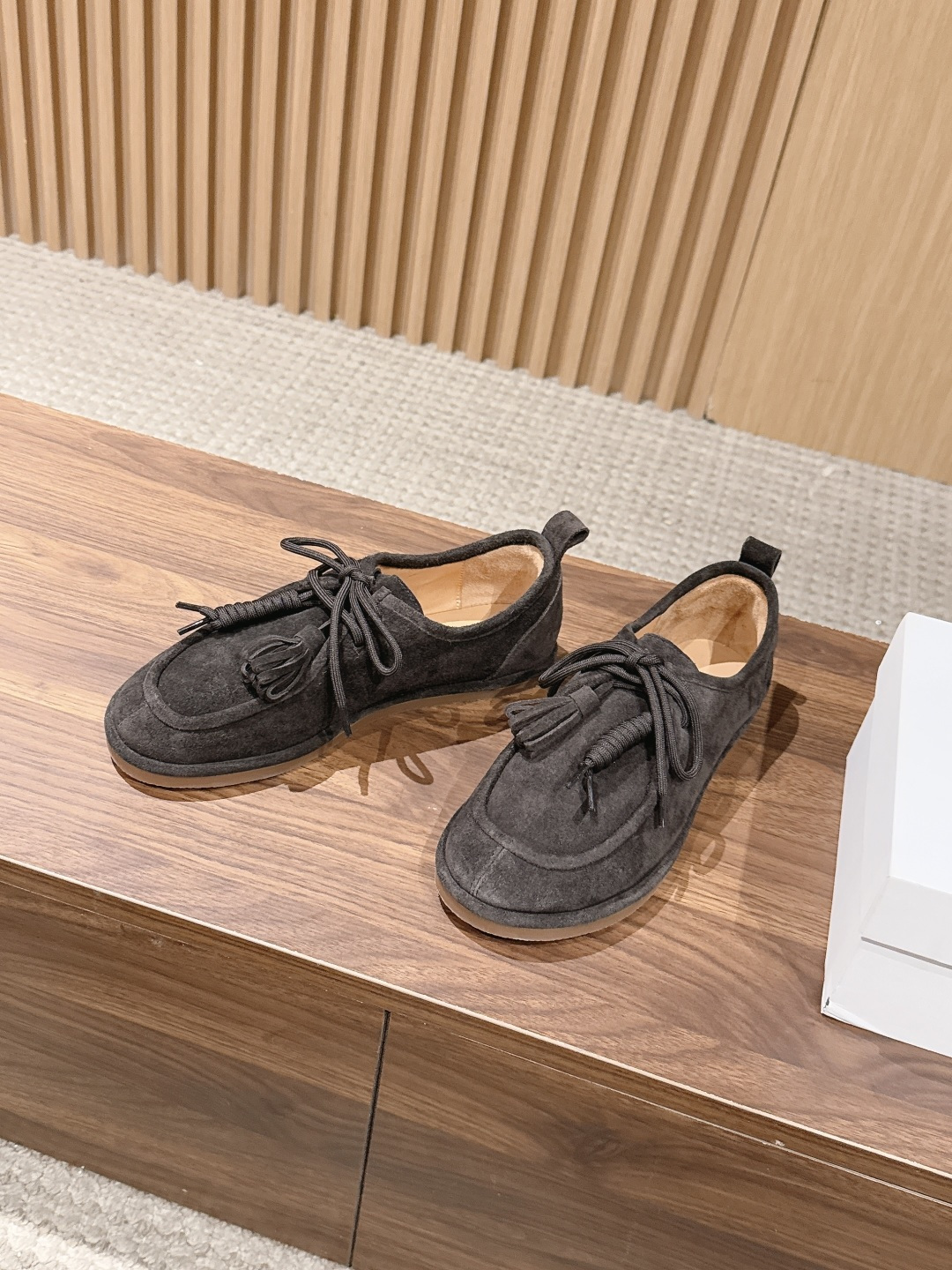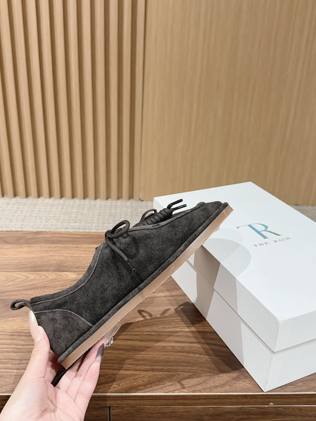 The Row新款系带流苏休闲袋鼠鞋 超级百搭,简直是衣橱里的万能钥匙,什么风格的衣服都能轻松Hold住。这双鞋子的设计真的超级棒,特别轻盈感,穿在脚上丝毫不会显得笨重。它的线条圆滑流畅,就像是艺术家精心勾勒的轮廓,单是静静地看着,就已经能感受到那份由内而外散发出的优雅与美感。它带着一点点正统的气息,却又不失时尚与活力。 鞋头巧妙地采用了圆润的设计,能够完美贴合各种脚型,完全不会有挤脚的不适感,边缘一圈纯手工马克线精密缝合 ,既牢固又美观,可拆卸的个性编绳➕流苏装饰,复古而又别致,每一个结、每一个线头都处理得恰到好处,让人一看就能感受到那份用心和精致。不仅为鞋子增添了独特的辨识度,还让整体的穿搭瞬间变得不再单调,细节感满满 鞋面采用胎牛绒为原料,制作时先将牛皮制成皮革,再用棒磨光使其变软,进而让表面形成特定的细绒. 手感柔滑,给人温暖亲和之感,且磨砂起绒的一面绒,质感均匀顺滑,同时具有良好的透气性、支撑性与耐磨性,拉力好,皮纹细腻,能迅速调节自身温度,冬暖夏凉,还有天然抗异味和防火能力. 内里和垫脚部分,采用的是进口水染牛皮。这种牛皮啊,可不是市场上那种普普通通的牛皮能比的。它特别柔软,吸汗透气性能也是一流的好。你知道吗,它是经过了无化工涂饰的水染工艺处理的,这样一来,它的触感就变得更加丝滑、更加柔软了,简直就像婴儿那娇嫩的肌肤一样,让人一摸就爱不释手。 穿在脚上就像是走在云朵上一样柔软,它的好是肉眼就能看出来的,根本不需要你多加纠结。这样的好东西,遇到了可千万别错过哦! 鞋子360度怎么扭都没问题,单只鞋子的重量竟然只有325克,日常穿着率简直不要太高,不管是上班、约会还是逛街,它都是你的完美选择。 一整天穿下来,脚都不会觉得累或者不舒服,真的是把舒适度拿捏得死死的 模具橡胶大底,柔软又轻便,质感也是一流,它还特别的防滑耐磨,走在湿滑的地面上也不用担心会滑倒。脚感呢,也略带一点弹性,走路的时候特别舒服、不累脚。最重要的是,它还没有臭味、环保呢!这样的鞋子啊,遇到了可千万别错过哦! 面料:进口牛反绒 内里:垫脚进口水染牛皮 大底:模具橡胶大底