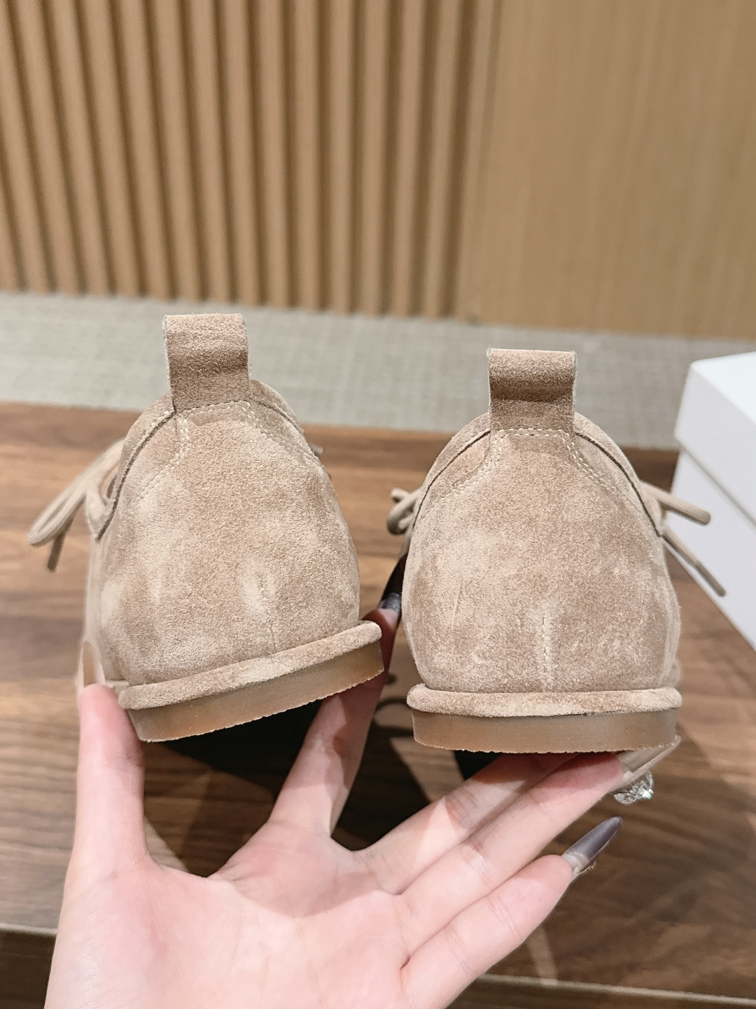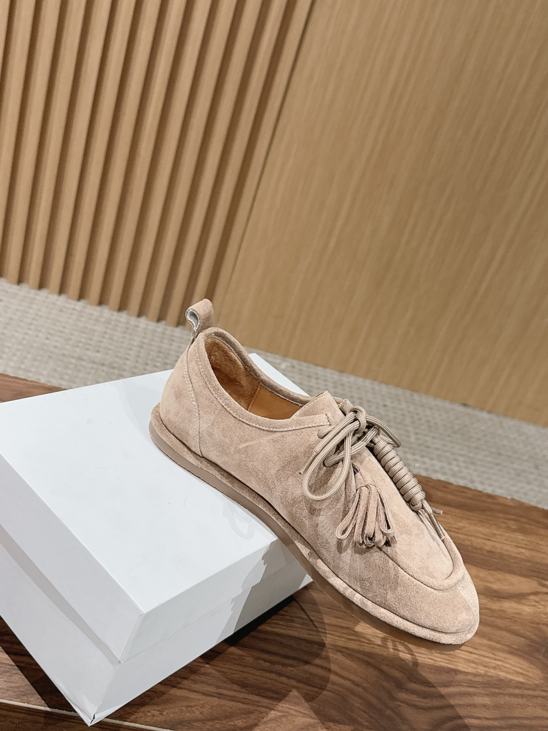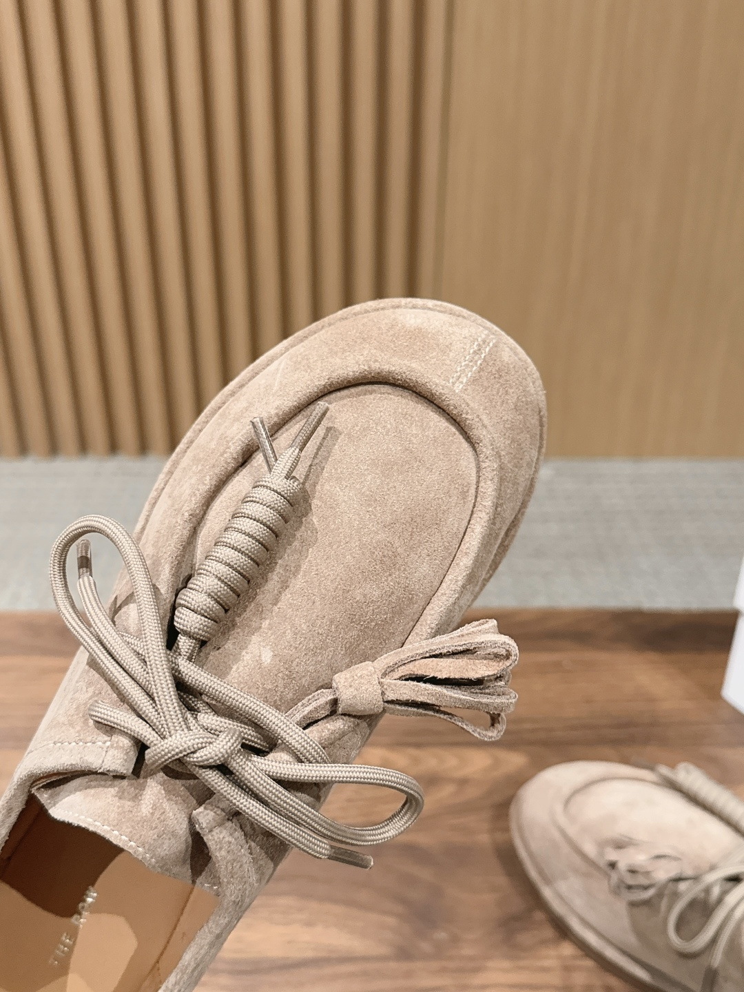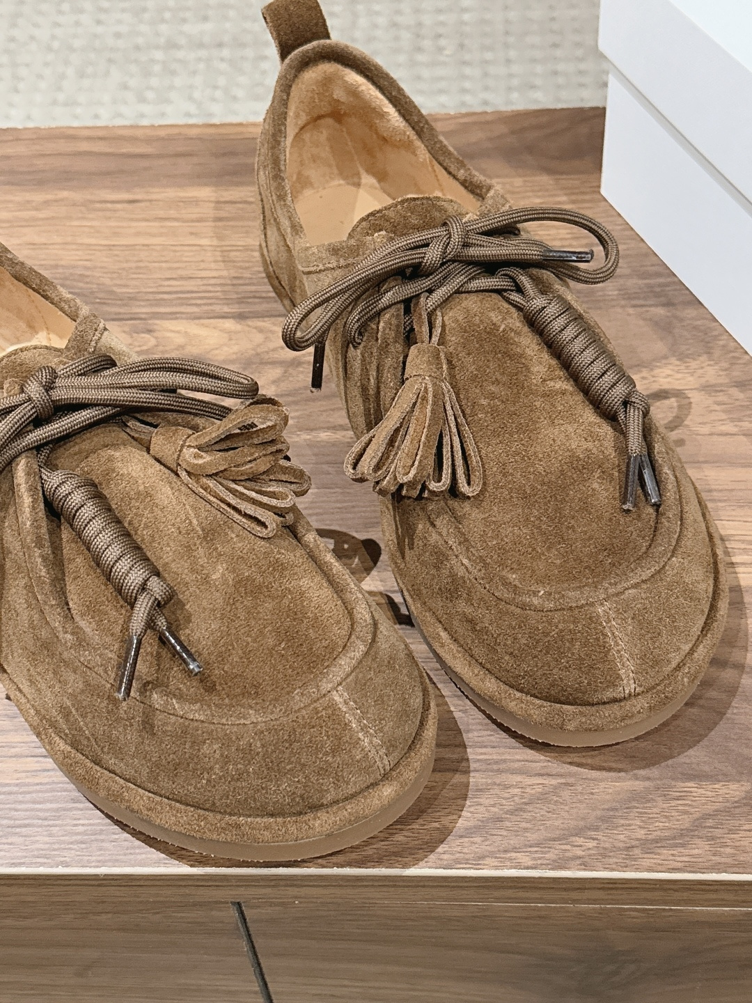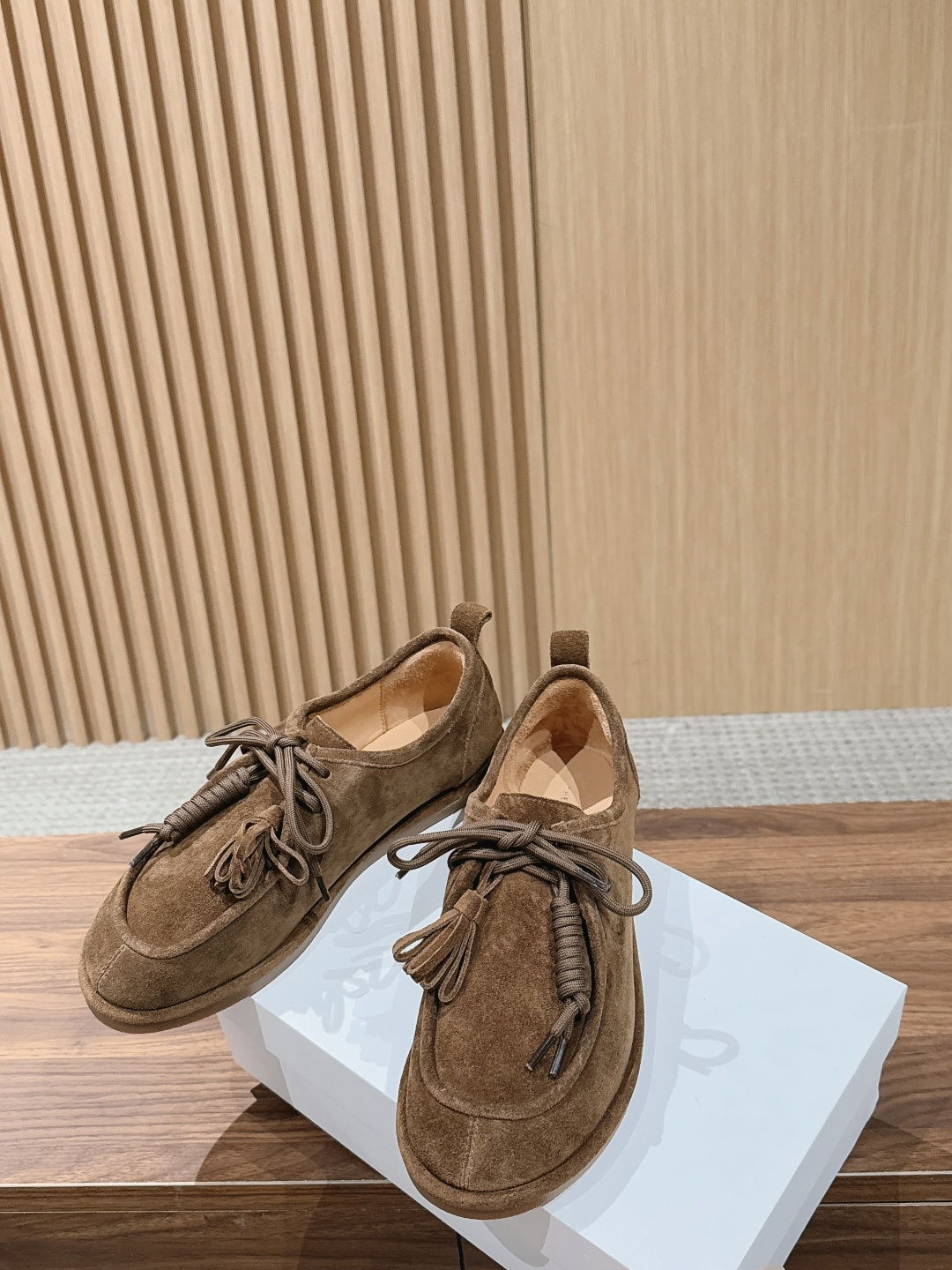The Row新款系带流苏休闲袋鼠鞋 超级百搭,简直是衣橱里的万能钥匙,什么风格的衣服都能轻松Hold住。这双鞋子的设计真的超级棒,特别轻盈感,穿在脚上丝毫不会显得笨重。它的线条圆滑流畅,就像是艺术家精心勾勒的轮廓,单是静静地看着,就已经能感受到那份由内而外散发出的优雅与美感。它带着一点点正统的气息,却又不失时尚与活力。 鞋头巧妙地采用了圆润的设计,能够完美贴合各种脚型,完全不会有挤脚的不适感,边缘一圈纯手工马克线精密缝合 ,既牢固又美观,可拆卸的个性编绳➕流苏装饰,复古而又别致,每一个结、每一个线头都处理得恰到好处,让人一看就能感受到那份用心和精致。不仅为鞋子增添了独特的辨识度,还让整体的穿搭瞬间变得不再单调,细节感满满 鞋面采用胎牛绒为原料,制作时先将牛皮制成皮革,再用棒磨光使其变软,进而让表面形成特定的细绒. 手感柔滑,给人温暖亲和之感,且磨砂起绒的一面绒,质感均匀顺滑,同时具有良好的透气性、支撑性与耐磨性,拉力好,皮纹细腻,能迅速调节自身温度,冬暖夏凉,还有天然抗异味和防火能力. 内里和垫脚部分,采用的是进口水染牛皮。这种牛皮啊,可不是市场上那种普普通通的牛皮能比的。它特别柔软,吸汗透气性能也是一流的好。你知道吗,它是经过了无化工涂饰的水染工艺处理的,这样一来,它的触感就变得更加丝滑、更加柔软了,简直就像婴儿那娇嫩的肌肤一样,让人一摸就爱不释手。 穿在脚上就像是走在云朵上一样柔软,它的好是肉眼就能看出来的,根本不需要你多加纠结。这样的好东西,遇到了可千万别错过哦! 鞋子360度怎么扭都没问题,单只鞋子的重量竟然只有325克,日常穿着率简直不要太高,不管是上班、约会还是逛街,它都是你的完美选择。 一整天穿下来,脚都不会觉得累或者不舒服,真的是把舒适度拿捏得死死的 模具橡胶大底,柔软又轻便,质感也是一流,它还特别的防滑耐磨,走在湿滑的地面上也不用担心会滑倒。脚感呢,也略带一点弹性,走路的时候特别舒服、不累脚。最重要的是,它还没有臭味、环保呢!这样的鞋子啊,遇到了可千万别错过哦! 面料:进口牛反绒 内里:垫脚进口水染牛皮 大底:模具橡胶大底
