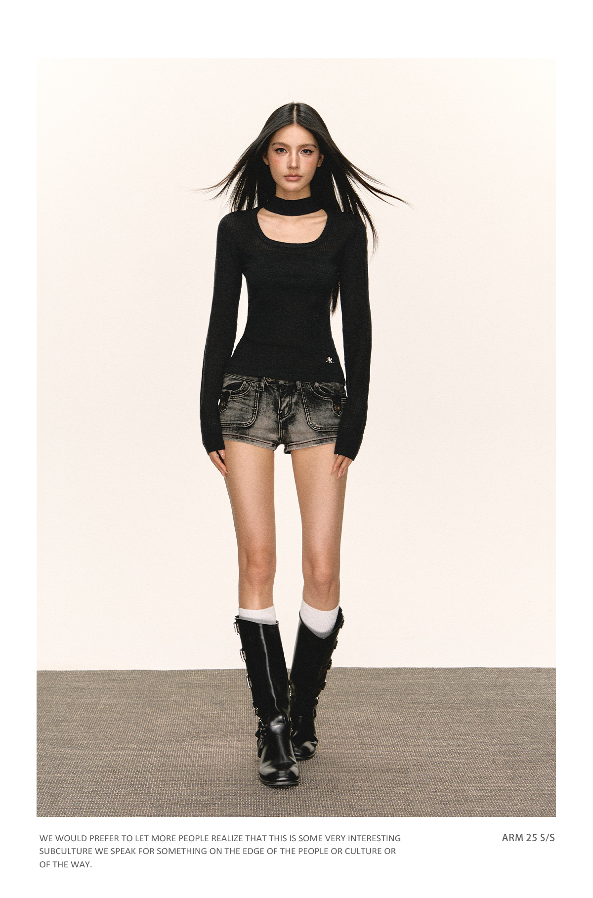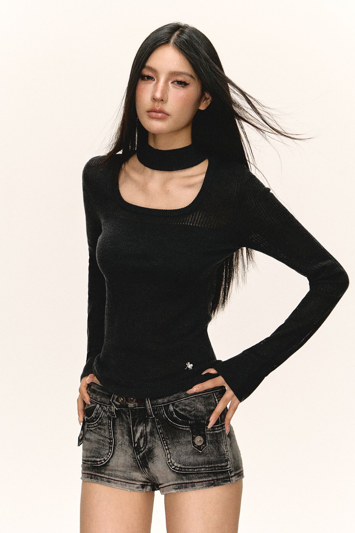 Ariseism 美式复古设计感黑色透款长袖针织衫女秋季新款修身上衣