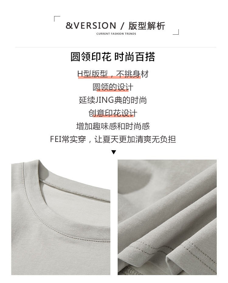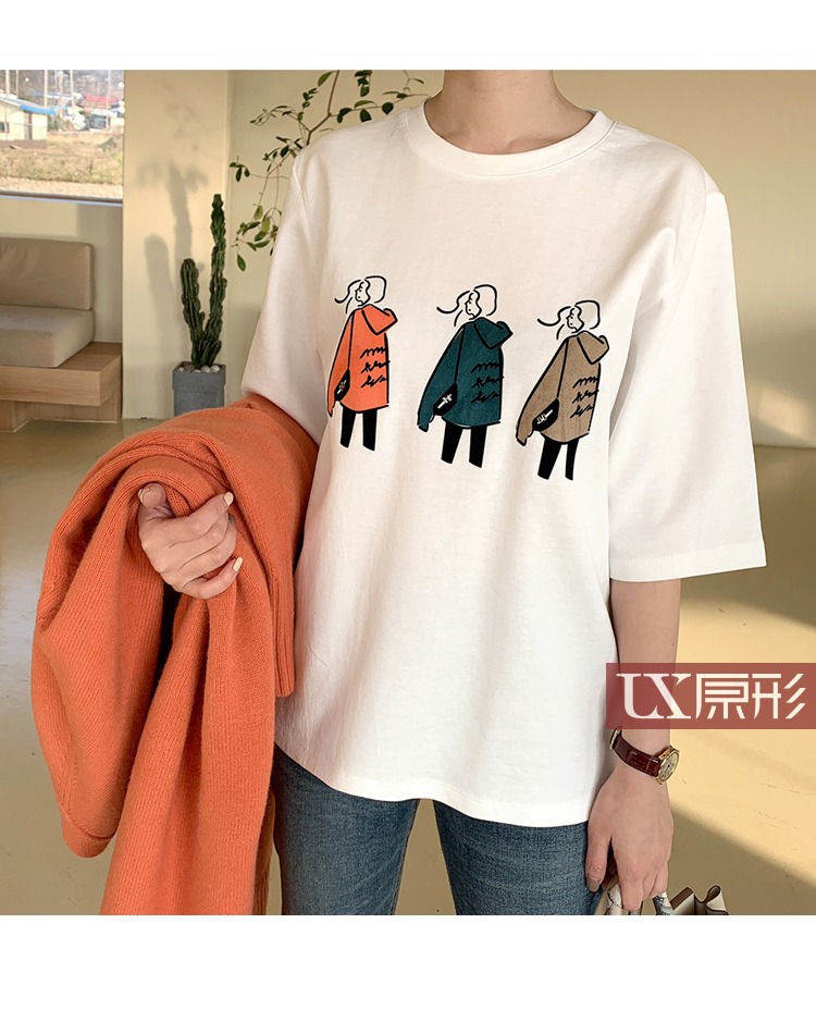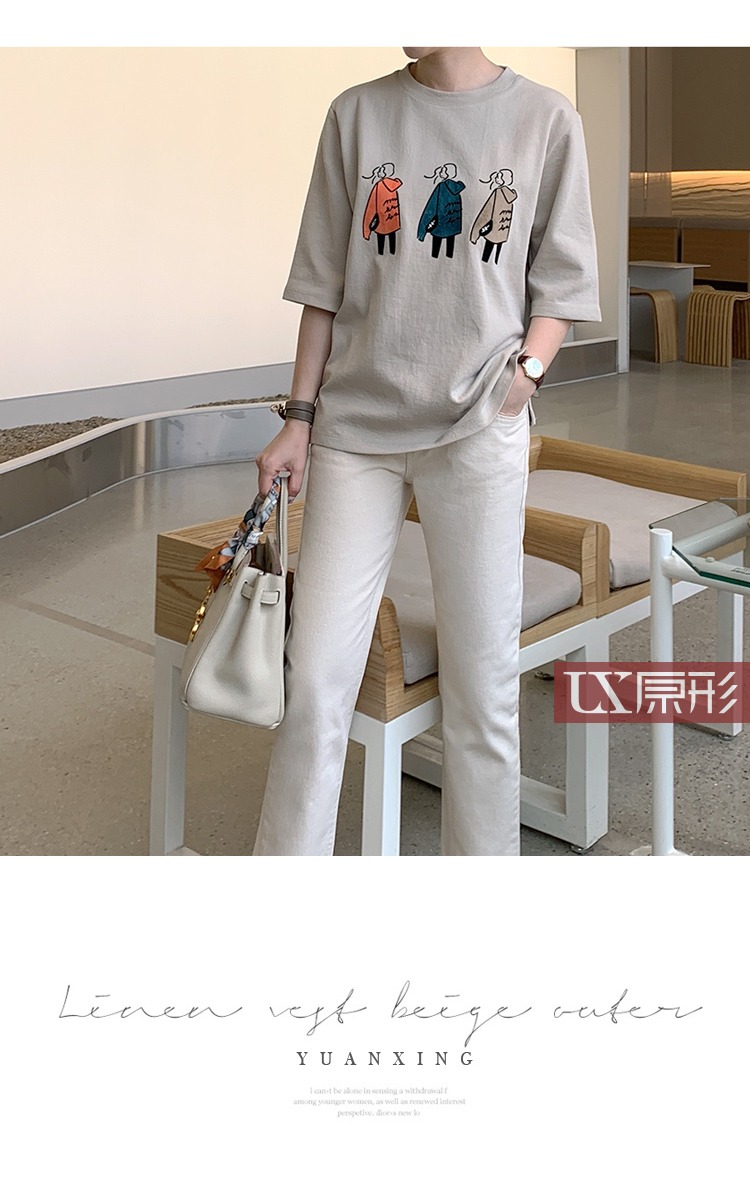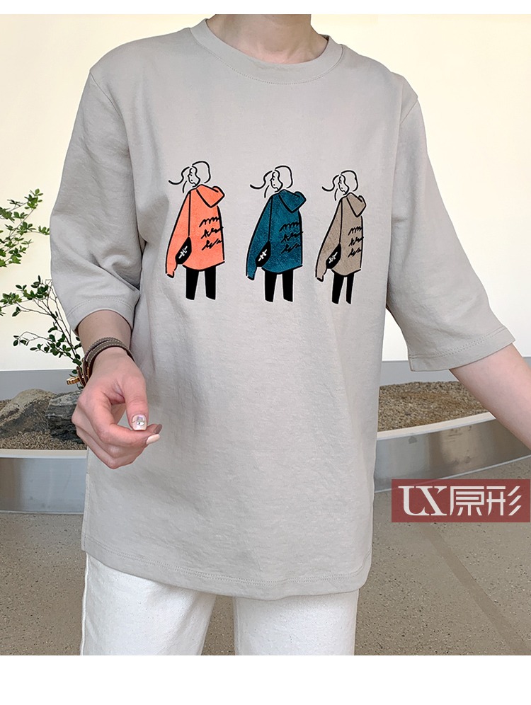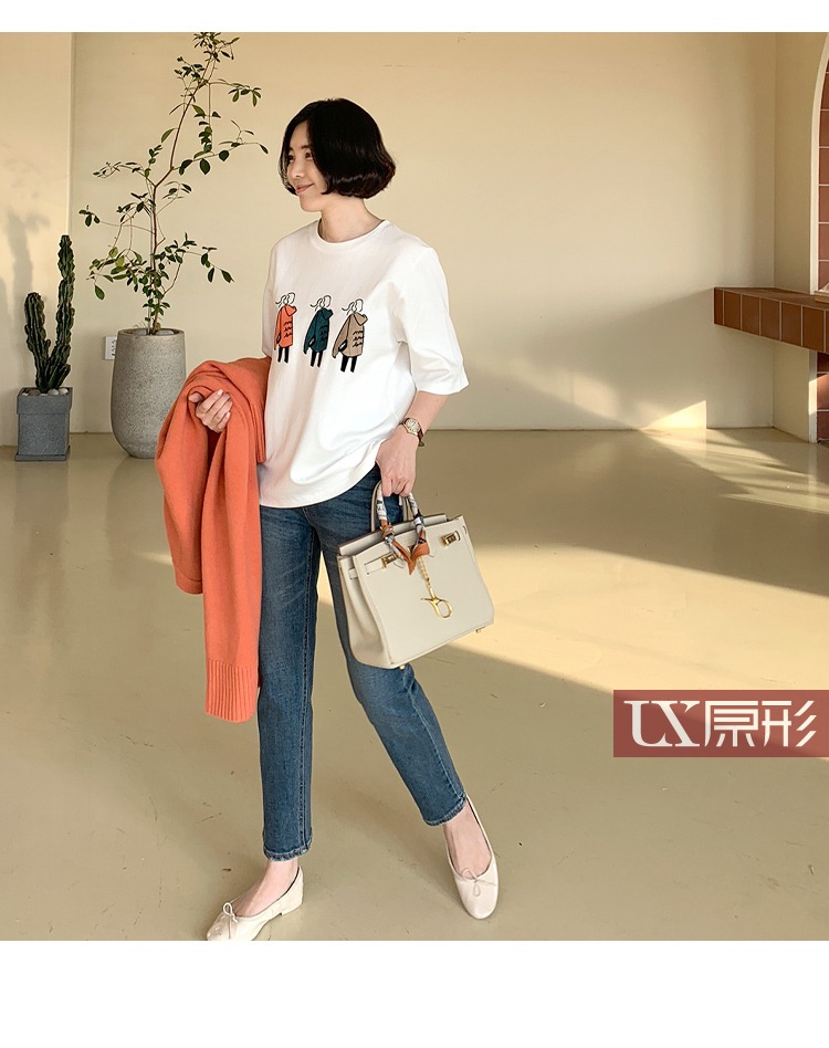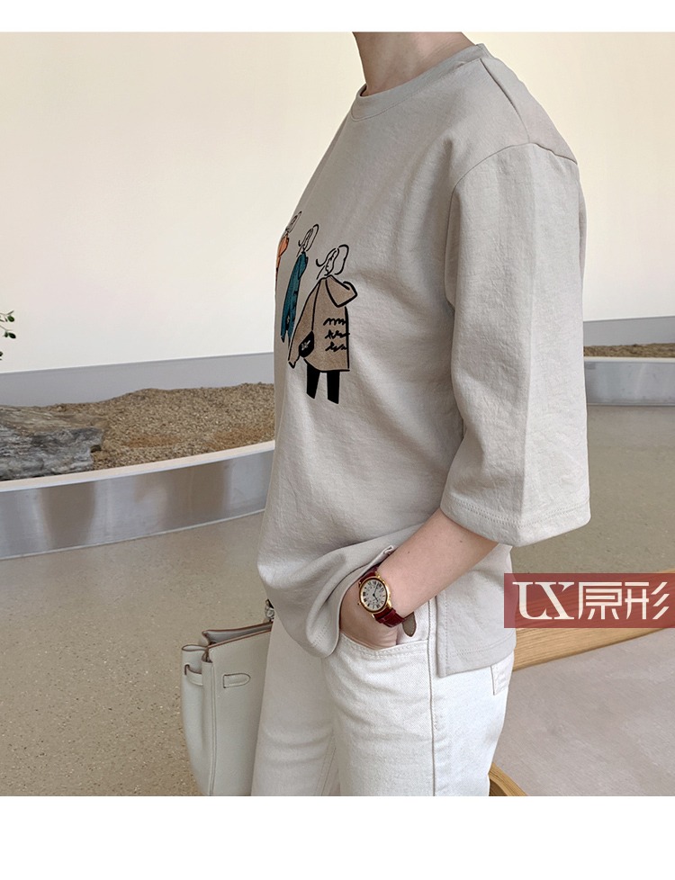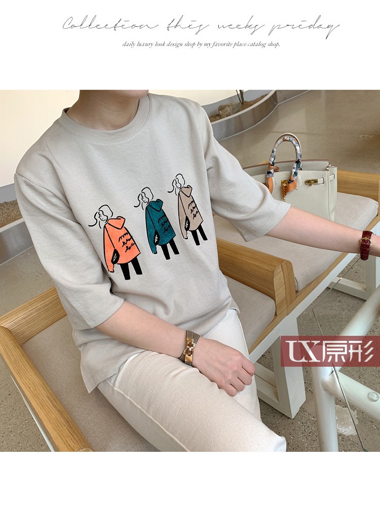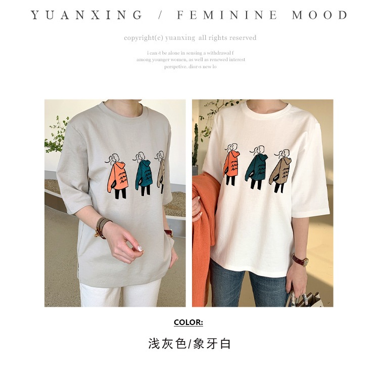 YX【现货7天】五分袖t恤女宽松ins潮2024夏装新款韩版圆领印花短袖体恤上衣