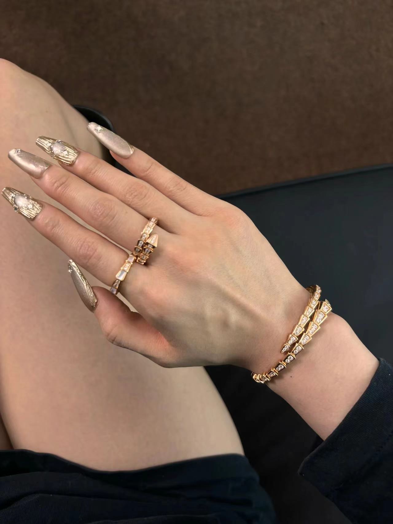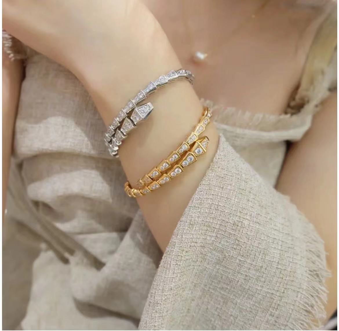 ernti手镯的魅力、诱惑和迷人的感性,以此向其灵兽致敬。此款珠宝雅致迷人,萦绕腕间,美丽的蛇鳞闪烁着极致动人的光芒,呈现灵蛇独有的蔓延弯曲。Sernti作品饰以迷人的钻石蛇鳞,搭配经典的网球手链设计,萦绕于腕间,尽显优雅灵动、感性魅惑。